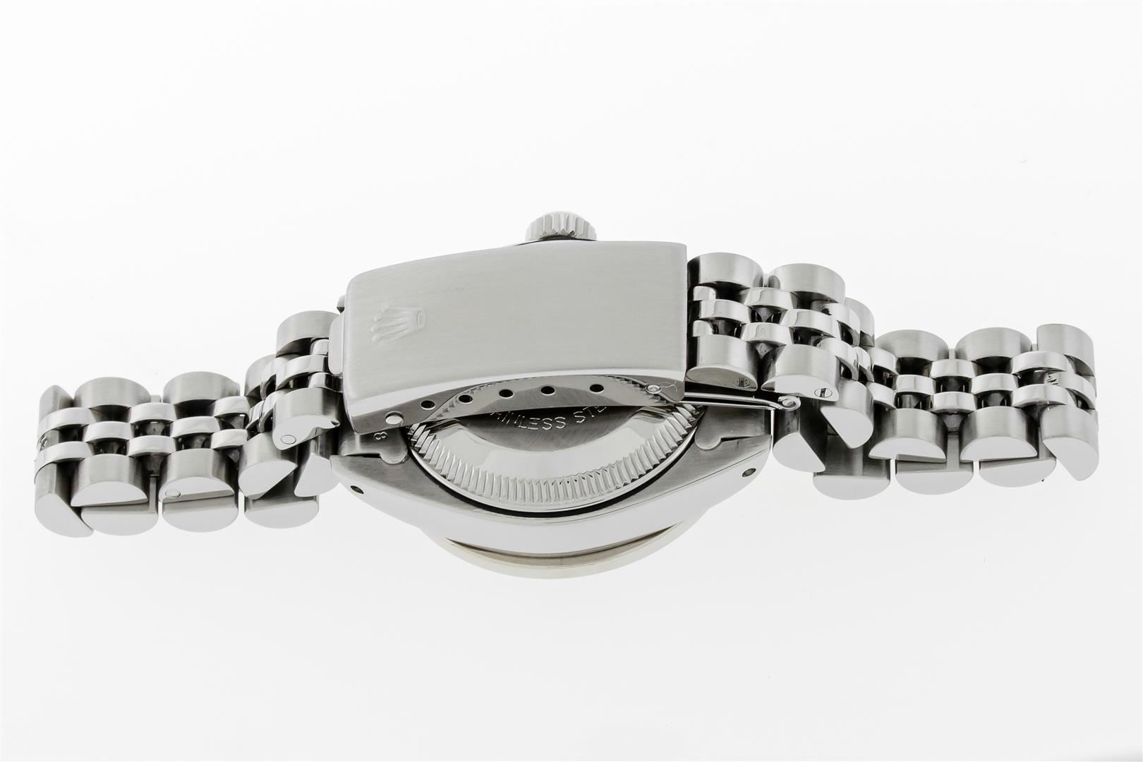 One Ladies Stainless Steel Rolex Datejust Polished Bright with Satin Finish, Serviced & Electronically Tested, Rolex Stainless Steel Case: 26mm, Rolex Stainless Steel Crown, Custom Bezel: New 18K White Gold Sapphire Channel Set Diamond Bezel, Diamond + Gem Count: 36 Diamonds + 4 Sapphires, Clarity: SI-VS, Color: G to H. Custom Crystal: New Sapphire With Magnified Date Window. Custom Hands: New Luminescent Hands. Rolex Movement: Automatic Winding Rolex Movement. Rolex Dial: Blue Roman Dial With Square Track. Date Window: 3 O'clock Position Date Display, Model: Datejust. Condition: G-6 Extra Fine. Rolex Bracelet: Stainless Steel Jubilee Band. Bright Polish & Satin Finish. 6.0 Inch Length, Adjustable. Standard Clasp, With Rolex Logo. This Pre Owned Watch Has Been Serviced Time Tested And Is In Excellent Condition It Is Free Of All Scratches And Dents.