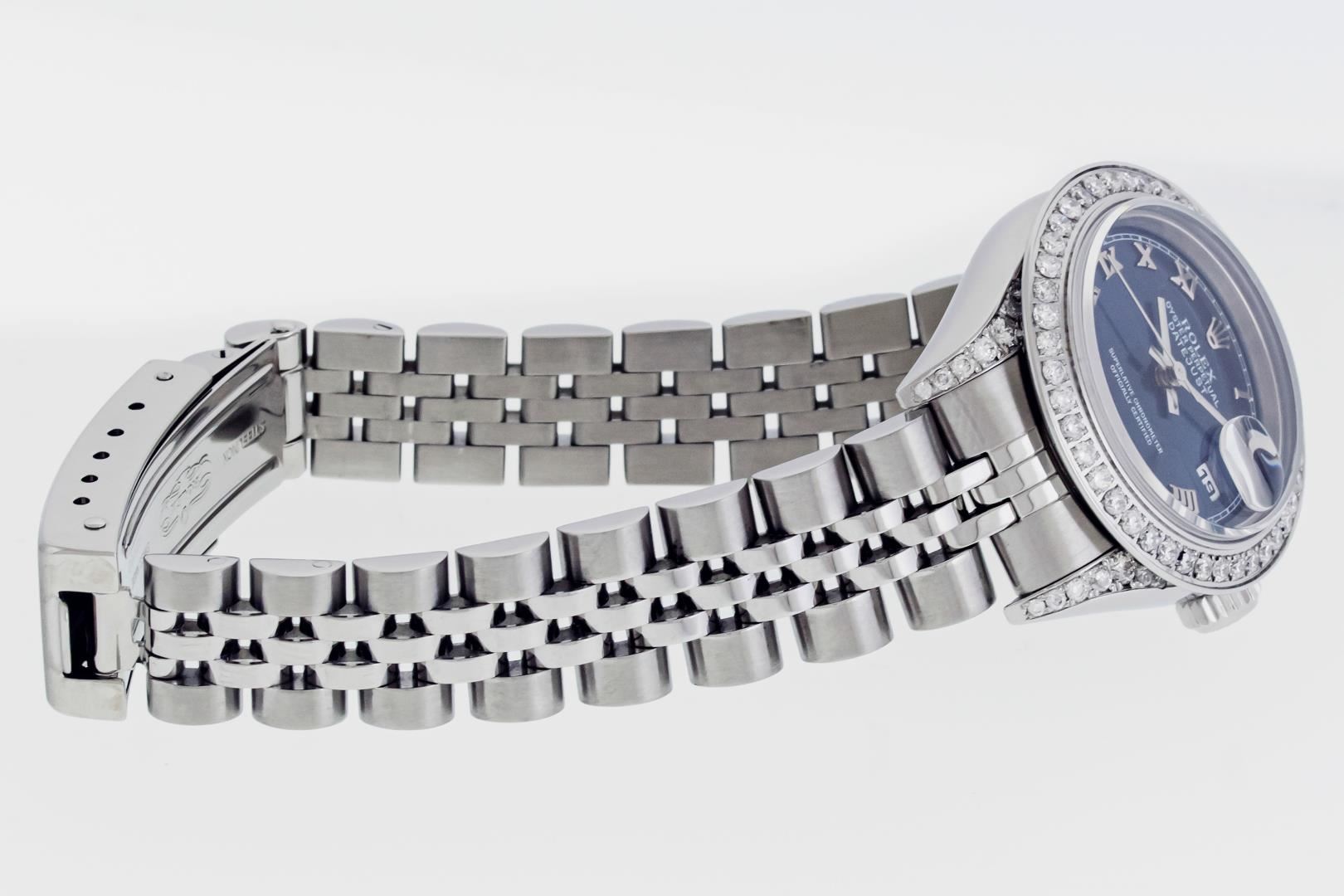 One Ladies Pre Owned Quickset Stainless Steel Rolex Datejust Polished Bright with Satin Finish, Serviced & Electronically Tested, Stainless Steel Case: 26mm, Custom Diamond Lugs: Added Diamonds On Lugs, Diamond Count: 24 Diamonds On Lugs. Rolex Stainless Steel Crown, Custom Bezel: New Stainless Steel Bead Set Diamond Bezel, Diamond Count: 40 Diamonds On Bezel. Custom Crystal: New Sapphire With Magnified Date Window. Custom Hands: New Hands. Rolex Movement: Automatic Winding Movement 2235. Rolex Dial: Blue With Roman Hour Markers & Square Track. Date Window: 3 O'Clock Position Date Display, Model: Quickset Datejust. Condition: G-6 Extra Fine. Rolex Bracelet: Stainless Steel Jubilee Band. Bright Polish & Satin Finish. 6.0 Inch Length, Adjustable. Standard Clasp, With Rolex Logo. This Watch Has Been Serviced Time Tested And Is In Excellent Condition It Is Free Of All Scratches And Dents.