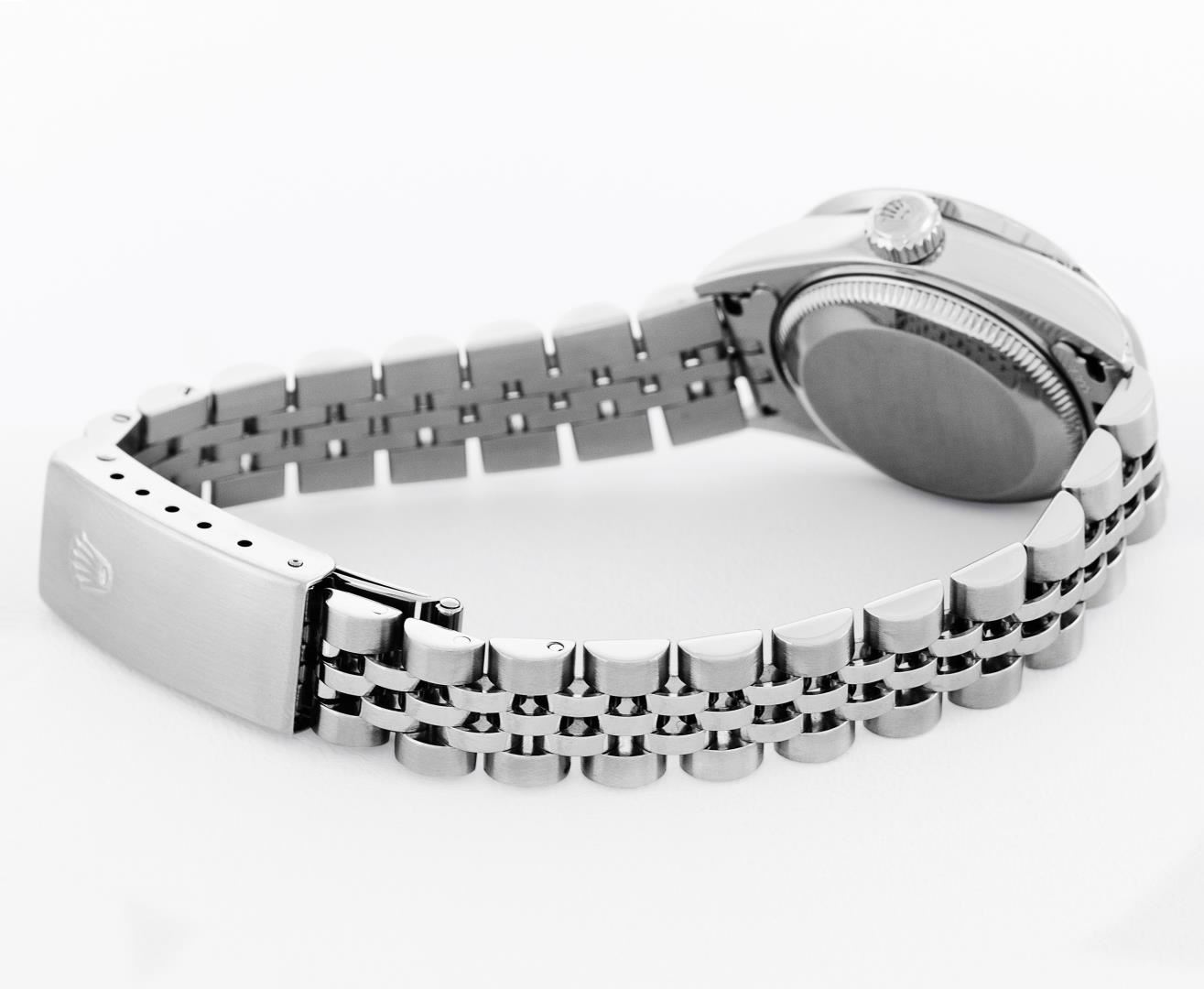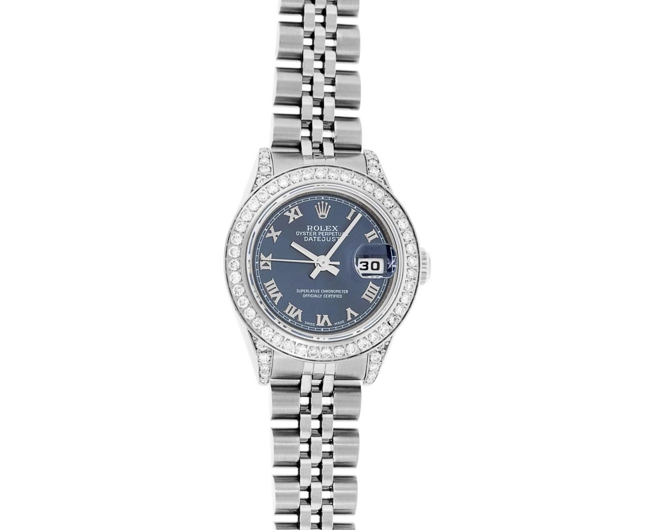 One Ladies Pre Owned Quickset Stainless Steel Rolex Datejust Polished Bright with Satin Finish, Serviced & Electronically Tested, Rolex Stainless Steel Case: 26mm, Custom Diamond Lugs: Added Diamonds On Lugs, Diamond Count: 24 Diamonds On Bezel, Color: G To H, Clarity: SI-VS. Rolex Stainless Steel Crown, Custom Bezel: New Stainless Steel Beadset Diamond Bezel, Stone Count: 40 Diamonds On Bezel, Diamond Color: G To H, Clarity: SI-VS. Custom Crystal: New Sapphire With Magnified Date Window. Custom Hands: New Hands. Rolex Movement: Quickset Automatic Winding Movement 2235. Rolex Dial: Blue Roman Dial With Square Track. Date Window: 3 O'Clock Position Date Display, Model: Sapphire Quickset Datejust. Condition: G-6 Extra Fine. Rolex Bracelet: Stainless Steel Jubilee Band. Bright Polish & Satin Finish. 6.0 Inch Length, Adjustable. Standard Clasp, With Rolex Logo. This Watch Has Been Serviced Time Tested And Is In Excellent Condition It Is Free Of All Scratches And Dents.