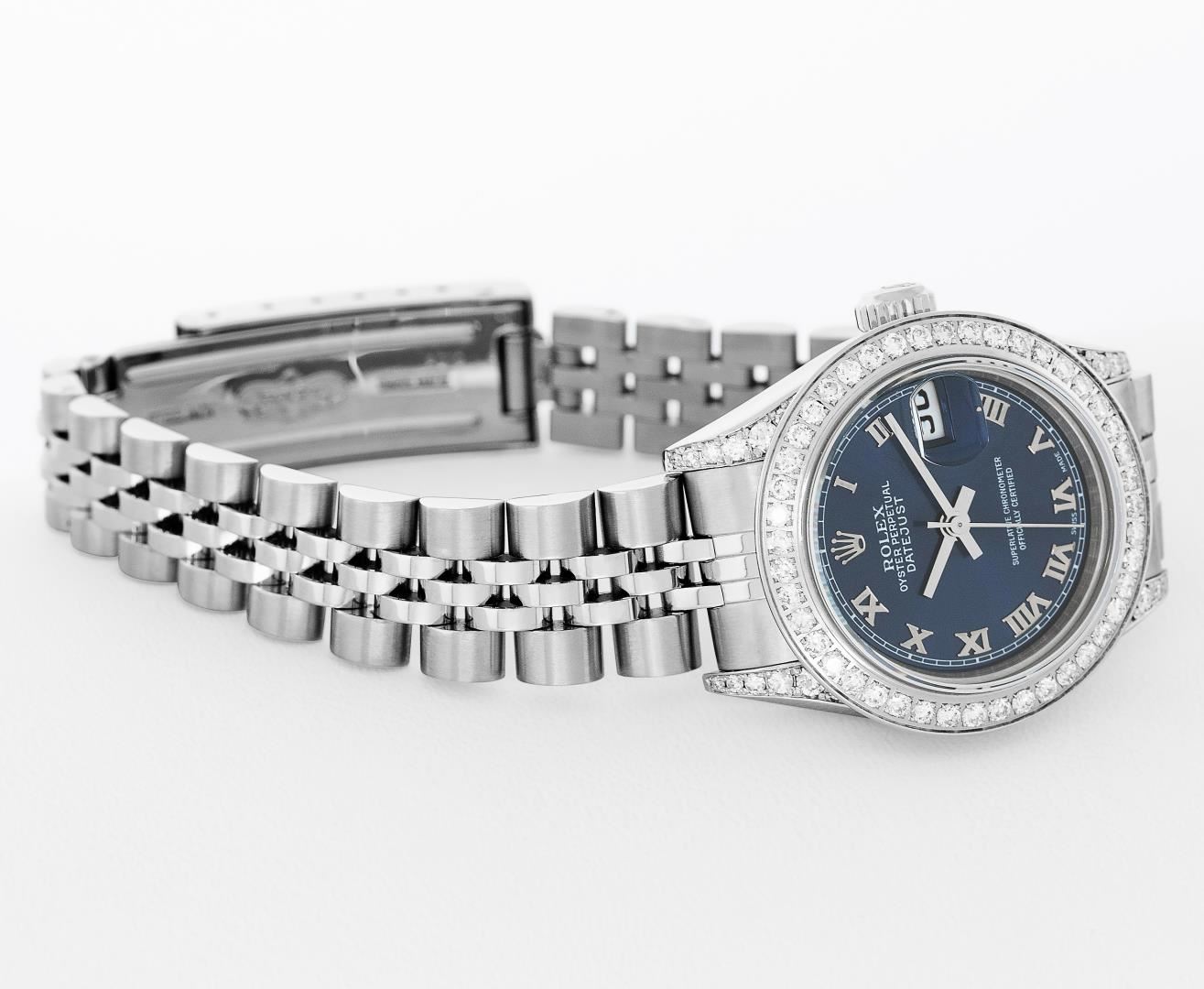 One Ladies Pre Owned Quickset Stainless Steel Rolex Datejust Polished Bright with Satin Finish, Serviced & Electronically Tested, Rolex Stainless Steel Case: 26mm, Custom Diamond Lugs: Added Diamonds On Lugs, Diamond Count: 24 Diamonds On Bezel, Color: G To H, Clarity: SI-VS. Rolex Stainless Steel Crown, Custom Bezel: New Stainless Steel Beadset Diamond Bezel, Stone Count: 40 Diamonds On Bezel, Diamond Color: G To H, Clarity: SI-VS. Custom Crystal: New Sapphire With Magnified Date Window. Custom Hands: New Hands. Rolex Movement: Quickset Automatic Winding Movement 2235. Rolex Dial: Blue Roman Dial With Square Track. Date Window: 3 O'Clock Position Date Display, Model: Sapphire Quickset Datejust. Condition: G-6 Extra Fine. Rolex Bracelet: Stainless Steel Jubilee Band. Bright Polish & Satin Finish. 6.0 Inch Length, Adjustable. Standard Clasp, With Rolex Logo. This Watch Has Been Serviced Time Tested And Is In Excellent Condition It Is Free Of All Scratches And Dents.