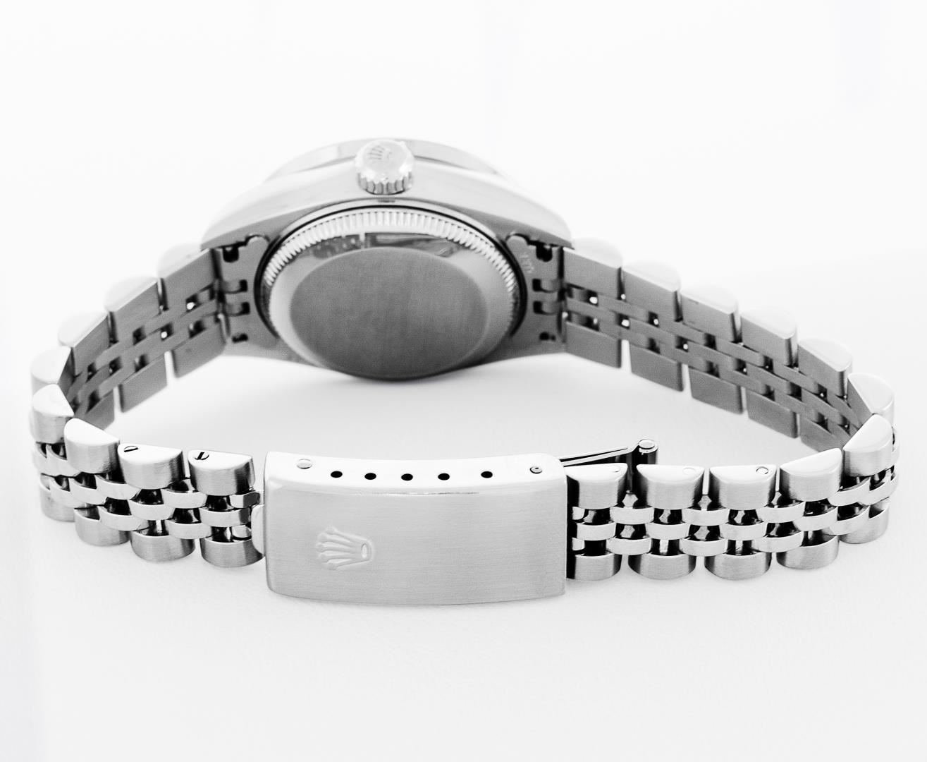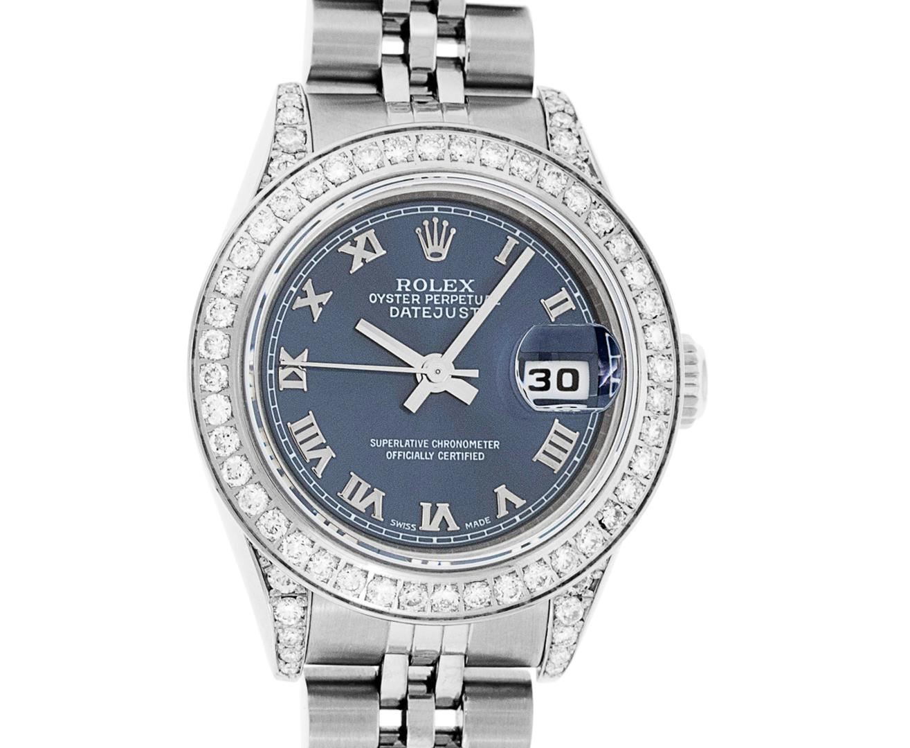 One Ladies Pre Owned Quickset Stainless Steel Rolex Datejust Polished Bright with Satin Finish, Serviced & Electronically Tested, Rolex Stainless Steel Case: 26mm, Custom Diamond Lugs: Added Diamonds On Lugs, Diamond Count: 24 Diamonds On Bezel, Color: G To H, Clarity: SI-VS. Rolex Stainless Steel Crown, Custom Bezel: New Stainless Steel Beadset Diamond Bezel, Stone Count: 40 Diamonds On Bezel, Diamond Color: G To H, Clarity: SI-VS. Custom Crystal: New Sapphire With Magnified Date Window. Custom Hands: New Hands. Rolex Movement: Quickset Automatic Winding Movement 2235. Rolex Dial: Blue Roman Dial With Square Track. Date Window: 3 O'Clock Position Date Display, Model: Sapphire Quickset Datejust. Condition: G-6 Extra Fine. Rolex Bracelet: Stainless Steel Jubilee Band. Bright Polish & Satin Finish. 6.0 Inch Length, Adjustable. Standard Clasp, With Rolex Logo. This Watch Has Been Serviced Time Tested And Is In Excellent Condition It Is Free Of All Scratches And Dents.