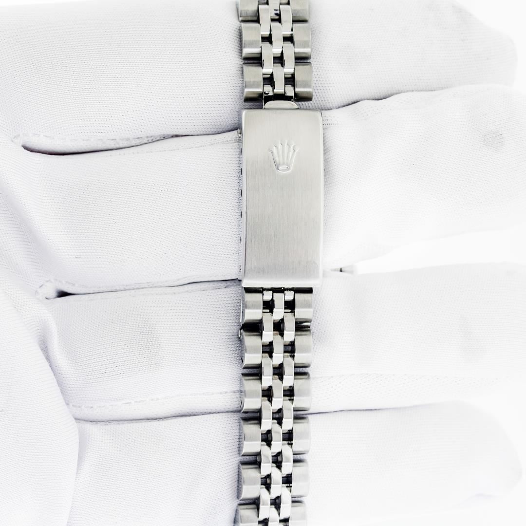 One Ladies Pre Owned Quickset Stainless Steel Rolex Datejust Polished Bright with Satin Finish, Serviced & Electronically Tested, Stainless Steel Case: 26mm, Custom Diamond Lugs: Added Diamonds On Lugs, Diamond Count: 24 Diamonds On Lugs. Rolex Stainless Steel Crown, Custom Bezel: New 18K White Gold Emerald Bead Set Diamond Bezel, Diamond + Gem Count: 28 Diamonds + 4 Emeralds. Custom Crystal: New Sapphire With Magnified Date Window. Custom Hands: New Hands. Rolex Movement: Automatic Winding Movement 2235. Rolex Dial: Blue With Roman Hour Markers & Square Track. Date Window: 3 O'Clock Position Date Display, Model: Quickset Datejust. Condition: G-6 Extra Fine. Rolex Bracelet: Stainless Steel Jubilee Band. Bright Polish & Satin Finish. 6.0 Inch Length, Adjustable. Standard Clasp, With Rolex Logo. This Watch Has Been Serviced Time Tested And Is In Excellent Condition It Is Free Of All Scratches And Dents.