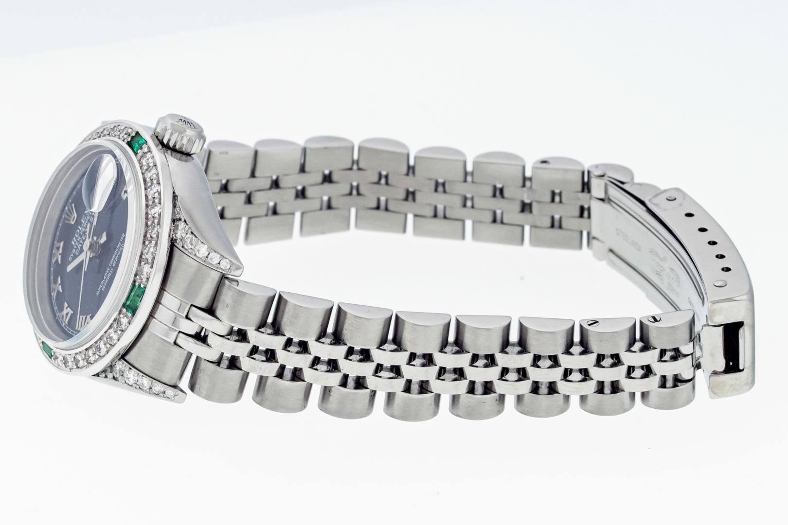 One Ladies Pre Owned Quickset Stainless Steel Rolex Datejust Polished Bright with Satin Finish, Serviced & Electronically Tested, Stainless Steel Case: 26mm, Custom Diamond Lugs: Added Diamonds On Lugs, Diamond Count: 24 Diamonds On Lugs. Rolex Stainless Steel Crown, Custom Bezel: New 18K White Gold Emerald Bead Set Diamond Bezel, Diamond + Gem Count: 28 Diamonds + 4 Emeralds. Custom Crystal: New Sapphire With Magnified Date Window. Custom Hands: New Hands. Rolex Movement: Automatic Winding Movement 2235. Rolex Dial: Blue With Roman Hour Markers & Square Track. Date Window: 3 O'Clock Position Date Display, Model: Quickset Datejust. Condition: G-6 Extra Fine. Rolex Bracelet: Stainless Steel Jubilee Band. Bright Polish & Satin Finish. 6.0 Inch Length, Adjustable. Standard Clasp, With Rolex Logo. This Watch Has Been Serviced Time Tested And Is In Excellent Condition It Is Free Of All Scratches And Dents.
