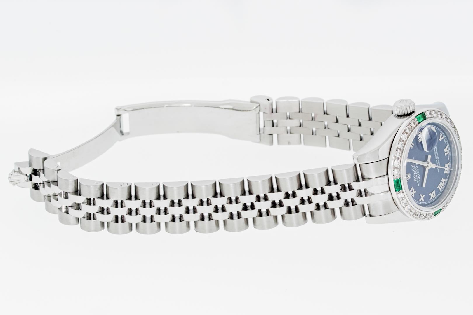 One Ladies Pre Owned Sapphire Quickset Stainless Steel Rolex Datejust Polished Bright with Satin Finish, Serviced & Electronically Tested, Rolex Stainless Steel Case: 26mm, Rolex Stainless Steel Crown, Custom Bezel: New 18K White Gold Diamond & Emerald Bezel, Stone Count: 28 Diamonds + 4 Emeralds. Crystal: Sapphire With Magnified Date Window. Hands: Luminescent Hands. Rolex Movement: Automatic Winding Movement 2235. Rolex Dial: Blue Roman With Square Track. Date Window: 3 O'Clock Position Date Display, Model: Quickset Datejust. Condition: G-6 Extra Fine. Rolex Bracelet: Stainless Steel Jubilee Band. Bright Polish & Satin Finish. 6.0 Inch Length, Adjustable. Hidden Clap, With Rolex Logo. This Watch Has Been Serviced Time Tested And Is In Excellent Condition It Is Free Of All Scratches And Dents.