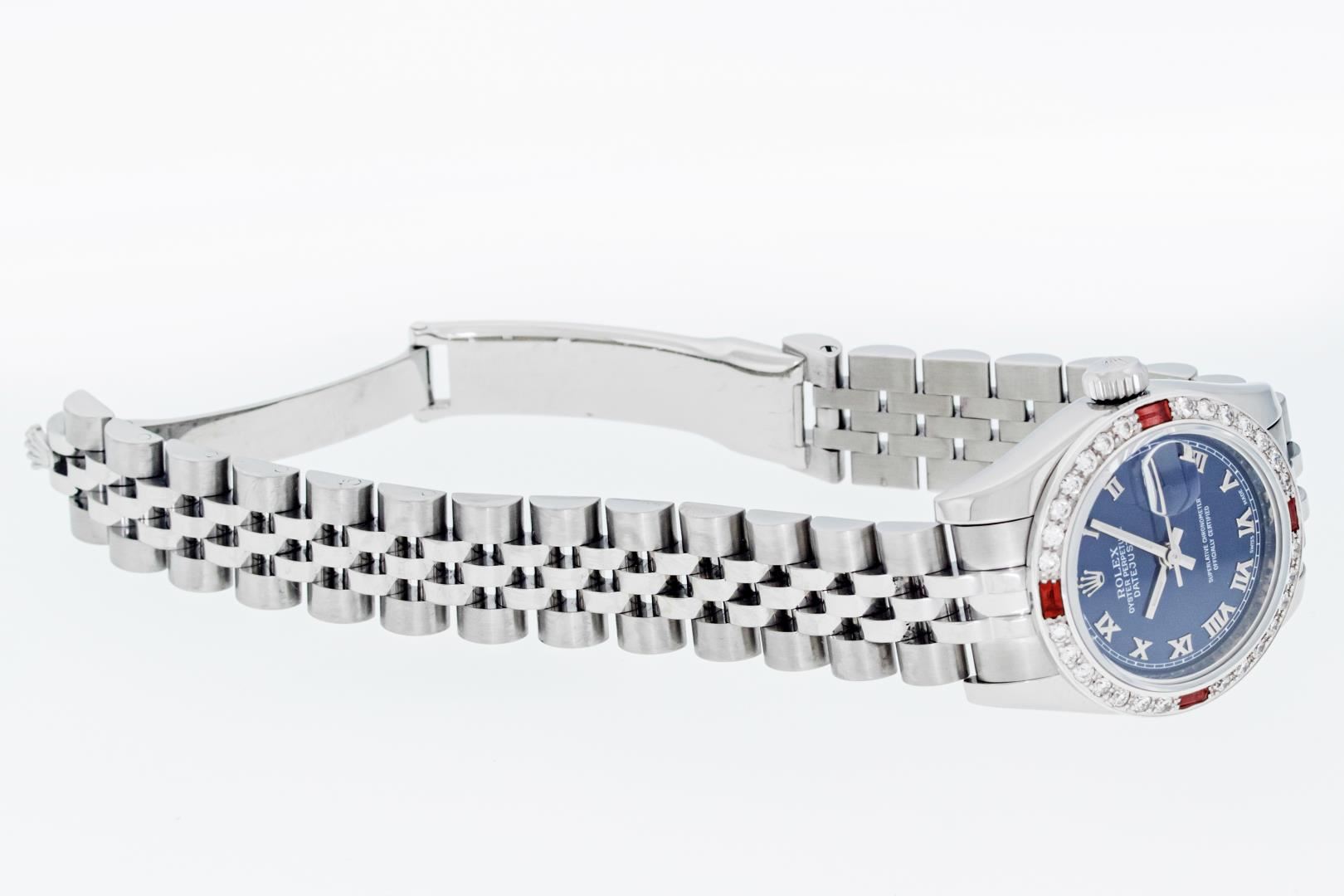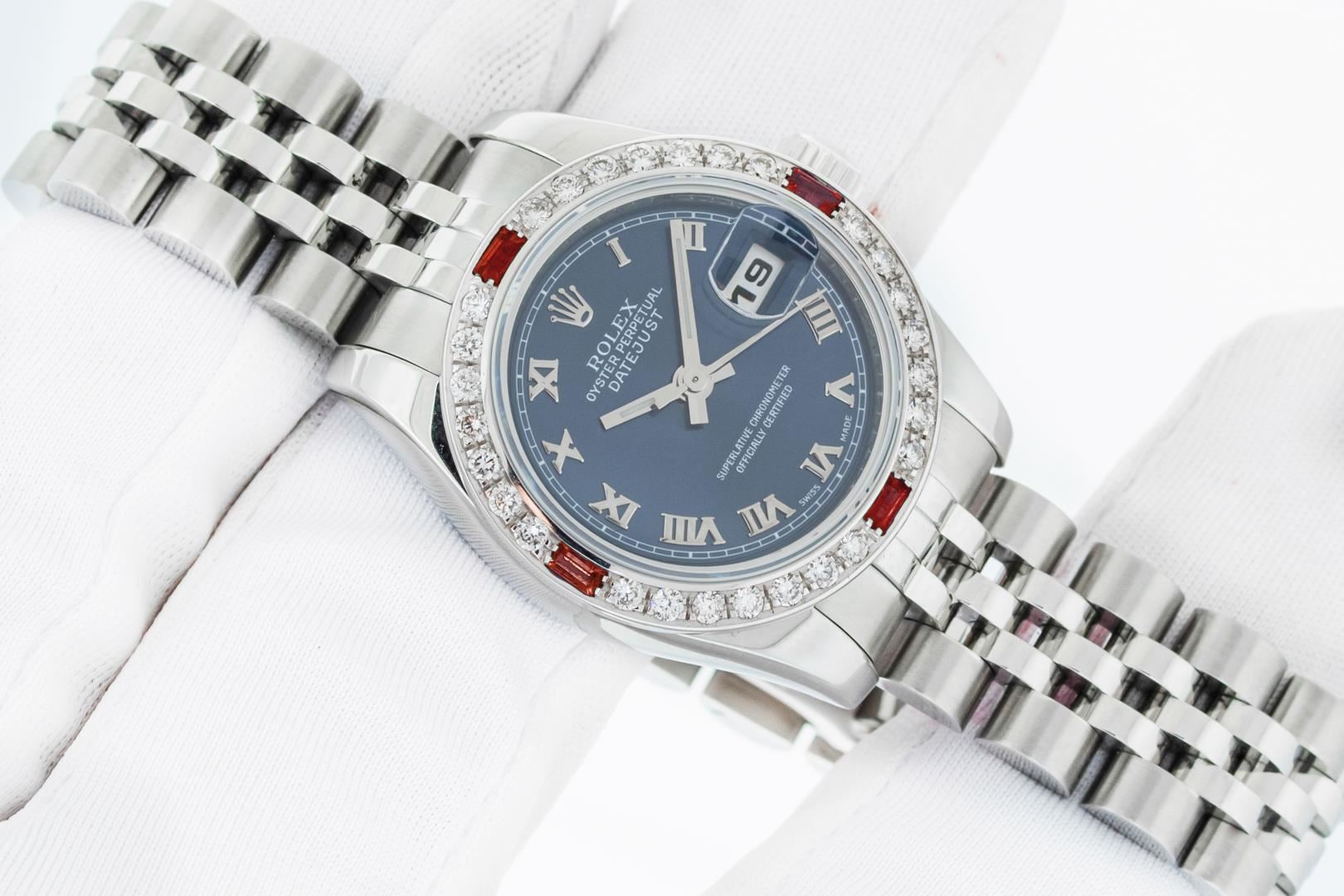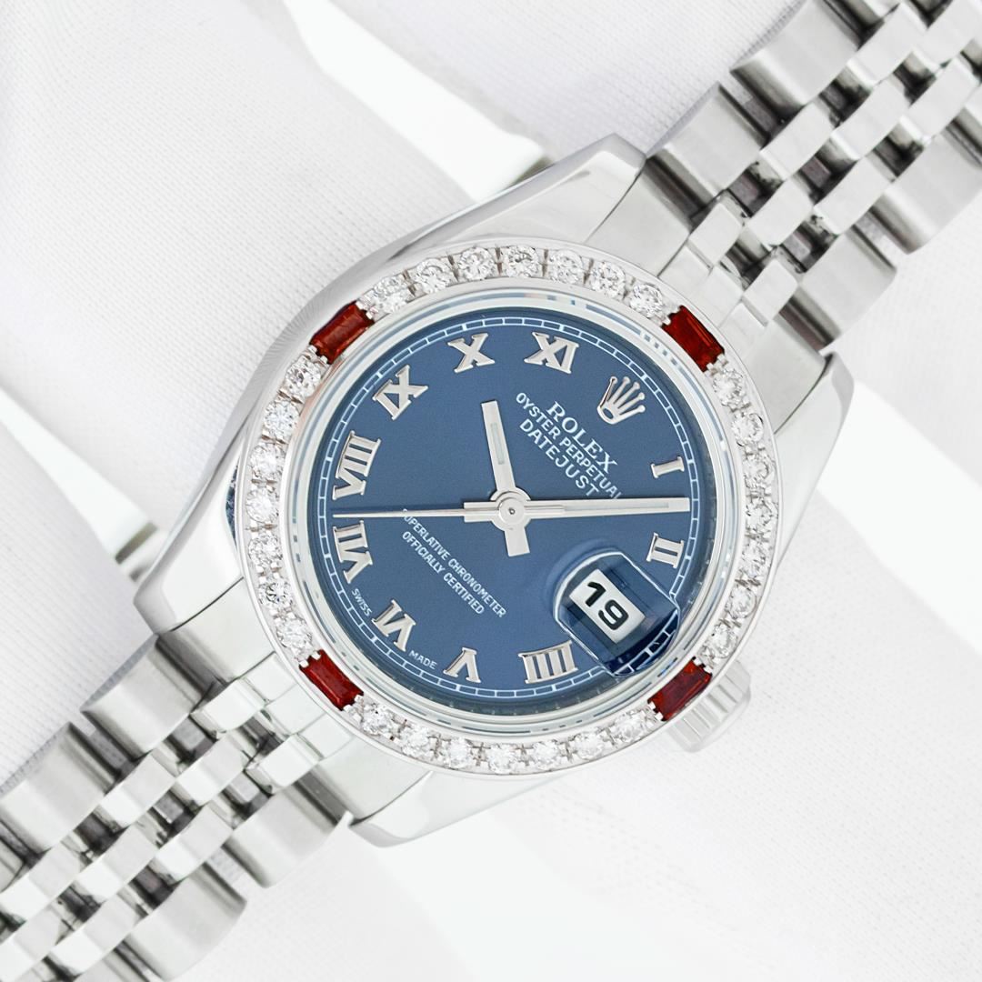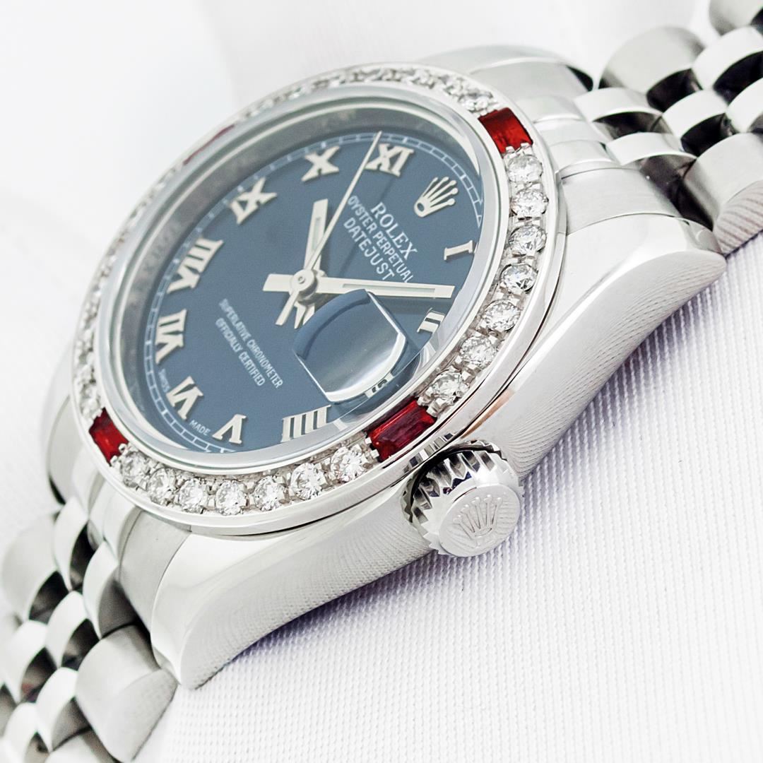 One Ladies Pre Owned Sapphire Quickset Stainless Steel Rolex Datejust Polished Bright with Satin Finish, Serviced & Electronically Tested, Rolex Stainless Steel Case: 26mm, Rolex Stainless Steel Crown, Custom Bezel: New 18K White Gold Diamond & Ruby Bezel, Stone Count: 28 Diamonds + 4 Rubies. Crystal: Sapphire With Magnified Date Window. Hands: Luminescent Hands. Rolex Movement: Automatic Winding Movement 2235. Rolex Dial: Blue Roman With Square Track. Date Window: 3 O'Clock Position Date Display, Model: Quickset Datejust. Condition: G-6 Extra Fine. Rolex Bracelet: Stainless Steel Jubilee Band. Bright Polish & Satin Finish. 6.0 Inch Length, Adjustable. Hidden Clap, With Rolex Logo. This Watch Has Been Serviced Time Tested And Is In Excellent Condition It Is Free Of All Scratches And Dents.
