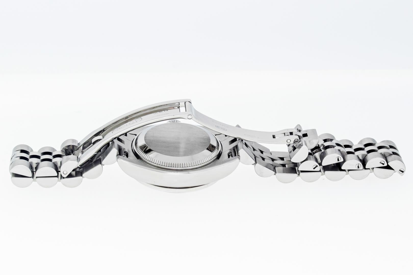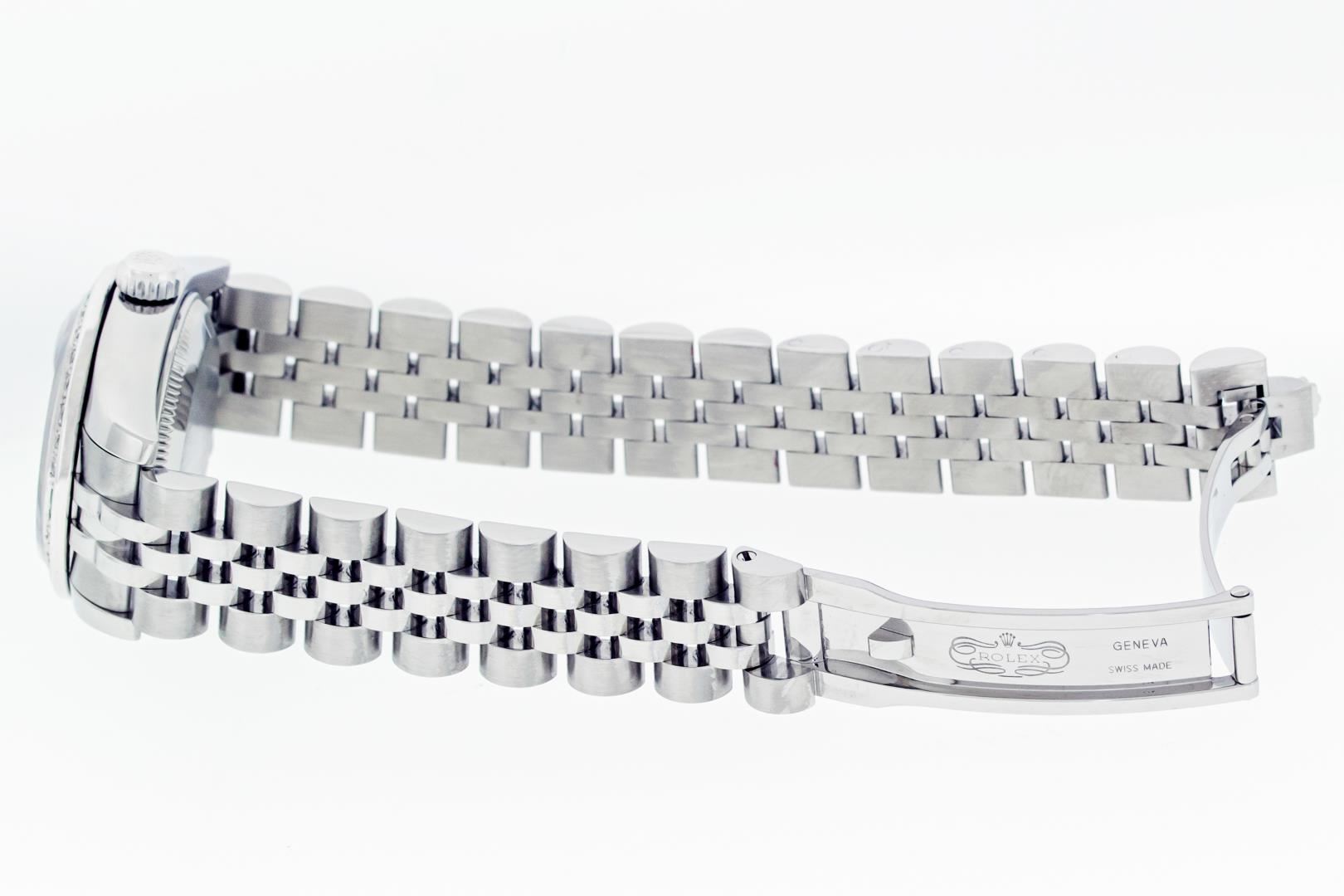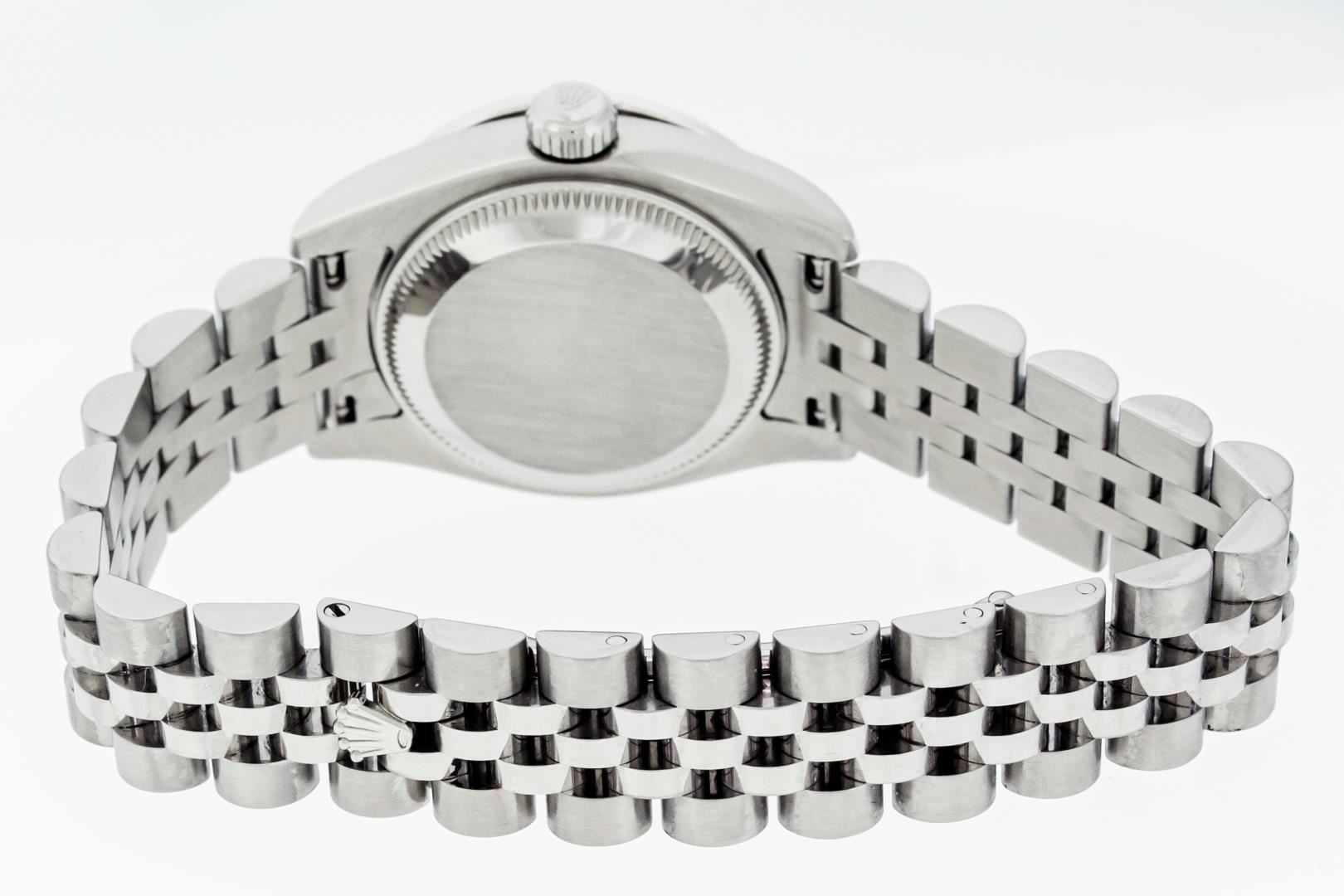 One Ladies Pre Owned Sapphire Quickset Stainless Steel Rolex Datejust Polished Bright with Satin Finish, Serviced & Electronically Tested, Rolex Stainless Steel Case: 26mm, Rolex Stainless Steel Crown, Custom Bezel: New 18K White Gold Diamond & Ruby Bezel, Stone Count: 28 Diamonds + 4 Rubies. Crystal: Sapphire With Magnified Date Window. Hands: Luminescent Hands. Rolex Movement: Automatic Winding Movement 2235. Rolex Dial: Blue Roman With Square Track. Date Window: 3 O'Clock Position Date Display, Model: Quickset Datejust. Condition: G-6 Extra Fine. Rolex Bracelet: Stainless Steel Jubilee Band. Bright Polish & Satin Finish. 6.0 Inch Length, Adjustable. Hidden Clap, With Rolex Logo. This Watch Has Been Serviced Time Tested And Is In Excellent Condition It Is Free Of All Scratches And Dents.