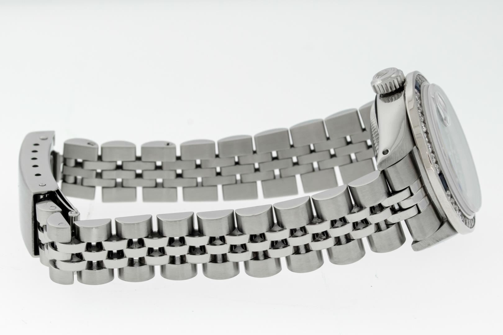 One Ladies Stainless Steel Rolex Polished Bright with Satin Finish, Serviced & Electronically Tested, Rolex Stainless Steel Case: 26mm, Rolex Stainless Steel Crown, Custom Bezel: New 18K White Gold Sapphire Channel Set Diamond Bezel, Diamond + Gem Count: 36 Diamonds + 4 Sapphires, Clarity: SI-VS, Color: G to H. Custom Crystal: New Sapphire With Magnified Date Window. Custom Hands: New Luminescent Hands. Rolex Movement: Automatic Winding Rolex Movement. Rolex Dial: Blue Factory Roman Dial With Square Track. Date Window: 3 O'Clock Position Date Display, Model: Datejust. Condition: G-6 Extra Fine. Rolex Bracelet: Stainless Steel Jubilee Band. Bright Polish & Satin Finish. 6.0 Inch Length, Adjustable. Standard Clasp, With Rolex Logo. This Pre Owned Watch Has Been Serviced Time Tested And Is In Excellent Condition It Is Free Of All Scratches And Dents.