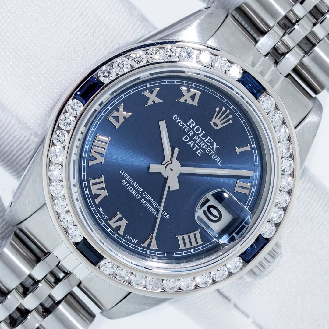 One Ladies Stainless Steel Rolex Polished Bright with Satin Finish, Serviced & Electronically Tested, Rolex Stainless Steel Case: 26mm, Rolex Stainless Steel Crown, Custom Bezel: New 18K White Gold Sapphire Channel Set Diamond Bezel, Diamond + Gem Count: 36 Diamonds + 4 Sapphires, Clarity: SI-VS, Color: G to H. Custom Crystal: New Sapphire With Magnified Date Window. Custom Hands: New Luminescent Hands. Rolex Movement: Automatic Winding Rolex Movement. Rolex Dial: Blue Factory Roman Dial With Square Track. Date Window: 3 O'Clock Position Date Display, Model: Datejust. Condition: G-6 Extra Fine. Rolex Bracelet: Stainless Steel Jubilee Band. Bright Polish & Satin Finish. 6.0 Inch Length, Adjustable. Standard Clasp, With Rolex Logo. This Pre Owned Watch Has Been Serviced Time Tested And Is In Excellent Condition It Is Free Of All Scratches And Dents.
