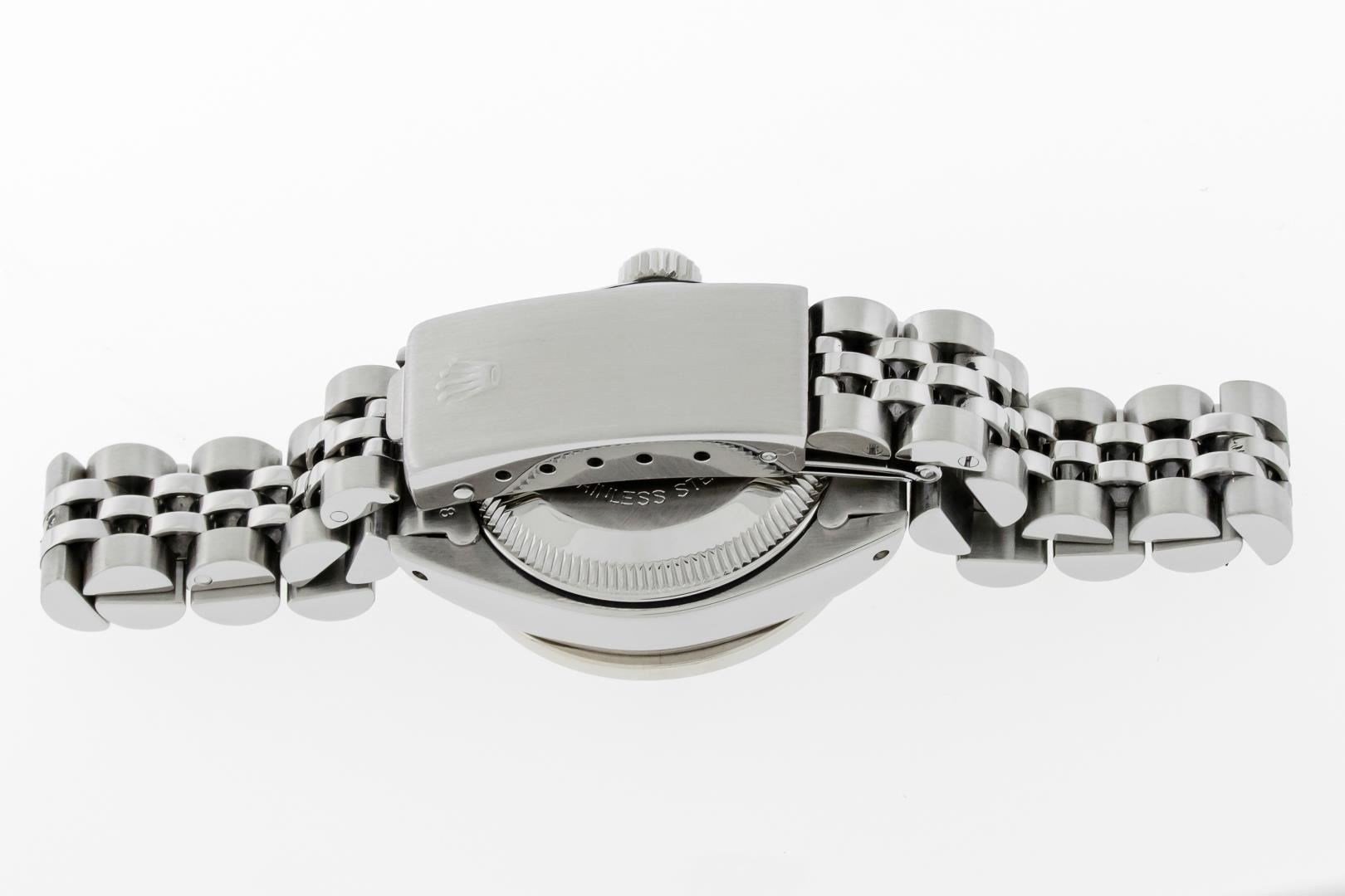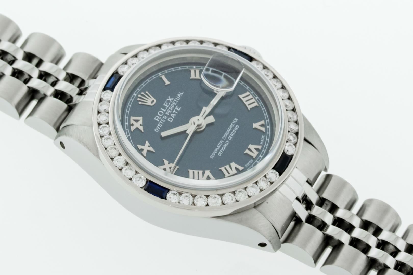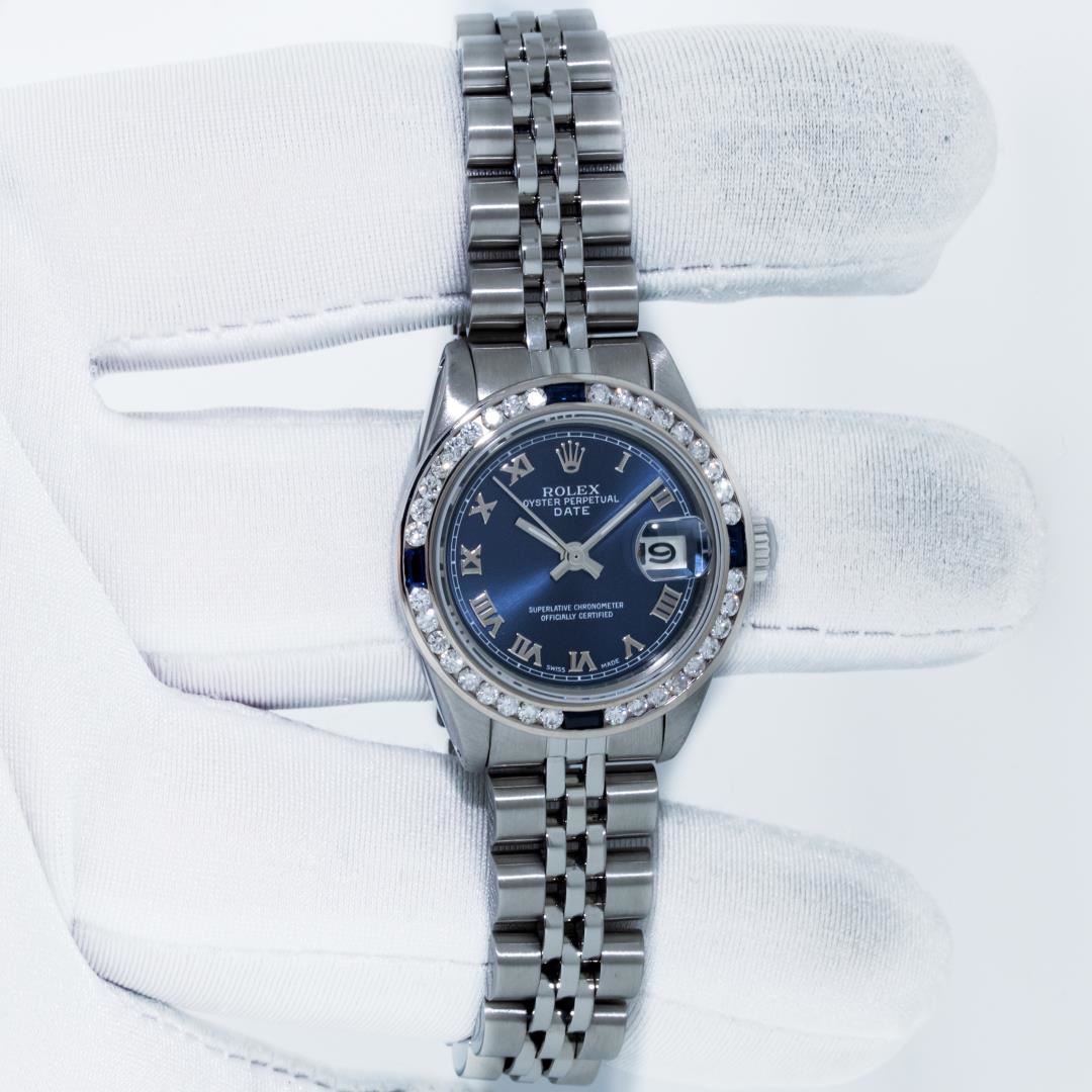 One Ladies Stainless Steel Rolex Polished Bright with Satin Finish, Serviced & Electronically Tested, Rolex Stainless Steel Case: 26mm, Rolex Stainless Steel Crown, Custom Bezel: New 18K White Gold Sapphire Channel Set Diamond Bezel, Diamond + Gem Count: 36 Diamonds + 4 Sapphires, Clarity: SI-VS, Color: G to H. Custom Crystal: New Sapphire With Magnified Date Window. Custom Hands: New Luminescent Hands. Rolex Movement: Automatic Winding Rolex Movement. Rolex Dial: Blue Factory Roman Dial With Square Track. Date Window: 3 O'Clock Position Date Display, Model: Datejust. Condition: G-6 Extra Fine. Rolex Bracelet: Stainless Steel Jubilee Band. Bright Polish & Satin Finish. 6.0 Inch Length, Adjustable. Standard Clasp, With Rolex Logo. This Pre Owned Watch Has Been Serviced Time Tested And Is In Excellent Condition It Is Free Of All Scratches And Dents.