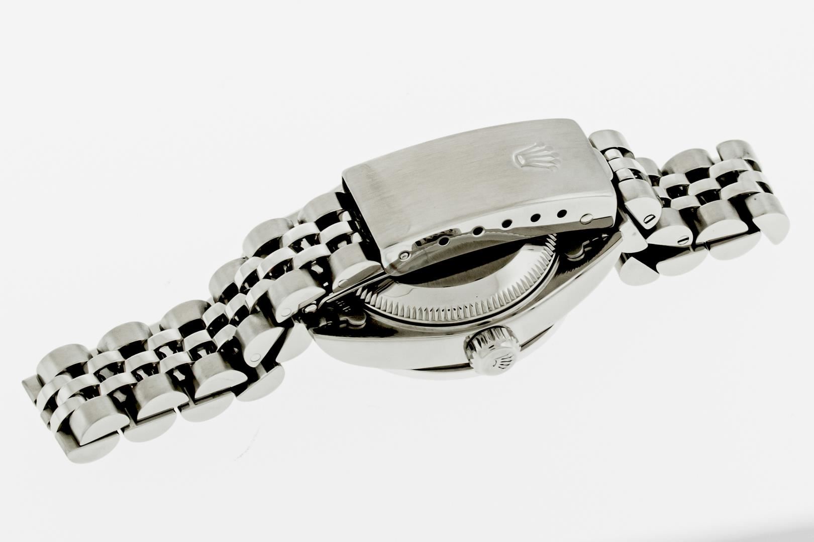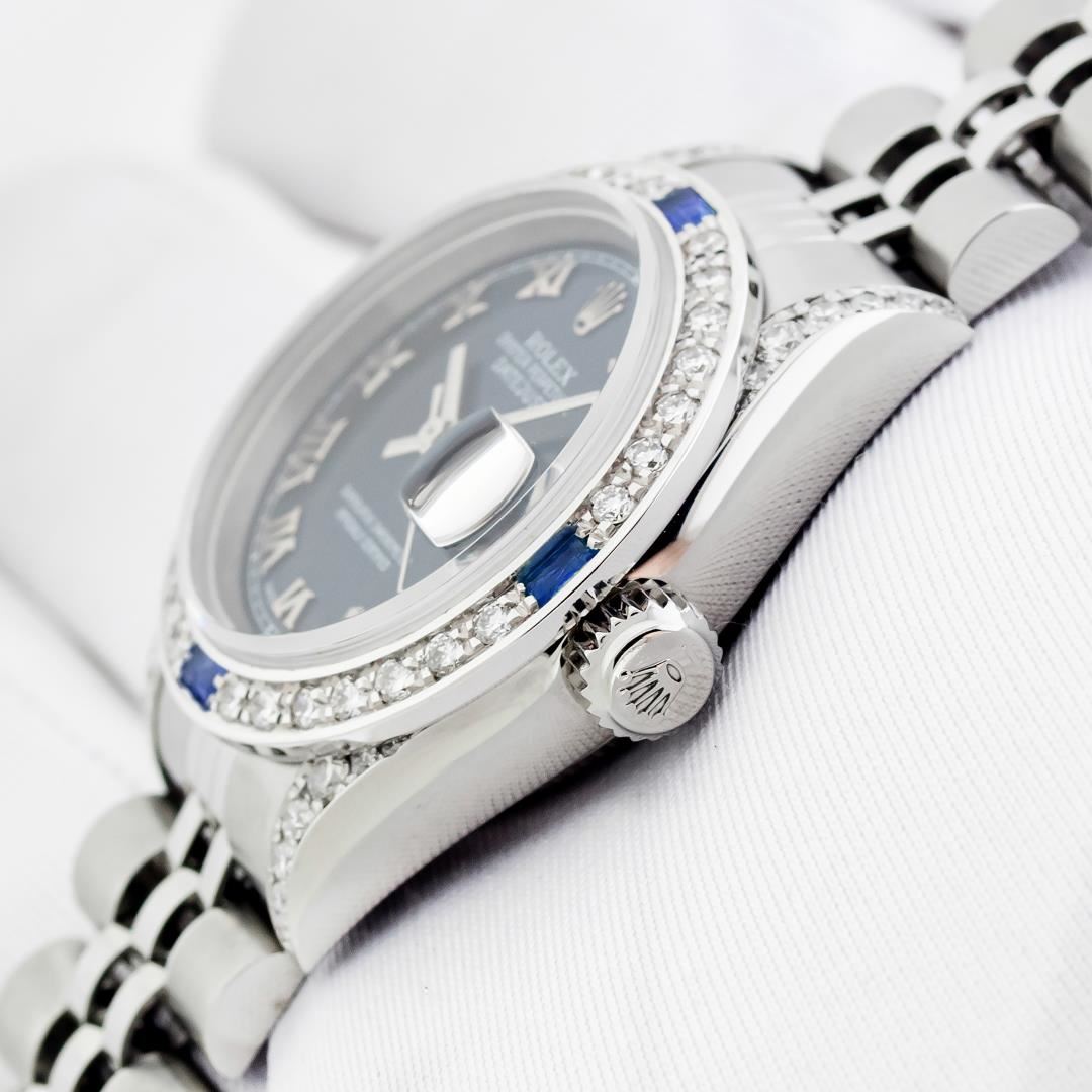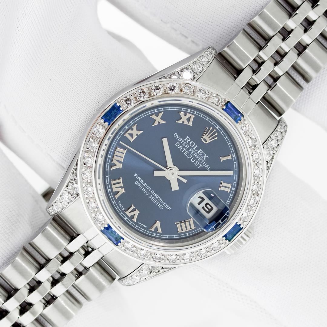 One Ladies Pre Owned Quickset Stainless Steel Rolex Datejust Polished Bright with Satin Finish, Serviced & Electronically Tested, Stainless Steel Case: 26mm, Custom Diamond Lugs: Added Diamonds On Lugs, Diamond Count: 24 Diamonds On Lugs. Rolex Stainless Steel Crown, Custom Bezel: New 18K White Gold Sapphire Bead Set Diamond Bezel, Diamond + Gem Count: 28 Diamonds + 4 Sapphires. Custom Crystal: New Sapphire With Magnified Date Window. Custom Hands: New Hands. Rolex Movement: Automatic Winding Movement 2235. Rolex Dial: Blue With Roman Hour Markers & Square Track. Date Window: 3 O'Clock Position Date Display, Model: Quickset Datejust. Condition: G-6 Extra Fine. Rolex Bracelet: Stainless Steel Jubilee Band. Bright Polish & Satin Finish. 6.0 Inch Length, Adjustable. Standard Clasp, With Rolex Logo. This Watch Has Been Serviced Time Tested And Is In Excellent Condition It Is Free Of All Scratches And Dents.