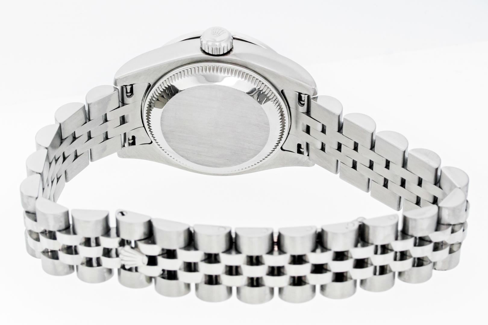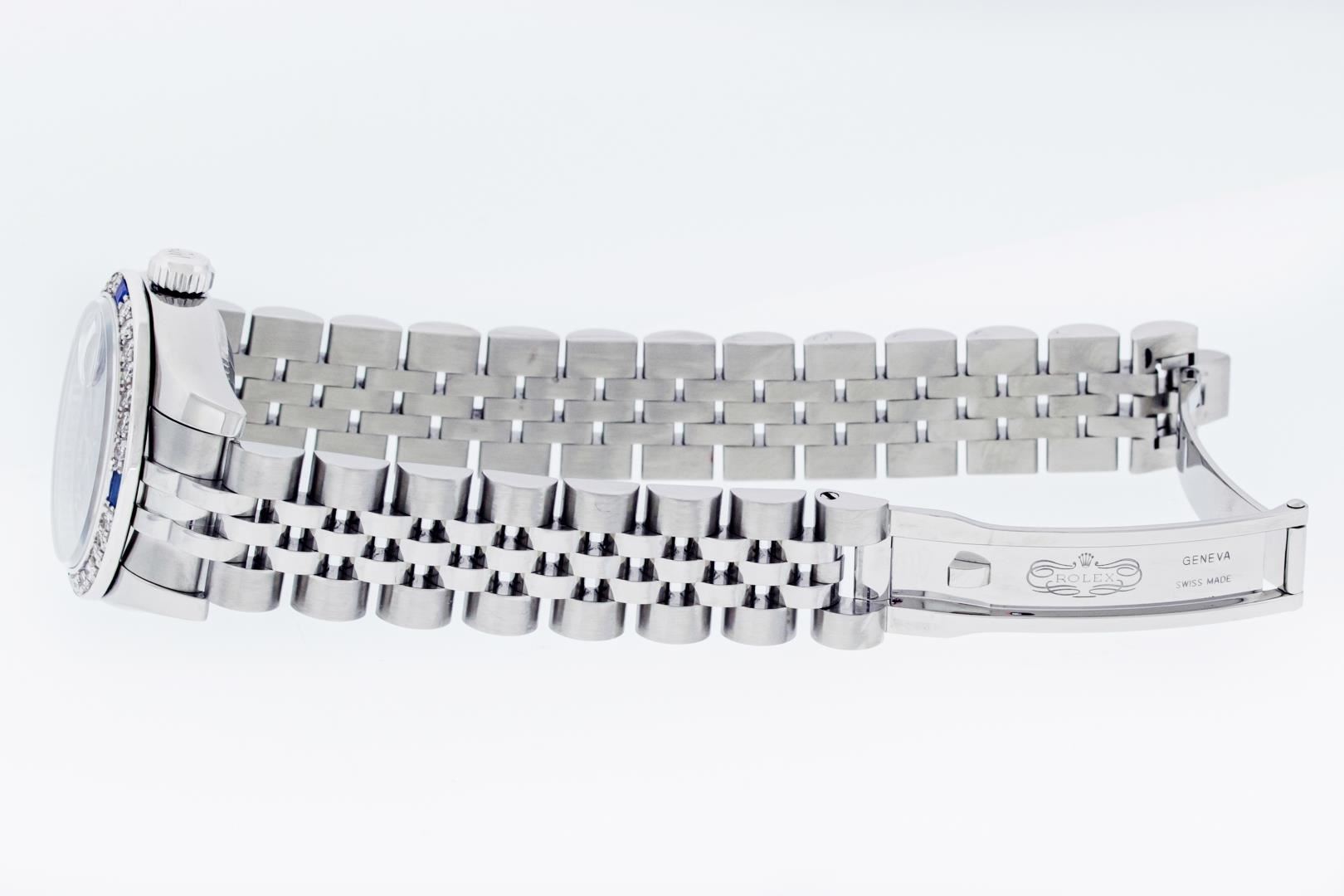 One Ladies Pre Owned Sapphire Quickset Stainless Steel Rolex Datejust Polished Bright with Satin Finish, Serviced & Electronically Tested, Rolex Stainless Steel Case: 26mm, Rolex Stainless Steel Crown, Custom Bezel: New 18K White Gold Diamond & Sapphire Bezel, Stone Count: 28 Diamonds + 4 Sapphires. Crystal: Sapphire With Magnified Date Window. Hands: Luminescent Hands. Rolex Movement: Automatic Winding Movement 2235. Rolex Dial: Blue Roman With Square Track. Date Window: 3 O'Clock Position Date Display, Model: Quickset Datejust. Condition: G-6 Extra Fine. Rolex Bracelet: Stainless Steel Jubilee Band. Bright Polish & Satin Finish. 6.0 Inch Length, Adjustable. Hidden Clap, With Rolex Logo. This Watch Has Been Serviced Time Tested And Is In Excellent Condition It Is Free Of All Scratches And Dents.