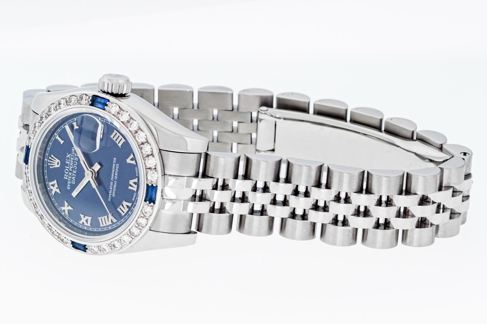 One Ladies Pre Owned Sapphire Quickset Stainless Steel Rolex Datejust Polished Bright with Satin Finish, Serviced & Electronically Tested, Rolex Stainless Steel Case: 26mm, Rolex Stainless Steel Crown, Custom Bezel: New 18K White Gold Diamond & Sapphire Bezel, Stone Count: 28 Diamonds + 4 Sapphires. Crystal: Sapphire With Magnified Date Window. Hands: Luminescent Hands. Rolex Movement: Automatic Winding Movement 2235. Rolex Dial: Blue Roman With Square Track. Date Window: 3 O'Clock Position Date Display, Model: Quickset Datejust. Condition: G-6 Extra Fine. Rolex Bracelet: Stainless Steel Jubilee Band. Bright Polish & Satin Finish. 6.0 Inch Length, Adjustable. Hidden Clap, With Rolex Logo. This Watch Has Been Serviced Time Tested And Is In Excellent Condition It Is Free Of All Scratches And Dents.