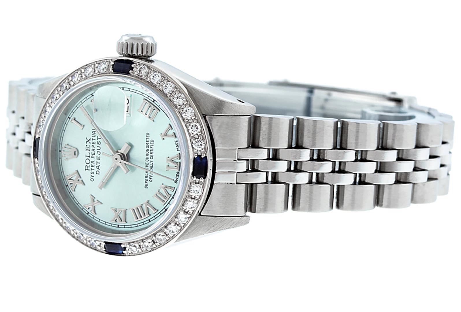 One Ladies Pre Owned Quickset Stainless Steel Rolex Datejust Polished Bright with Satin Finish, Serviced And Electronically Tested, Stainless Steel Case: 26mm, Stainless Steel Crown, Custom Bezel: New 18K White Gold Sapphire Beadset Diamond Bezel, Diamond + Gem Count: 28 Diamonds + 4 Sapphires. Custom Crystal: New Sapphire With Magnified Date Window. Custom Hands: New Luminescent Hands. Rolex Movement: Automatic Winding Movement 2135. Custom Dial: Custom Blue Roman Dial. Date Window: 3 O'Clock Position Date Display, Model: Datejust. Condition: G-6 Extra Fine. Rolex Bracelet: Stainless Steel Jubilee Band. Bright Polish And Satin Finish. 6.0 Inch Length, Adjustable. Standard Clasp, With Rolex Logo. This Watch Has Been Serviced Time Tested And Is In Excellent Condition It Is Free Of All Scratches And Dents.