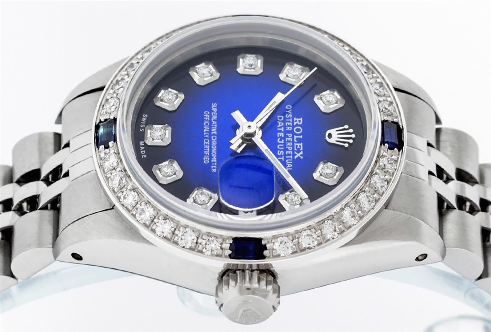 One Ladies Stainless Steel Rolex Datejust Polished Bright with Satin Finish, Serviced & Electronically Tested, Stainless Steel Case: 26mm, Stainless Steel Crown, Custom Bezel: New 18K White Gold Sapphire Beadset Diamond Bezel, Diamond + Gem Count: 28 Diamonds + 4 Sapphires Total Weight .70 Carat, Clarity: SI-VS, Color: G to H. Custom Crystal: New Synthetic Sapphire Cyclops Lens. Custom Hands: New Luminescent Hands. Movement: Automatic Winding Movement. Custom Dial: Refinished Blue Vignette With Diamond Hour Markers. Diamond Count: 10 Diamonds In Dial, Color: G to H, Clarity: SI-VS. Date Window: 3 O'clock Position Date Display, Model: Datejust. Condition: G-6 Extra Fine. Bracelet: Stainless Steel Jubilee. Bright Polish & Satin Finish. 6.0 Inch Length, Adjustable. Standard Clasp, With Rolex Logo. This Watch Has Been Serviced Time Tested And Is In Excellent Condition It Is Free Of All Scratches And Dents.