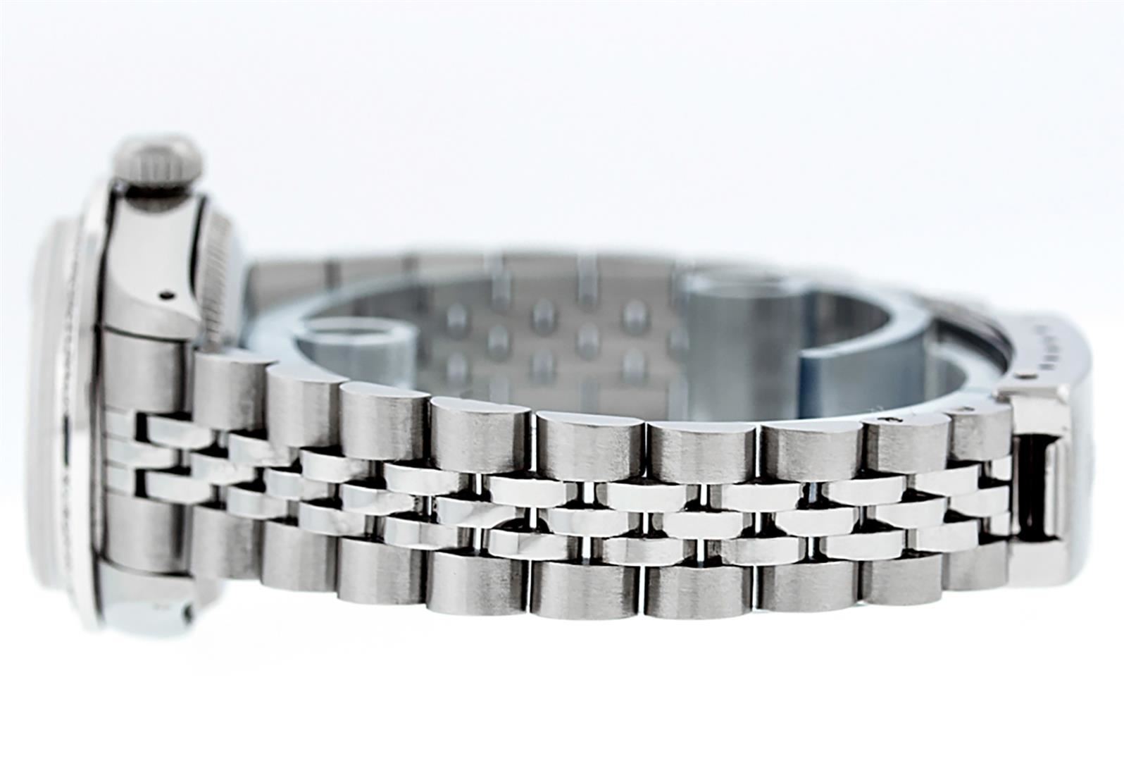 One Ladies Stainless Steel Rolex Datejust Polished Bright with Satin Finish, Serviced & Electronically Tested, Stainless Steel Case: 26mm, Stainless Steel Crown, Custom Bezel: New 18K White Gold Sapphire Beadset Diamond Bezel, Diamond + Gem Count: 28 Diamonds + 4 Sapphires Total Weight .70 Carat, Clarity: SI-VS, Color: G to H. Custom Crystal: New Synthetic Sapphire Cyclops Lens. Custom Hands: New Luminescent Hands. Movement: Automatic Winding Movement. Custom Dial: Refinished Blue Vignette With Diamond Hour Markers. Diamond Count: 10 Diamonds In Dial, Color: G to H, Clarity: SI-VS. Date Window: 3 O'clock Position Date Display, Model: Datejust. Condition: G-6 Extra Fine. Bracelet: Stainless Steel Jubilee. Bright Polish & Satin Finish. 6.0 Inch Length, Adjustable. Standard Clasp, With Rolex Logo. This Watch Has Been Serviced Time Tested And Is In Excellent Condition It Is Free Of All Scratches And Dents.