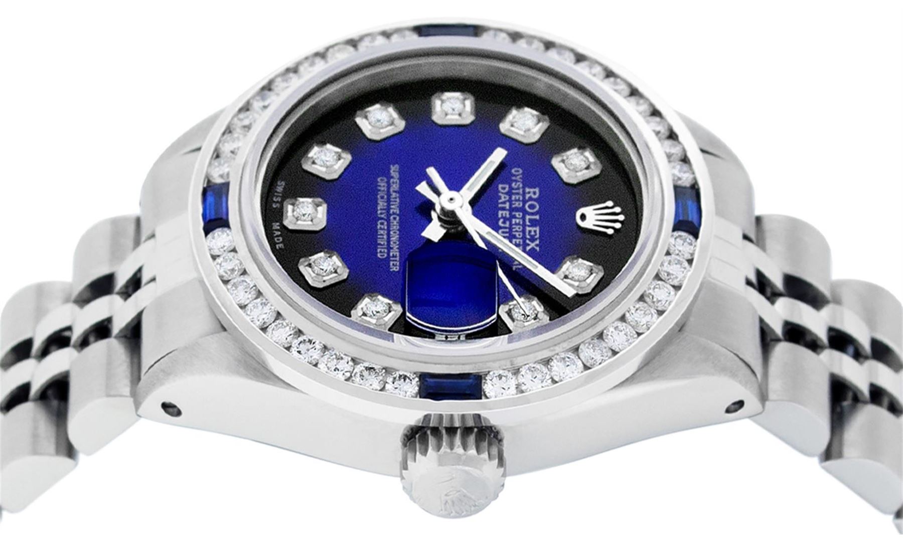 One Ladies Stainless Steel Rolex Datejust Polished Bright with Satin Finish, Serviced & Electronically Tested, Stainless Steel Case: 26mm, Stainless Steel Crown, Custom Bezel: New 18K White Gold Sapphire Channel Set Diamond Bezel, Diamond + Gem Count: 36