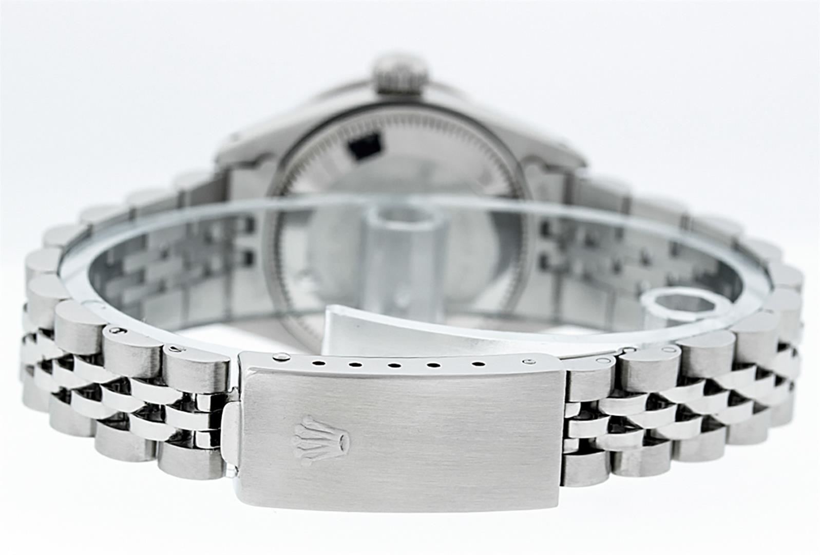 One Ladies Stainless Steel Rolex Datejust Polished Bright with Satin Finish, Serviced & Electronically Tested, Stainless Steel Case: 26mm, Stainless Steel Crown, Custom Bezel: New 18K White Gold Sapphire Beadset Diamond Bezel, Diamond + Gem Count: 28 Diamonds + 4 Sapphires Total Weight .70 Carat, Clarity: SI-VS, Color: G to H. Custom Crystal: New Synthetic Sapphire Cyclops Lens. Custom Hands: New Luminescent Hands. Movement: Automatic Winding Movement Caliber 2030. Custom Dial: Refinished Blue Vignette With Diamond Hour Markers. Diamond Count: 10 Diamonds In Dial, Color: G to H, Clarity: SI-VS. Date Window: 3 O'clock Position Date Display, Model: Datejust. Condition: G-6 Extra Fine. Bracelet: Stainless Steel Jubilee. Bright Polish & Satin Finish. 6.0 Inch Length, Adjustable. Standard Clasp, With Rolex Logo. This Watch Has Been Serviced Time Tested And Is In Excellent Condition It Is Free Of All Scratches And Dents.