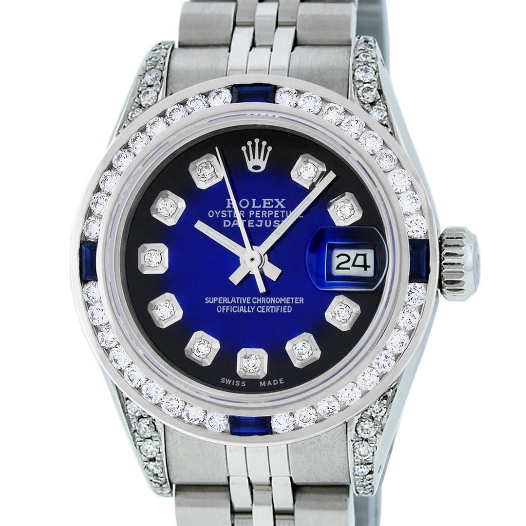 One Ladies Stainless Steel Rolex Datejust Polished Bright with Satin Finish, Serviced & Electronically Tested, Stainless Steel Case: 26mm, Stainless Steel Crown, Diamond Lugs: 24 Diamonds On Lugs, Clarity: SI-VS, Color: G to H. Custom Bezel: New 18K White Gold Diamond & Sapphire Channel Set Bezel, Diamond Count: 28 Diamonds + 4 Sapphires, Total Weight .70 Carat, Clarity: SI-VS, Color: G to H. Custom Crystal: New Scratch Resistant Synthetic Sapphire Cyclops Lens. Custom Hands: New Luminescent Hands. Movement: Automatic Winding Movement . Custom Dial: Refinished Blue Vignette Diamond Dial, 10 Diamonds in Dial, G To H In Color, Clarity: SI-VS. Date Window: 3 O'clock Position Date Display, Model: Datejust Condition: G-6 Extra Fine. Bracelet: Stainless Steel Jubilee Band. Bright Polish & Satin Finish. 6.0 Inch Length, Adjustable. Standard Clasp, With Rolex Logo. This Watch Has Been Serviced Time Tested And Is In Excellent Condition It Is Free Of All Scratches And Dents.