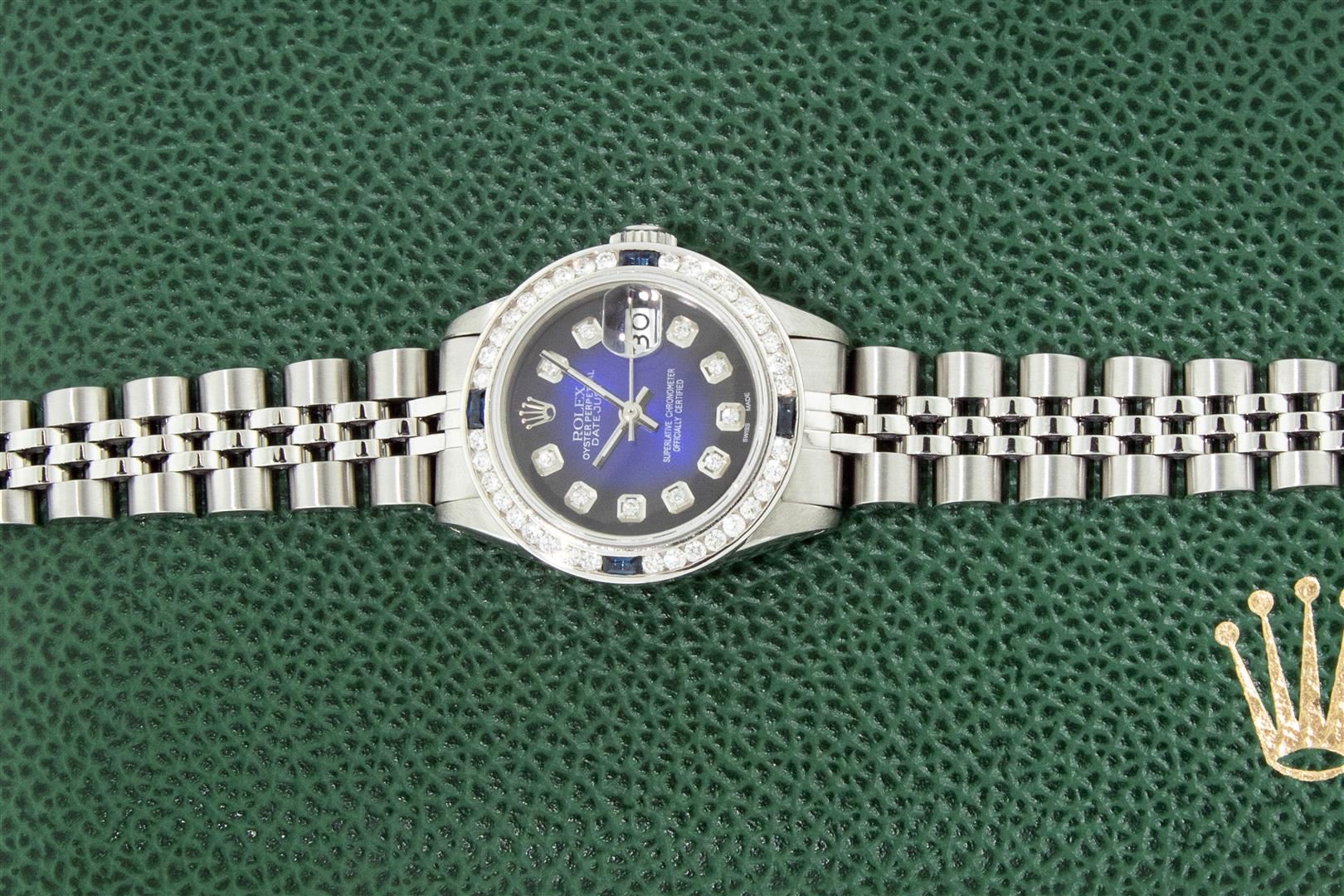 One Ladies Stainless Steel Rolex Datejust Polished Bright with Satin Finish, Serviced & Electronically Tested, Stainless Steel Case: 26mm, Stainless Steel Crown, Custom Bezel: New 18K White Gold Sapphire Channel Set Diamond Bezel, Diamond + Gem Count: 36 Diamonds + 4 Sapphires Total Weight 1.00 Carat, Clarity: SI-VS, Color: G to H. Custom Crystal: New Synthetic Sapphire Cyclops Lens. Custom Hands: New Luminescent Hands. Movement: Automatic Winding Movement. Custom Dial: Refinished Blue Vignette With Diamond Hour Markers. Date Window: 3 O'Clock Position Date Display, Model: Datejust. Condition: G-6 Extra Fine. Bracelet: Stainless Steel Jubilee. Bright Polish & Satin Finish. 6.0 Inch Length, Adjustable. Standard Clasp, With Rolex Logo. This Watch Has Been Serviced Time Tested And Is In Excellent Condition It Is Free Of All Scratches And Dents. This Watch Comes With A Rolex Box.