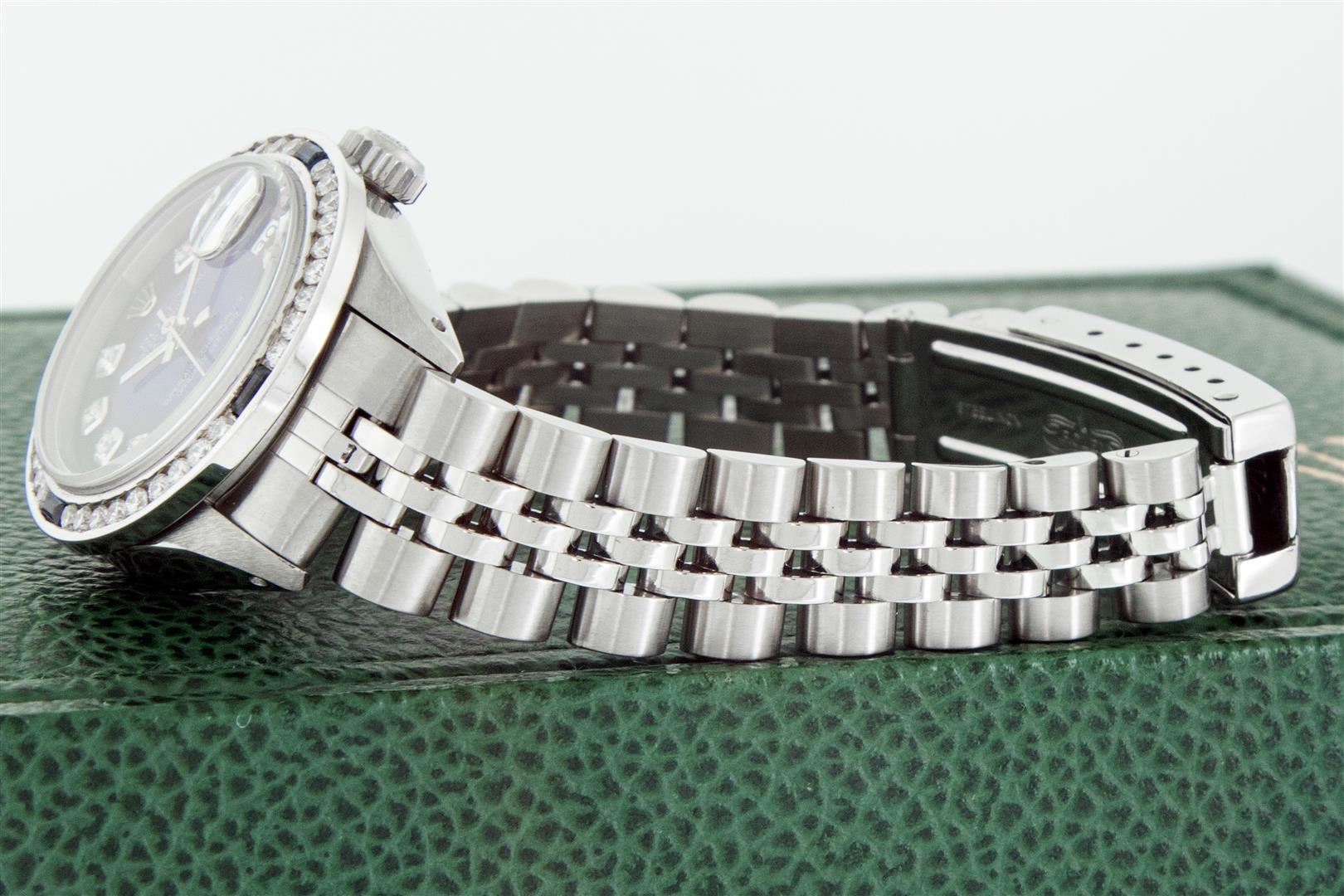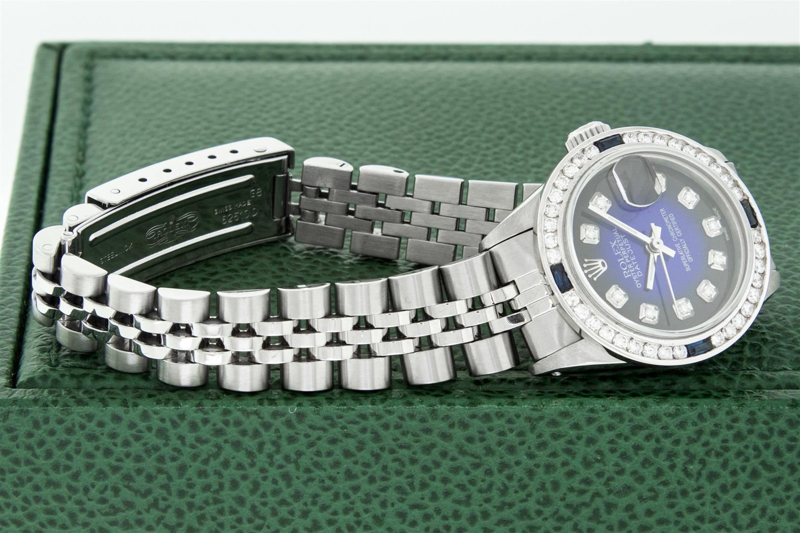 One Ladies Stainless Steel Rolex Datejust Polished Bright with Satin Finish, Serviced & Electronically Tested, Stainless Steel Case: 26mm, Stainless Steel Crown, Custom Bezel: New 18K White Gold Sapphire Channel Set Diamond Bezel, Diamond + Gem Count: 36 Diamonds + 4 Sapphires Total Weight 1.00 Carat, Clarity: SI-VS, Color: G to H. Custom Crystal: New Synthetic Sapphire Cyclops Lens. Custom Hands: New Luminescent Hands. Movement: Automatic Winding Movement. Custom Dial: Refinished Blue Vignette With Diamond Hour Markers. Date Window: 3 O'Clock Position Date Display, Model: Datejust. Condition: G-6 Extra Fine. Bracelet: Stainless Steel Jubilee. Bright Polish & Satin Finish. 6.0 Inch Length, Adjustable. Standard Clasp, With Rolex Logo. This Watch Has Been Serviced Time Tested And Is In Excellent Condition It Is Free Of All Scratches And Dents. This Watch Comes With A Rolex Box.