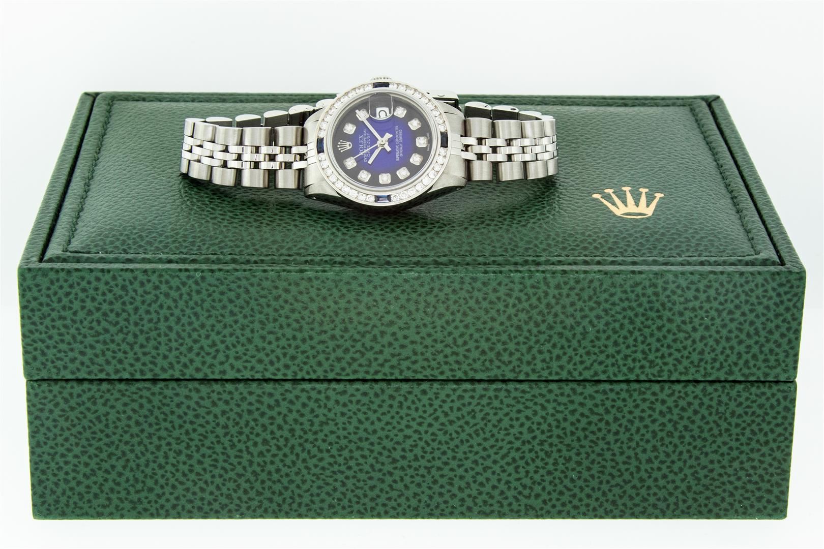 One Ladies Stainless Steel Rolex Datejust Polished Bright with Satin Finish, Serviced & Electronically Tested, Stainless Steel Case: 26mm, Stainless Steel Crown, Custom Bezel: New 18K White Gold Sapphire Channel Set Diamond Bezel, Diamond + Gem Count: 36 Diamonds + 4 Sapphires Total Weight 1.00 Carat, Clarity: SI-VS, Color: G to H. Custom Crystal: New Synthetic Sapphire Cyclops Lens. Custom Hands: New Luminescent Hands. Movement: Automatic Winding Movement. Custom Dial: Refinished Blue Vignette With Diamond Hour Markers. Date Window: 3 O'Clock Position Date Display, Model: Datejust. Condition: G-6 Extra Fine. Bracelet: Stainless Steel Jubilee. Bright Polish & Satin Finish. 6.0 Inch Length, Adjustable. Standard Clasp, With Rolex Logo. This Watch Has Been Serviced Time Tested And Is In Excellent Condition It Is Free Of All Scratches And Dents. This Watch Comes With A Rolex Box.