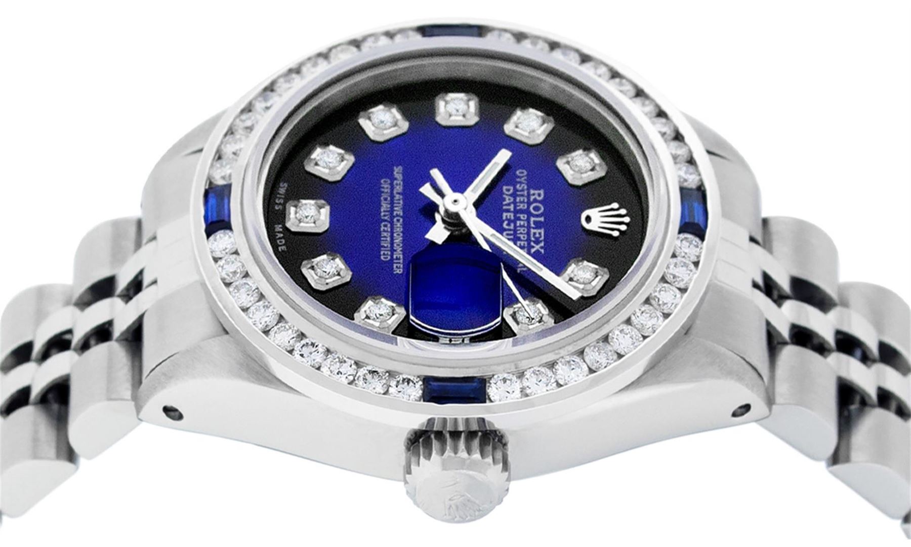 One Ladies Rolex Datejust Polished Bright with Satin Finish, Serviced & Electronically Tested, Stainless Steel Case:26mm, Stainless Steel Crown, Custom Bezel: 18K White Gold Sapphire Channel Set Diamond Bezel, Diamond + Gem Count: 36 Diamonds + 4 Sapphires Total Weight 1.00 Carat, Clarity: SI-VS, Color: G to H. Custom Crystal: Synthetic Sapphire Cyclops Lens. Movement: Automatic Winding Movement Caliber 2030. Custom Dial: Refinished Blue Vignette With Diamond Hour Markers. Date Window: 3 O'Clock Position Date Display, Model: Datejust. Condition: G-6 Extra Fine. Bracelet: Stainless Steel Jubilee. Bright Polish & Satin Finish. 5.5 Inch Length, Adjustable. Standard Clasp, With Rolex Logo. This watch has been serviced and polished and its free of all dents and scratches and has been time tested.