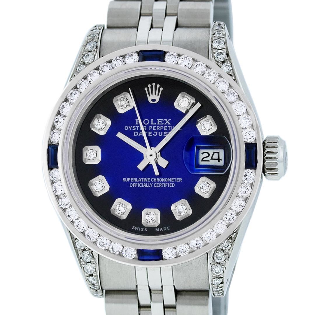 One Ladies Pre Owned Quickset Stainless Steel Rolex Datejust Polished Bright with Satin Finish, Serviced And Electronically Tested, Stainless Steel Case: 26mm, Stainless Steel Crown, Custom Diamond Lugs: 24 Added Diamonds On Lugs. Custom Bezel: New 18K White Gold Diamond And Sapphire Channel Set Bezel, Diamond Count: 28 Diamonds + 4 Sapphires. Custom Crystal: New Sapphire With Date Window. Custom Hands: New Luminescent Hands. Rolex Movement: Automatic Winding Movement 2135. Custom Dial: Custom Blue Vignette Dial With Added Diamonds, 10 Diamonds On Dial. Date Window: 3 O'Clock Position Date Display, Model: Datejust Condition: G-6 Extra Fine. Rolex Bracelet: Stainless Steel Jubilee Band. Bright Polish And Satin Finish. 6.0 Inch Length, Adjustable. Standard Clasp, With Rolex Logo. This Watch Has Been Serviced Time Tested And Is In Excellent Condition It Is Free Of All Scratches And Dents.