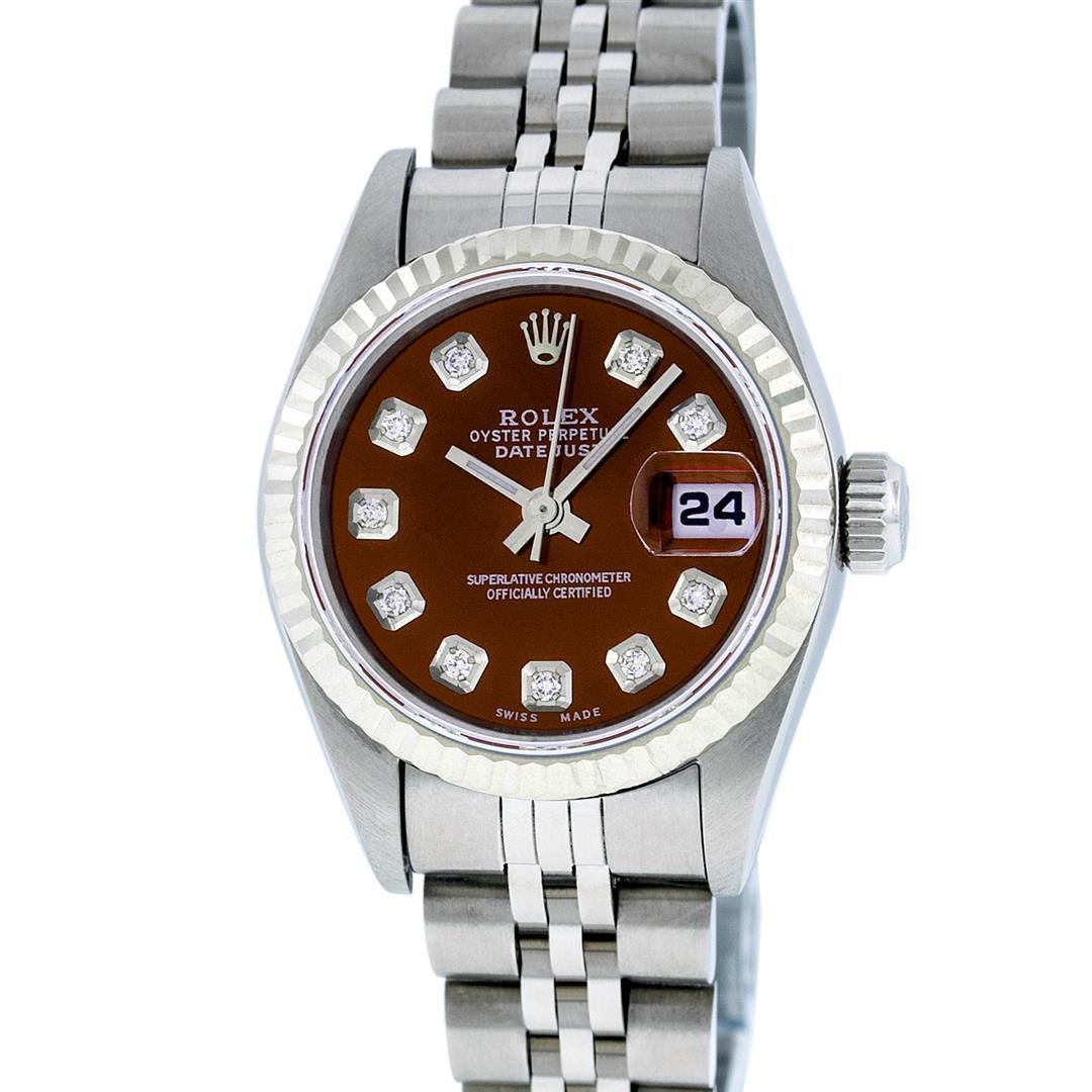One Ladies Pre Owned Quickset Stainless Steel Rolex Datejust Polished Bright with Satin Finish, Serviced & Electronically Tested, Rolex Stainless Steel Case: 26mm, Rolex Stainless Steel Crown, Rolex Bezel: 18K White Gold Fluted Bezel. Custom Crystal: New Scratch Resistant Sapphire Cyclops Lens. Custom Hands: New Luminescent Hands. Rolex Movement: Automatic Winding Movement. Custom Dial: Refinished To Brown With Custom Added Genuine Diamonds, Diamond Count: 10 Diamonds In Dial, Color: G to H, Clarity: SI1 Date Window: 3 O'clock Position Date Display, Model: Quickset Datejust. Condition: G-6 Extra Fine. Rolex Bracelet: Stainless Steel Jubilee Band. Bright Polish & Satin Finish. 6.0 Inch Length, Adjustable. Standard Clasp, With Rolex Logo. This Watch Has Been Serviced Time Tested And Is In Excellent Condition It Is Free Of All Scratches And Dents.