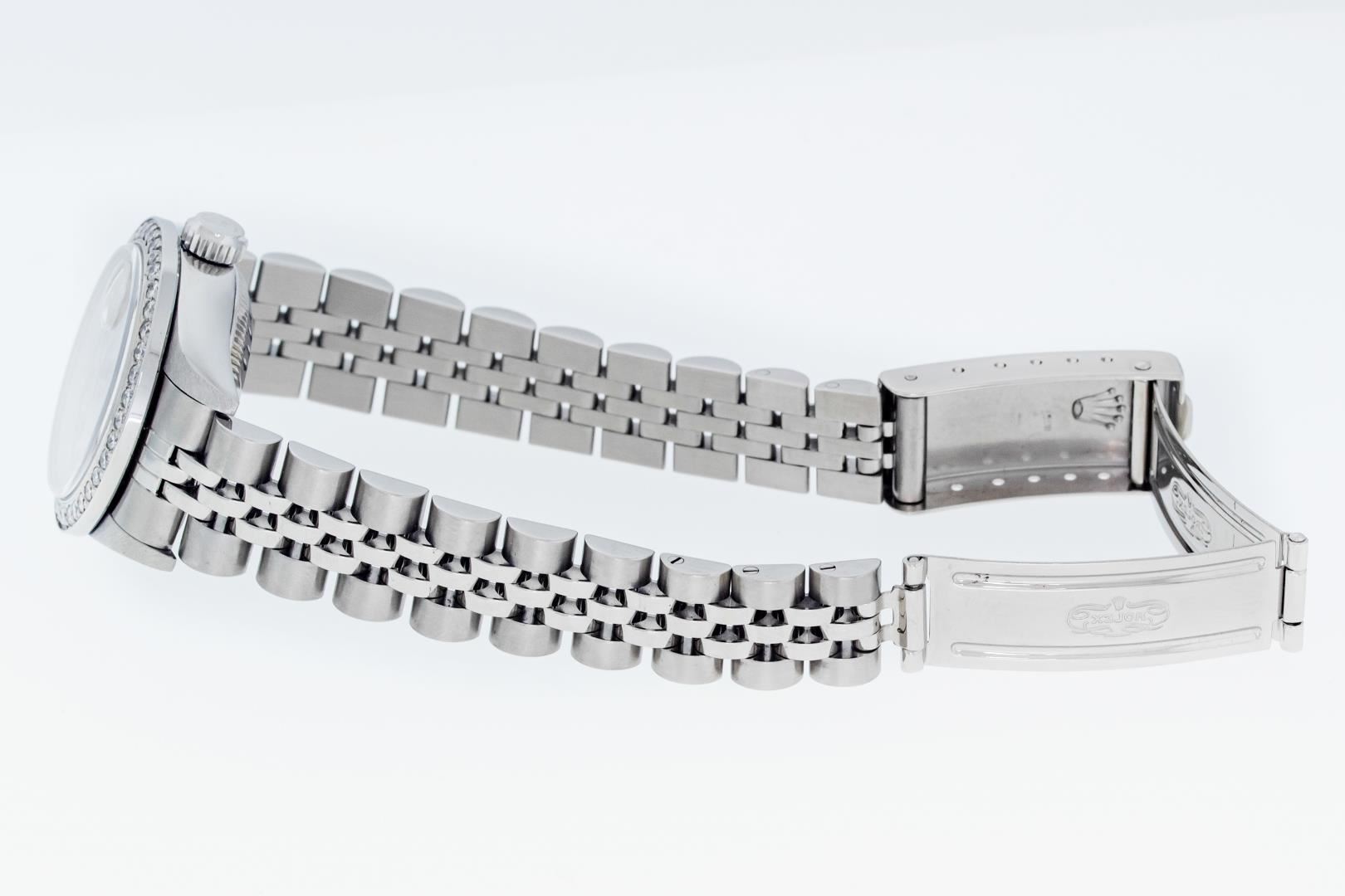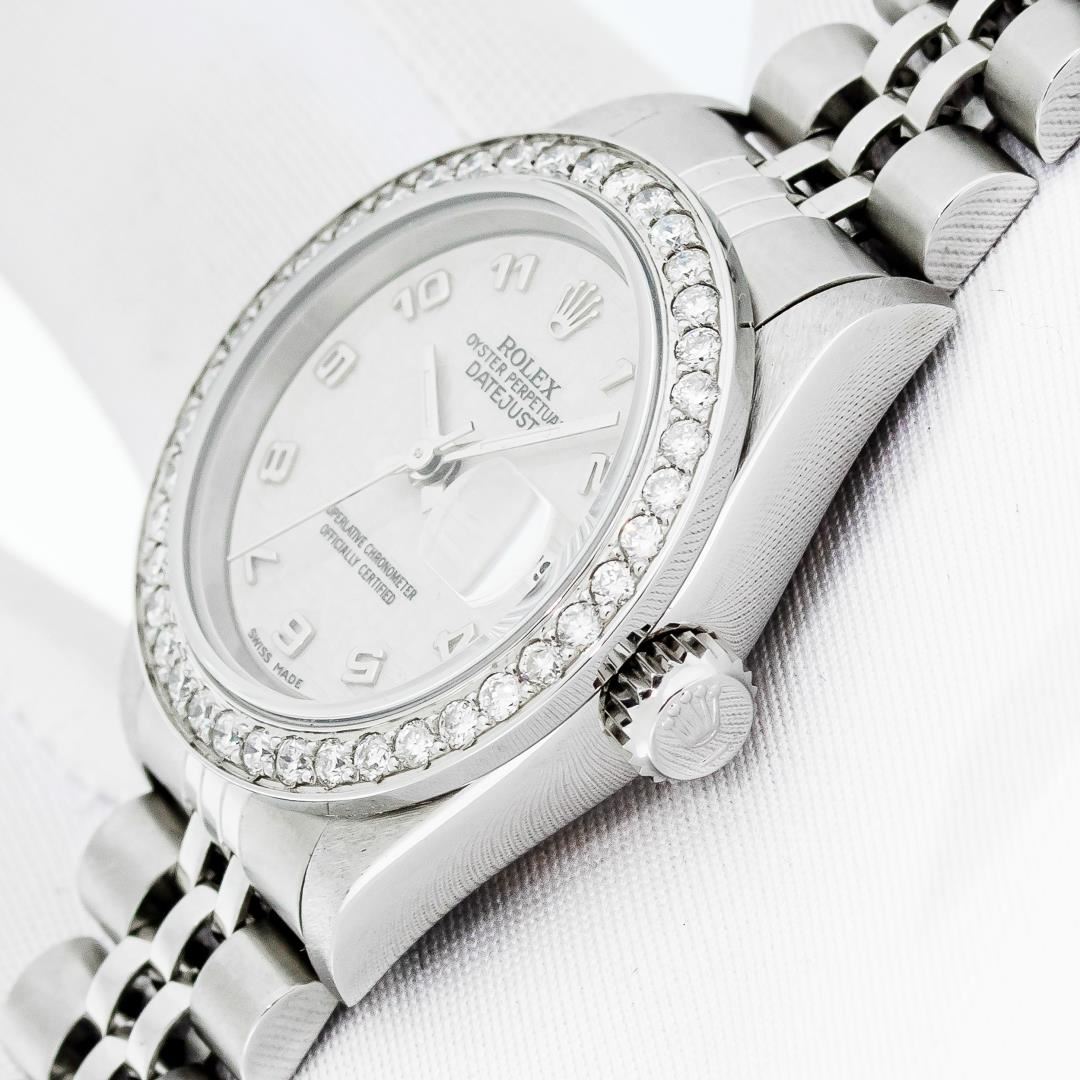 One Ladies Pre Owned Quickset Stainless Steel Rolex Datejust Polished Bright with Satin Finish, Serviced & Electronically Tested, Stainless Steel Case: 26mm, Rolex Stainless Steel Crown, Custom Bezel: New Stainless Steel Bead Set Diamond Bezel, Diamond Count: 40 Diamonds, Clarity: SI-VS, Color: G to H. Custom Crystal: New Sapphire With Magnified Date Window. Custom Hands: New Luminescent Hands. Rolex Movement: Automatic Winding Movement 2235. Rolex Dial: Cream Jubilee With Arabic Hour Markers. Date Window: 3 O'Clock Position Date Display, Model: Datejust. Condition: G-6 Extra Fine. Rolex Bracelet: Stainless Steel Jubilee Band. Bright Polish & Satin Finish. 6.0 Inch Length, Adjustable. Standard Clasp, With Rolex Logo. This Watch Has Been Serviced Time Tested And Is In Excellent Condition It Is Free Of All Scratches And Dents.