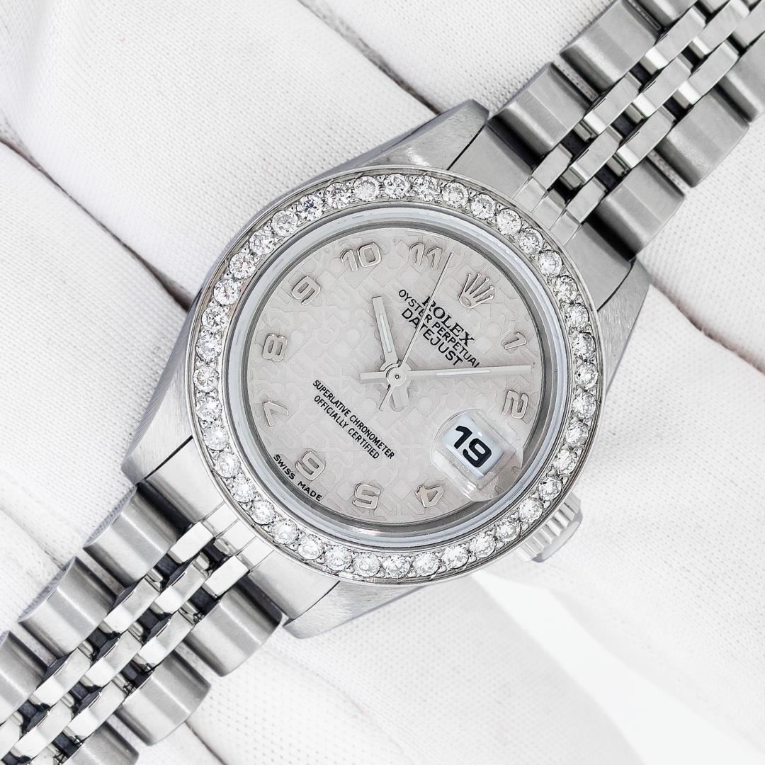 One Ladies Pre Owned Quickset Stainless Steel Rolex Datejust Polished Bright with Satin Finish, Serviced & Electronically Tested, Stainless Steel Case: 26mm, Rolex Stainless Steel Crown, Custom Bezel: New Stainless Steel Bead Set Diamond Bezel, Diamond Count: 40 Diamonds, Clarity: SI-VS, Color: G to H. Custom Crystal: New Sapphire With Magnified Date Window. Custom Hands: New Luminescent Hands. Rolex Movement: Automatic Winding Movement 2235. Rolex Dial: Cream Jubilee With Arabic Hour Markers. Date Window: 3 O'Clock Position Date Display, Model: Datejust. Condition: G-6 Extra Fine. Rolex Bracelet: Stainless Steel Jubilee Band. Bright Polish & Satin Finish. 6.0 Inch Length, Adjustable. Standard Clasp, With Rolex Logo. This Watch Has Been Serviced Time Tested And Is In Excellent Condition It Is Free Of All Scratches And Dents.
