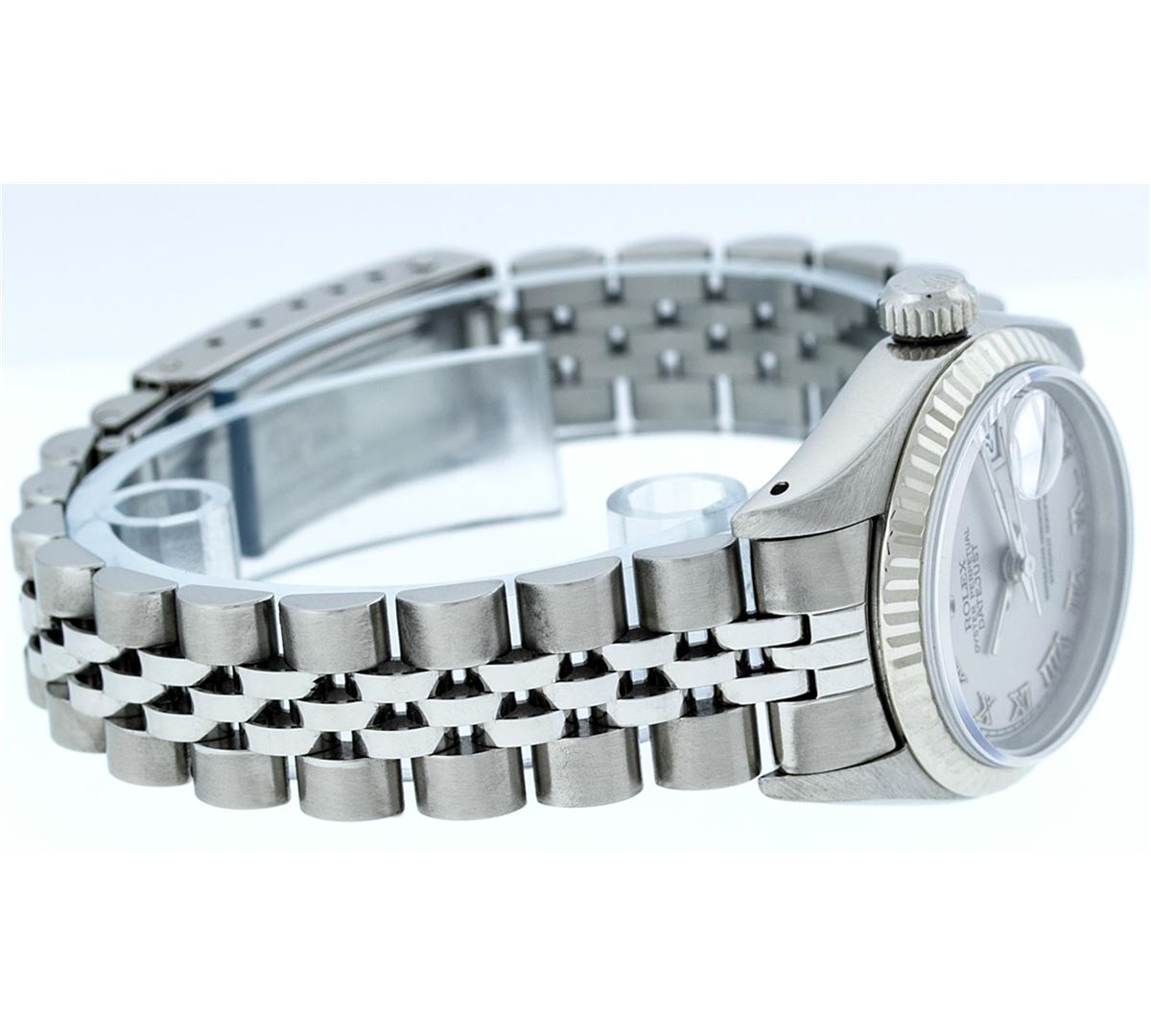 One Ladies Rolex Datejust Polished Bright with Satin Finish, Serviced & Electronically Tested, Stainless Steel Case:26mm, Stainless Steel Crown, Bezel:14K White Gold Fluted. Custom Crystal: Acrylic Cyclops Lens. Movement: Automatic Winding Movement Caliber 2030. Custom Dial: Silver With Roman Hour Markers. Date Window: 3 O'Clock Position Date Display, Model: Datejust. Condition: G-6 Extra Fine. Bracelet: Stainless Steel Jubilee Band. Bright Polish & Satin Finish. 6.0 Inch Length, Adjustable. Standard Clasp, With Rolex Logo.