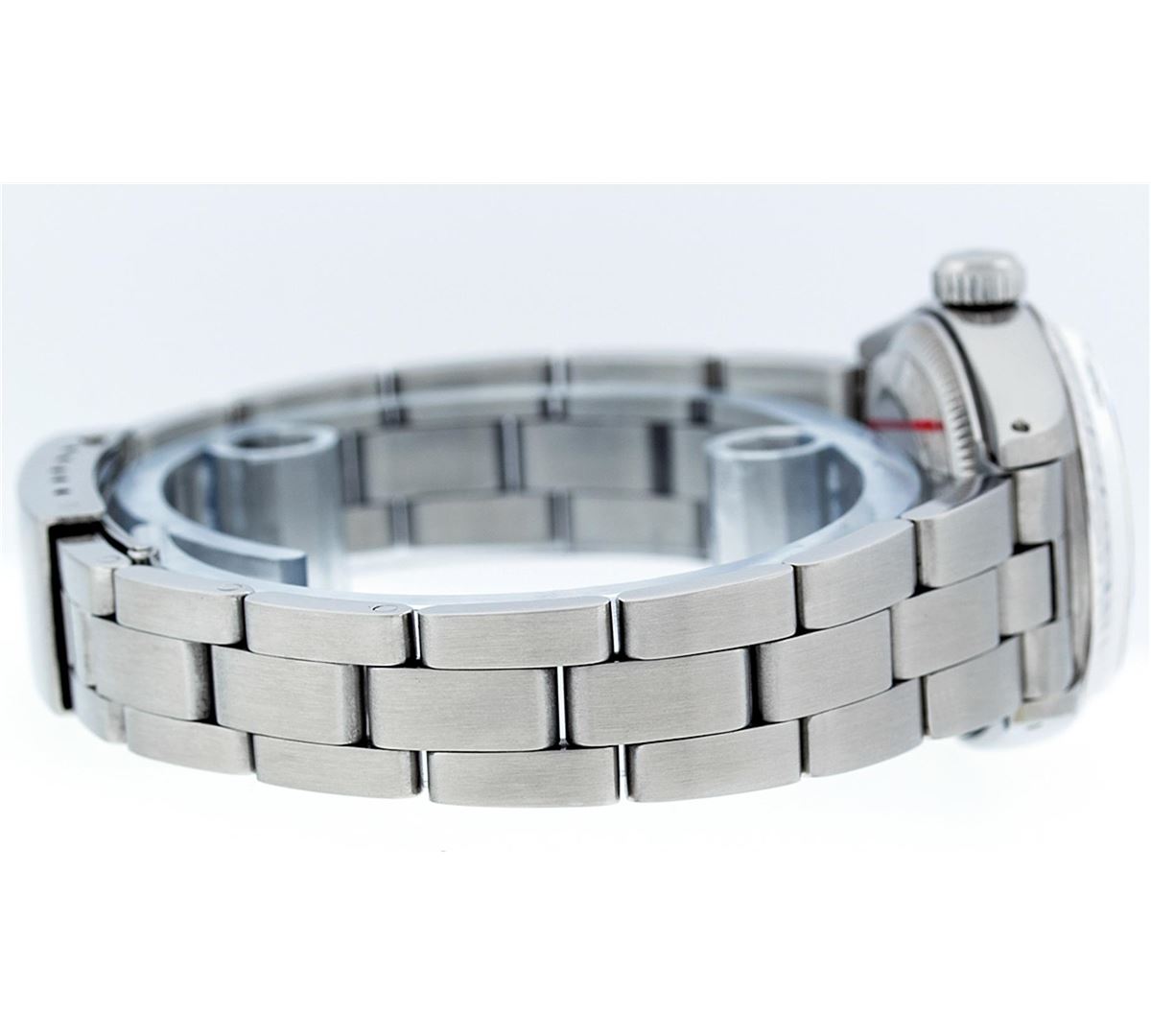 One Ladies Rolex Datejust Polished Bright with Satin Finish, Serviced & Electronically Tested, Stainless Steel Case:26mm, Stainless Steel Crown, Bezel: 14K White Gold Fluted. Custom Crystal: Acrylic Cyclops Lens. Movement: Automatic Winding Movement Caliber 2030. Custom Dial: Mother Of Pearl With Diamond Hour Markers, Diamond Count: 10 Diamonds, Clarity: SI-VS, Color: G to H. Date Window: 3 O'Clock Position Date Display, Model: Datejust. Condition: G-6 Extra Fine. Bracelet: Stainless Steel Oyster Band. Bright Polish & Satin Finish. 6.0 Inch Length, Adjustable. Standard Clasp, With Rolex Logo.