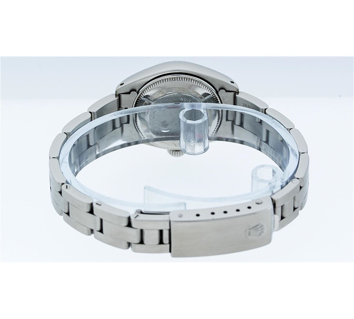 One Ladies Rolex Datejust Polished Bright with Satin Finish, Serviced & Electronically Tested, Stainless Steel Case:26mm, Stainless Steel Crown, Bezel: 14K White Gold Fluted. Custom Crystal: Acrylic Cyclops Lens. Movement: Automatic Winding Movement Caliber 2030. Custom Dial: Mother Of Pearl With Diamond Hour Markers, Diamond Count: 10 Diamonds, Clarity: SI-VS, Color: G to H. Date Window: 3 O'Clock Position Date Display, Model: Datejust. Condition: G-6 Extra Fine. Bracelet: Stainless Steel Oyster Band. Bright Polish & Satin Finish. 6.0 Inch Length, Adjustable. Standard Clasp, With Rolex Logo.