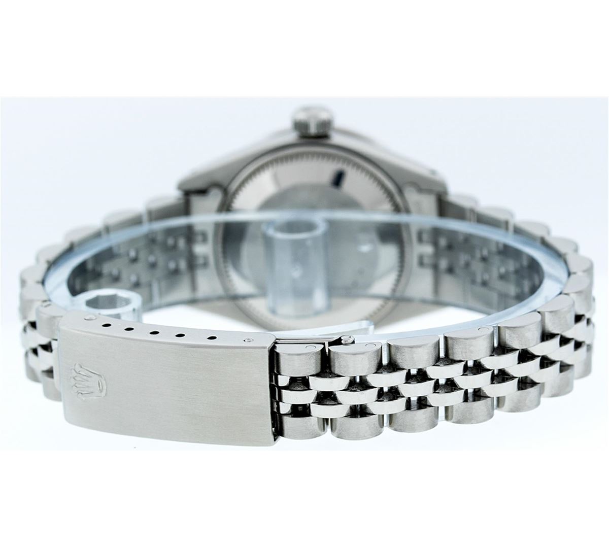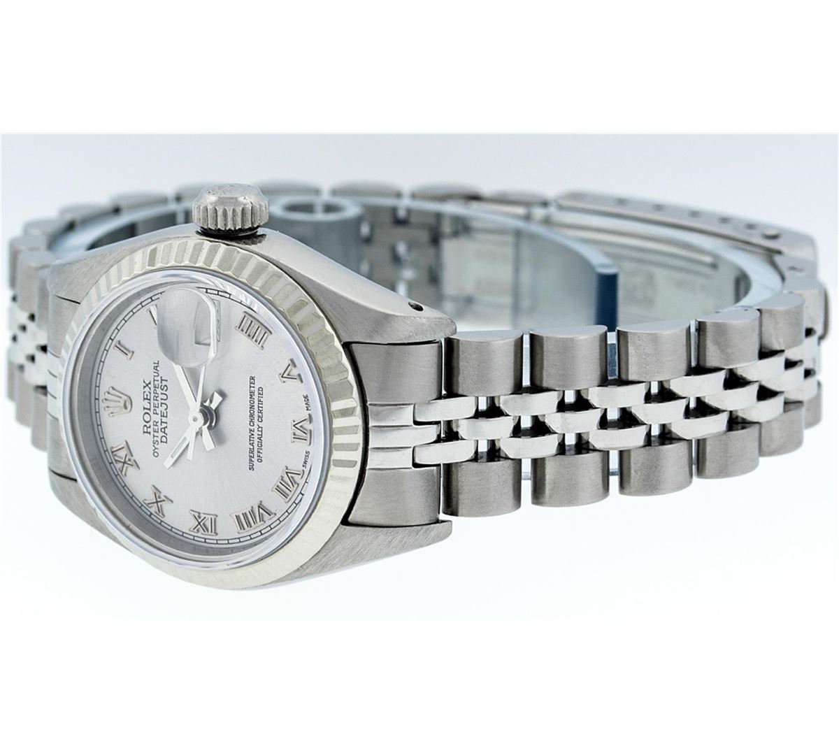 One Ladies Rolex Datejust Polished Bright with Satin Finish, Serviced & Electronically Tested, Stainless Steel Case:26mm, Stainless Steel Crown, Bezel:14K White Gold Fluted. Custom Crystal: Acrylic Cyclops Lens. Movement: Automatic Winding Movement Caliber 2030. Custom Dial: Silver With Roman Hour Markers. Date Window: 3 O'Clock Position Date Display, Model: Datejust. Condition: G-6 Extra Fine. Bracelet: Stainless Steel Jubilee Band. Bright Polish & Satin Finish. 6.0 Inch Length, Adjustable. Standard Clasp, With Rolex Logo.