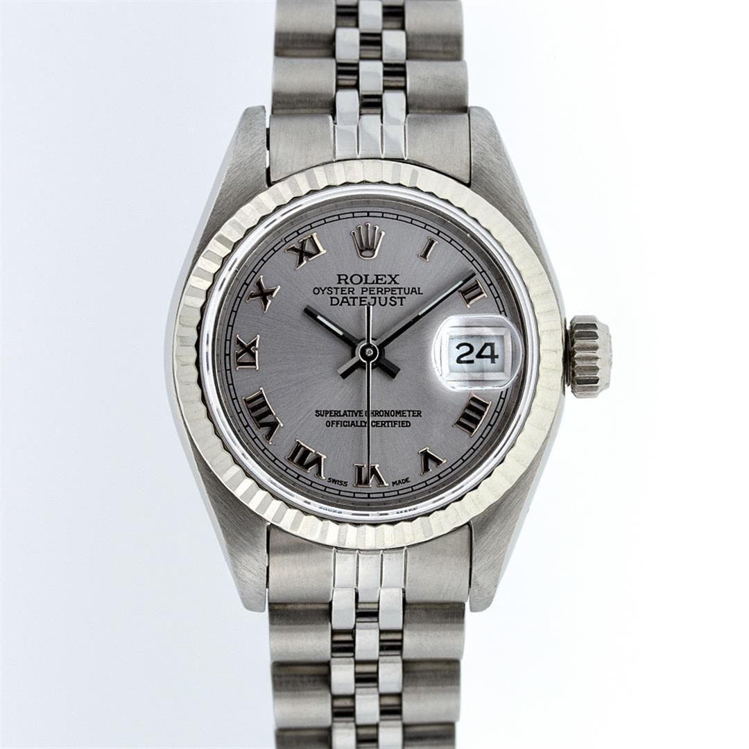 One Ladies Rolex Datejust Polished Bright with Satin Finish, Serviced & Electronically Tested, Stainless Steel Case:26mm, Stainless Steel Crown, Bezel: 14K White Gold Fluted. Custom Crystal: Acrylic Cyclops Lens. Movement: Automatic Winding Movement Caliber 2030. Custom Dial:Slate Grey With Roman Hour Markers. Date Window: 3 O'Clock Position Date Display, Model: Datejust. Condition: G-6 Extra Fine. Bracelet: Stainless Steel Jubilee Band. Bright Polish & Satin Finish. 6.0 Inch Length, Adjustable. Standard Clasp, With Rolex Logo.