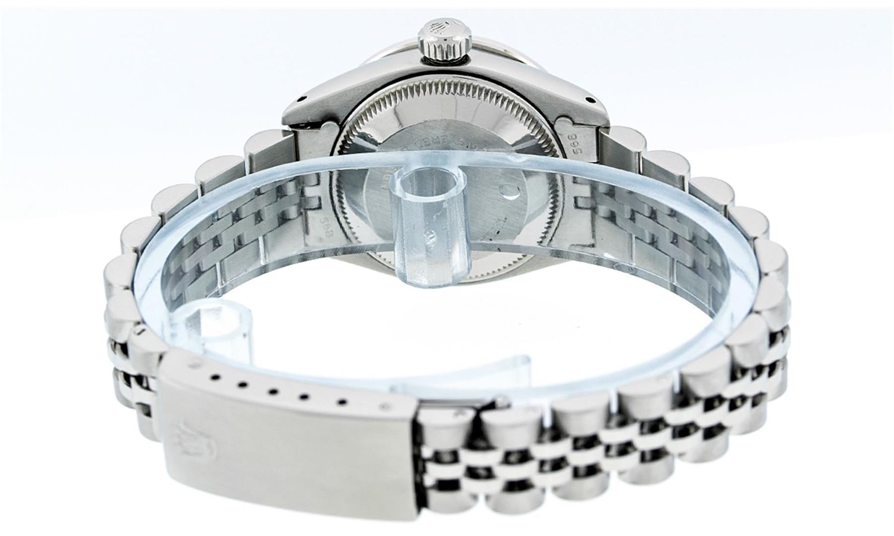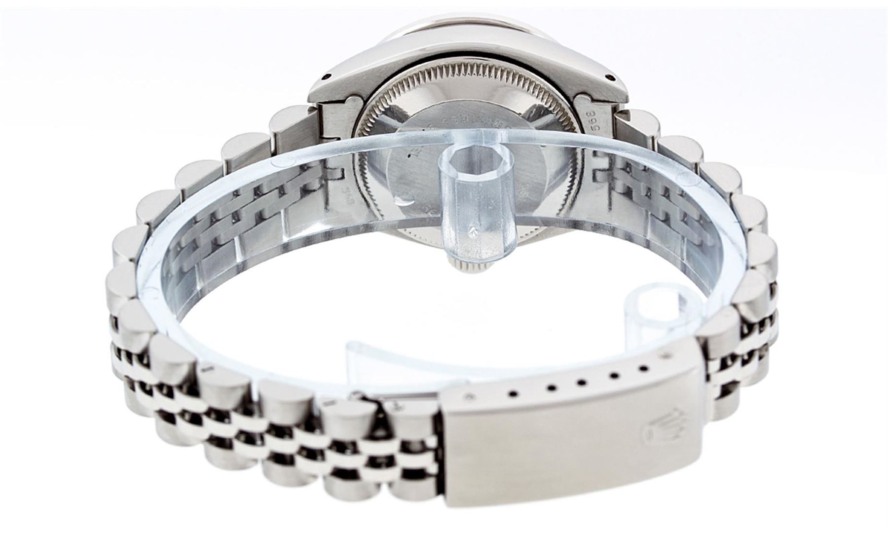 One Ladies Rolex Datejust Polished Bright with Satin Finish, Serviced & Electronically Tested, Stainless Steel Case:26mm, Stainless Steel Crown, Bezel: 14K White Gold Fluted. Custom Crystal: Acrylic Cyclops Lens. Movement: Automatic Winding Movement Caliber 2030. Custom Dial:Slate Grey With Roman Hour Markers. Date Window: 3 O'Clock Position Date Display, Model: Datejust. Condition: G-6 Extra Fine. Bracelet: Stainless Steel Jubilee Band. Bright Polish & Satin Finish. 6.0 Inch Length, Adjustable. Standard Clasp, With Rolex Logo.