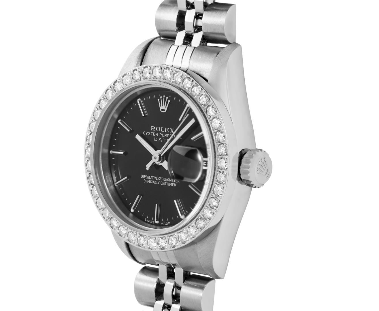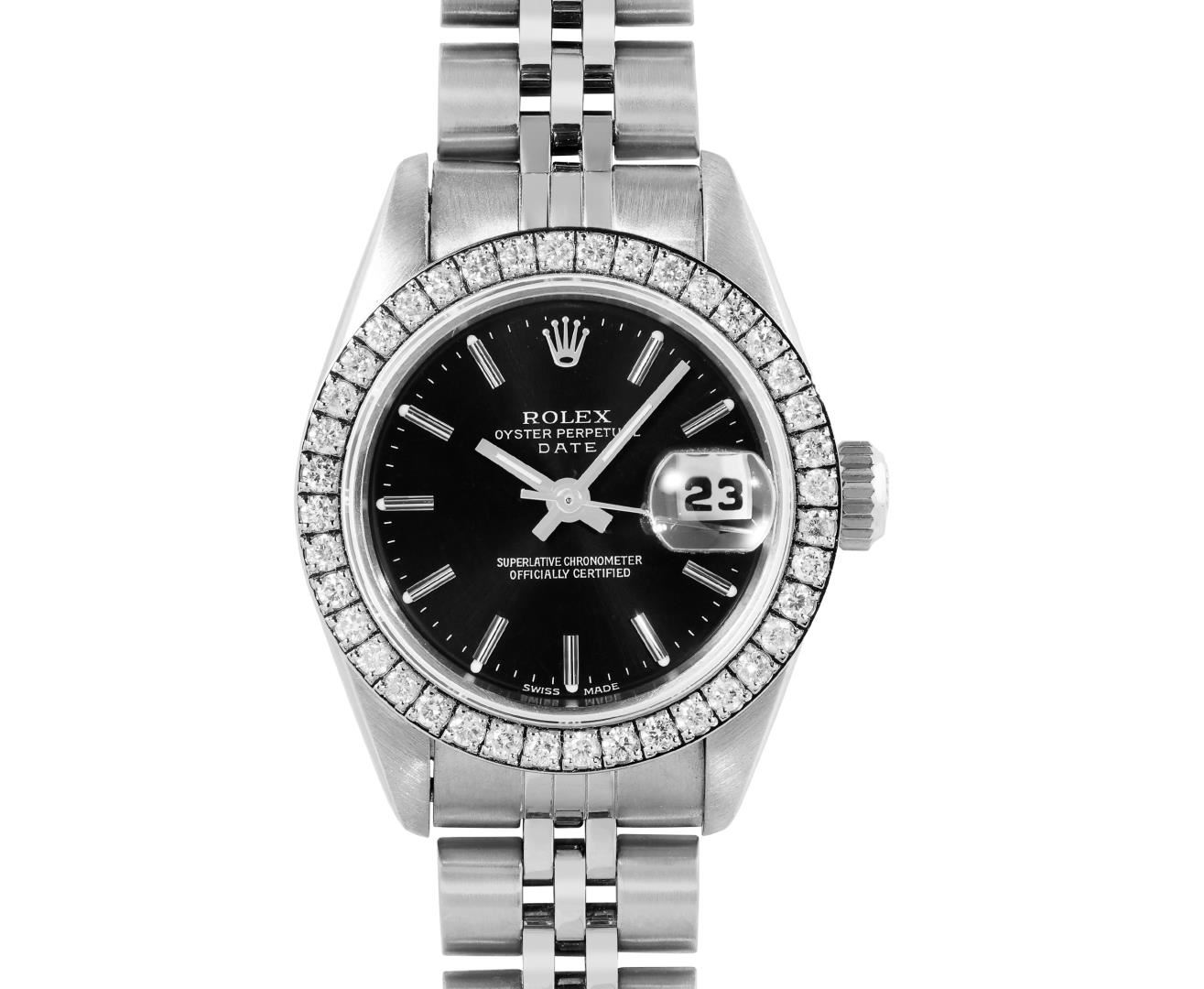 One Rolex Ladies Quickset Pre Owned Stainless Steel Date Wristwatch Polished Bright with Satin Finish, Serviced & Electronically Tested, Stainless Steel Case: 26mm, Stainless Steel Crown, Custom Bezel: New Stainless Steel Beadset Diamond Bezel, Diamond Count: 40 Diamonds On Bezel. Custom Crystal: New Sapphire With Magnified Date Window. Hands: Luminescent Hands. Rolex Movement: 2235 Automatic Winding Movement. Rolex Dial: Factory Black Dial With Index Hour Markers And Lumi Dots. Date Window: 3 O'Clock Position Date Display, Model: Quickset Sapphire Date. Condition: G-6 Extra Fine. Rolex Bracelet: Stainless Steel Jubilee Band. Bright Polish & Satin Finish. 6.0 Inch Length, Adjustable. Standard Clasp, With Rolex Logo. This Watch Has Been Serviced And Time Tested. It Is In Excellent Condition, Free Of All Scratches And Dents.