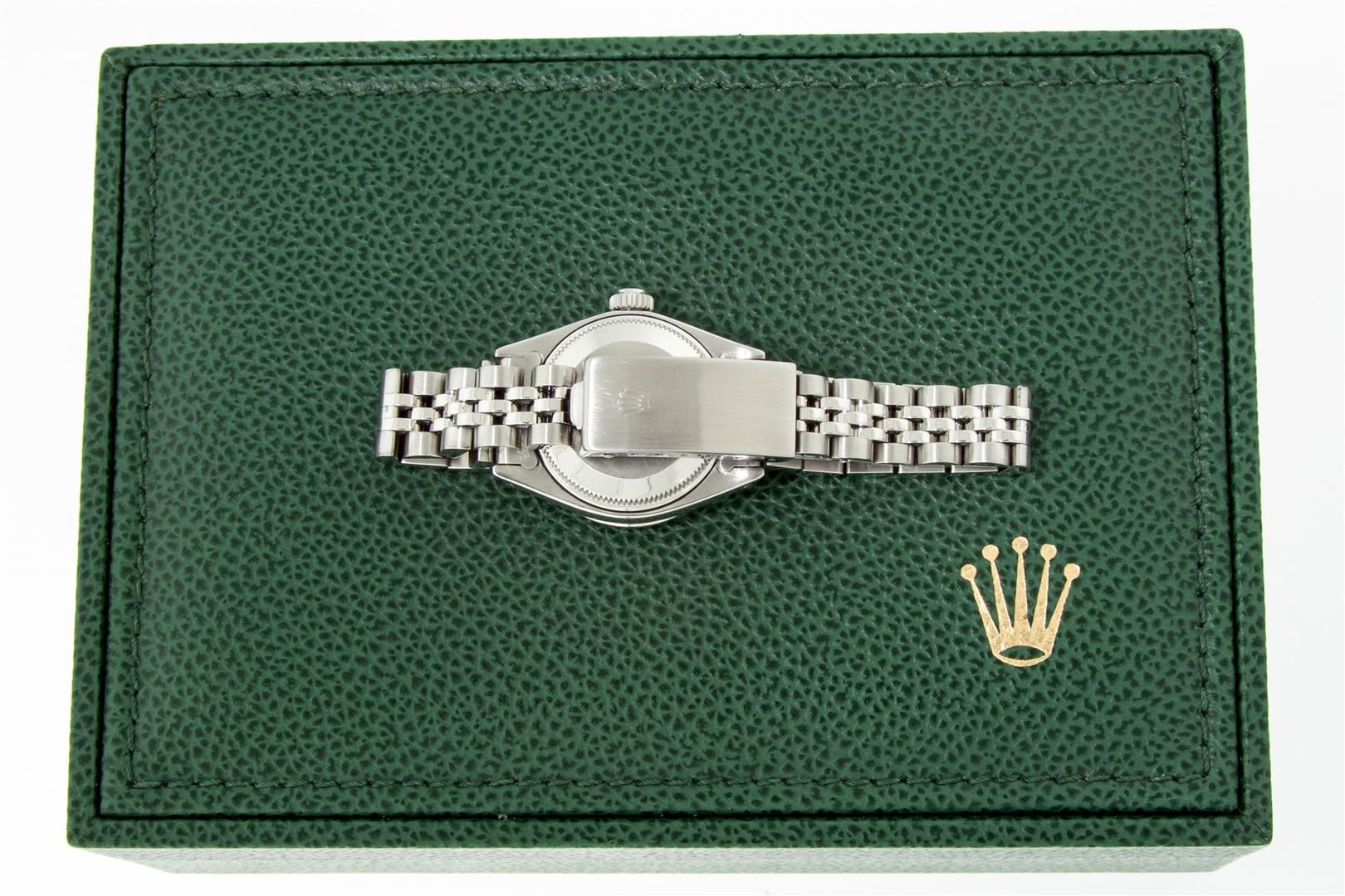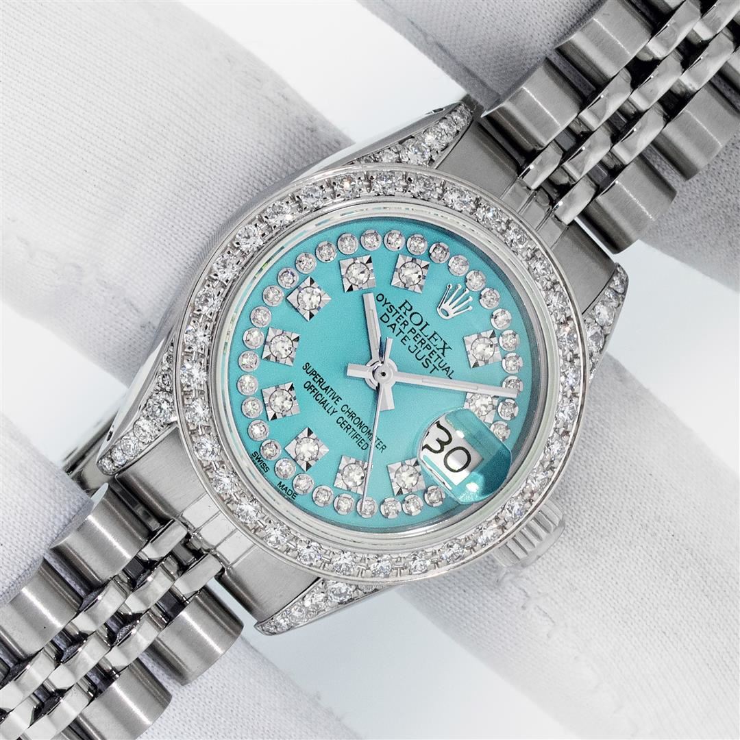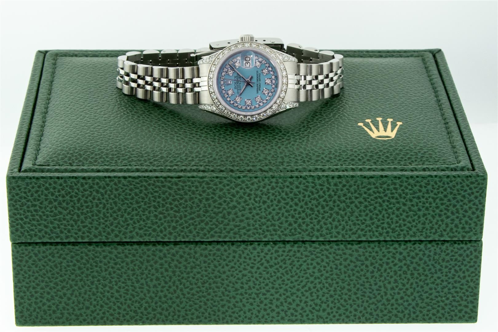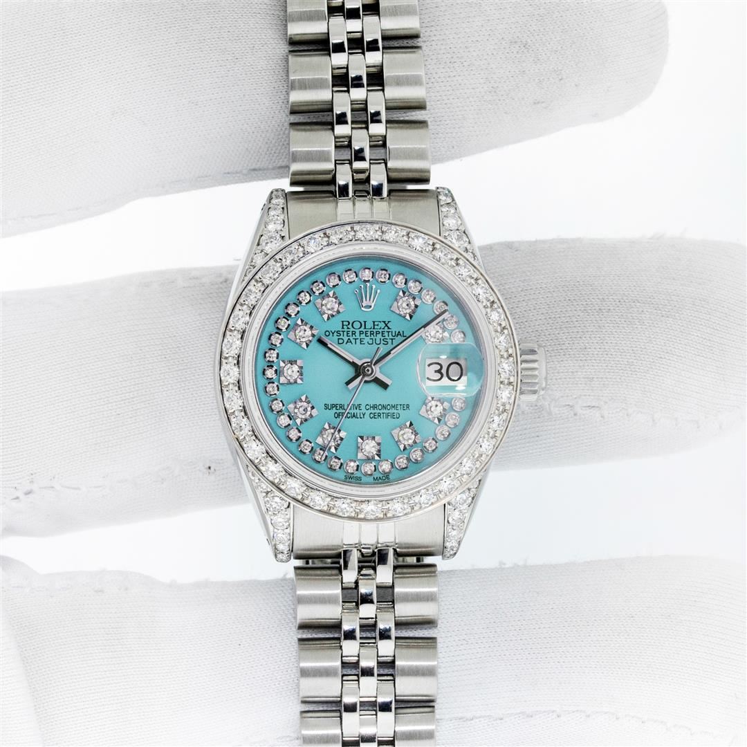 One Ladies Stainless Steel Rolex Datejust Polished Bright with Satin Finish, Serviced & Electronically Tested, Rolex Stainless Steel Case: 26mm, Rolex Stainless Steel Crown, Diamond Lugs: 24 Diamonds On Lugs, Clarity: SI-VS, Color: G to H. Custom Bezel: New 18K White Gold Beadset Diamond Bezel, Stone Count: 32 Diamonds, Total Weight .70 Carat, Clarity: SI-VS, Color: G to H. Custom Crystal: New Sapphire With Magnified Date Window. Custom Hands: New Luminescent Hands. Rolex Movement: Automatic Winding Movement. Custom Dial: Refinished To Blue With Custom Added Diamond Hour Markers, 43 Diamonds in Dial G To H In Color, Clarity: VS. Date Window: 3 O'clock Position Date Display, Model: Datejust. Condition: G-6 Extra Fine. Rolex Bracelet: Stainless Steel Jubilee Band. Bright Polish & Satin Finish. 6.0 Inch Length, Adjustable. Standard Clasp, With Rolex Logo. This Pre Owned Watch Has Been Serviced Time Tested And Is In Excellent Condition It Is Free Of All Scratches And Dents. This Watch Comes With A Rolex Box.