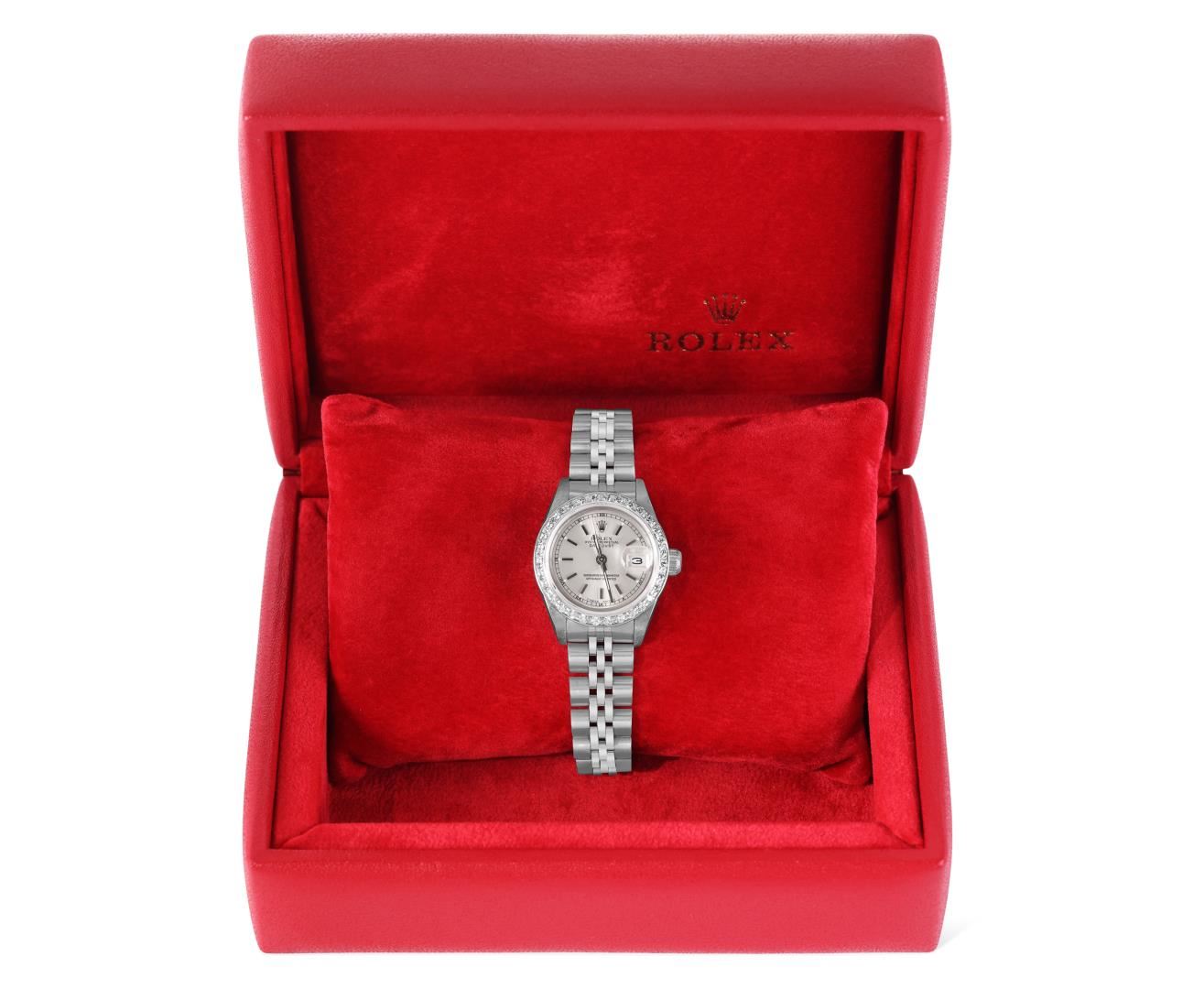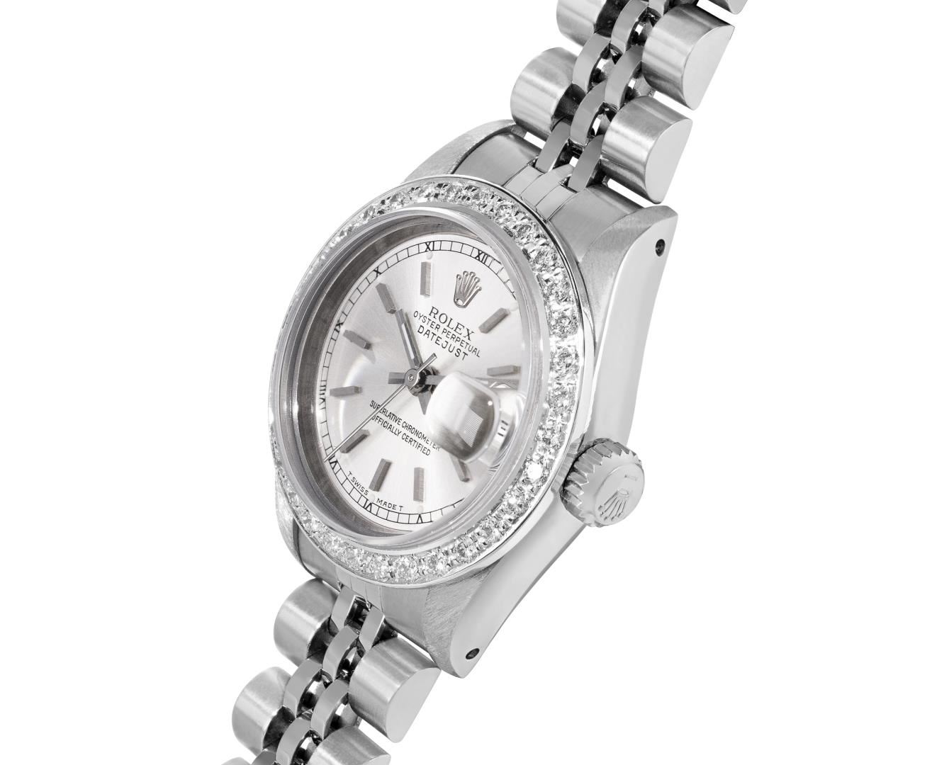 One Rolex Ladies Pre Owned Stainless Steel Datejust Wristwatch Polished Bright with Satin Finish, Serviced & Electronically Tested, Stainless Steel Case: 26mm, Stainless Steel Crown, Custom Bezel: New 18K White Gold Beadset Diamond Bezel, Diamond Count: 32 Diamonds, Total Weight .70 Carat, Clarity: SI-VS, Color: G to H. Custom Crystal: New Sapphire With Magnified Date Window. Custom Hands: New Luminescent Hands. Rolex Movement: 2135 Automatic Winding Movement. Rolex Dial: Factory Silver Dial With Index Hour Markers, Square Roman Track, And Lumi Dots. Date Window: 3 O'Clock Position Date Display, Model: Datejust. Condition: G-6 Extra Fine. Rolex Bracelet: Stainless Steel Jubilee Band. Bright Polish & Satin Finish. 6.0 Inch Length, Adjustable. Standard Clasp, With Rolex Logo. This Watch Has Been Serviced And Time Tested. It Is In Excellent Condition, Free Of All Scratches And Dents. This Watch Comes With A Rolex Box.