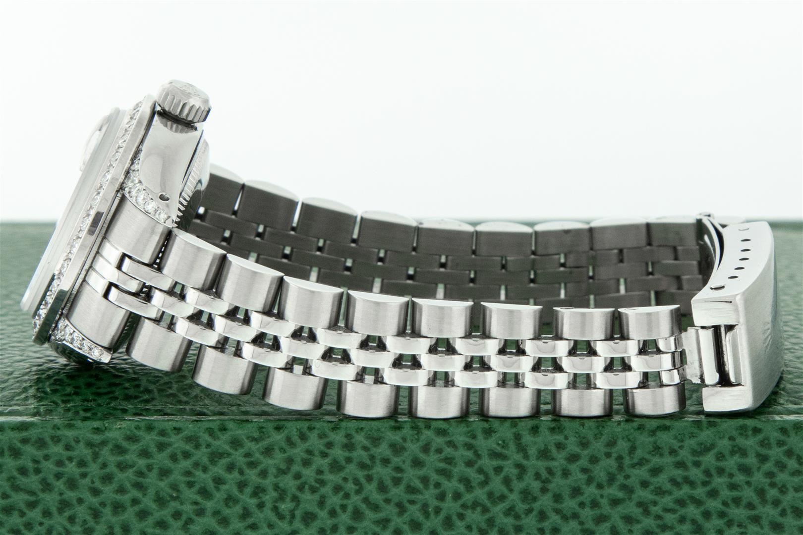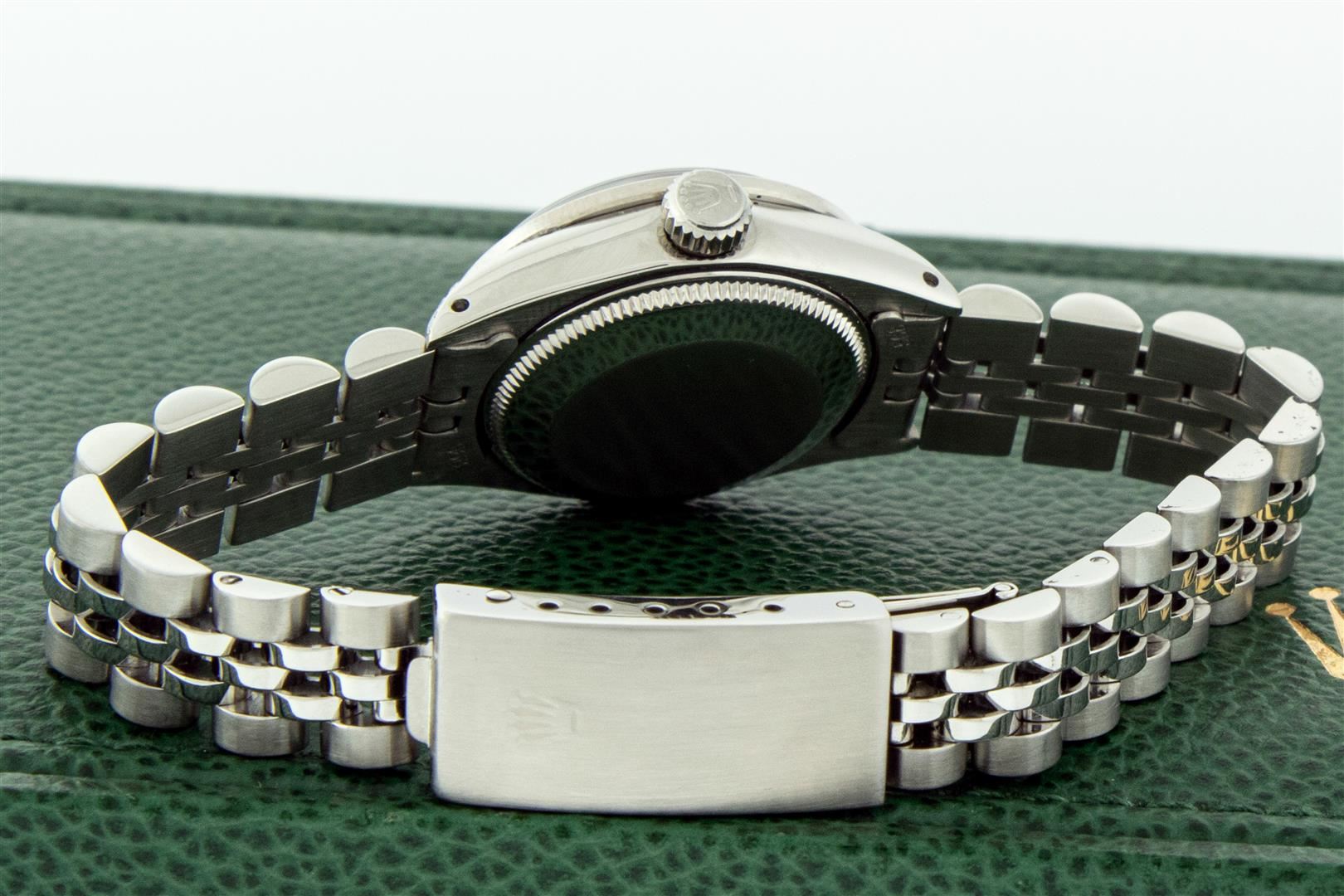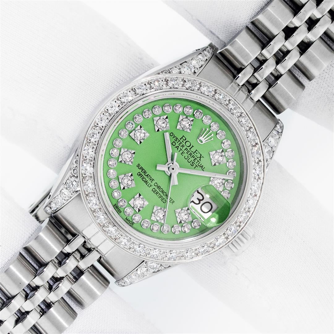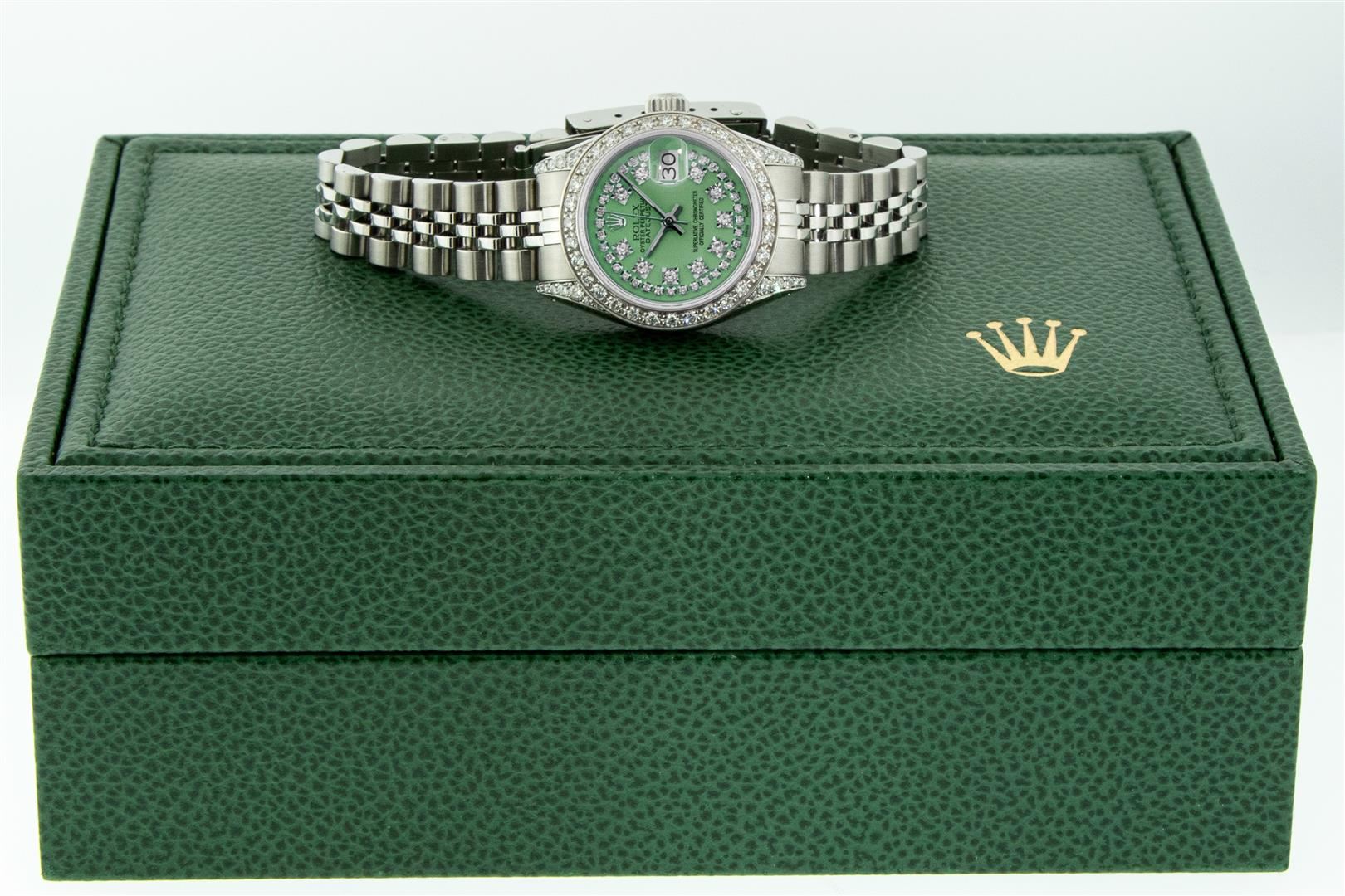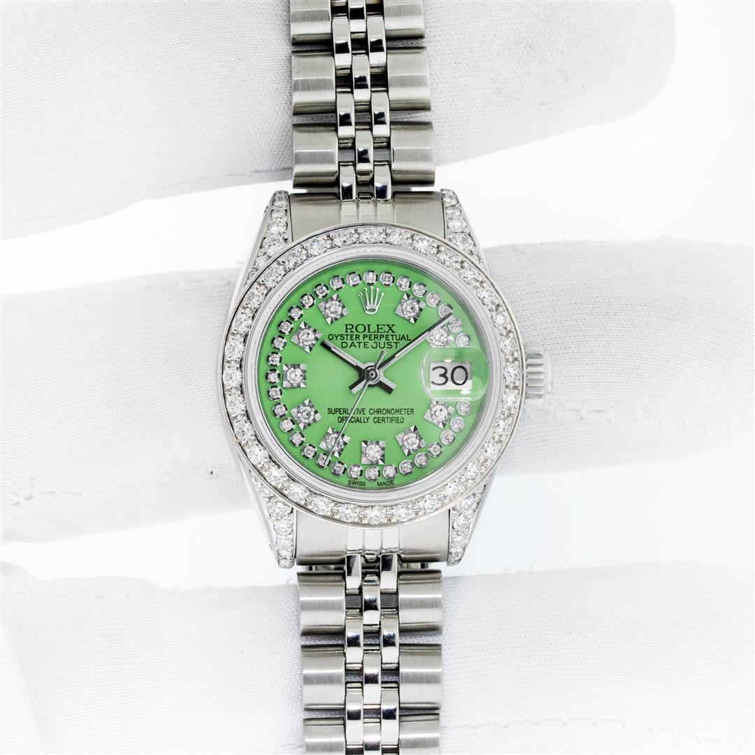 One Ladies Stainless Steel Rolex Datejust Polished Bright with Satin Finish, Serviced & Electronically Tested, Rolex Stainless Steel Case: 26mm, Rolex Stainless Steel Crown, Diamond Lugs: 24 Diamonds On Lugs, Clarity: SI-VS, Color: G to H. Custom Bezel: New 18K White Gold Beadset Diamond Bezel, Stone Count: 32 Diamonds, Clarity: SI-VS, Color: G to H. Custom Crystal: New Sapphire with Magnified Date Window. Custom Hands: New Luminescent Hands. Rolex Movement: Automatic Winding Movement. Custom Dial: Refinished To Green with Custom Added Diamond Hour Markers, 43 Diamonds in Dial G To H In Color, Clarity: VS. Date Window: 3 O'Clock Position Date Display, Model: Datejust. Condition: G-6 Extra Fine. Rolex Bracelet: Stainless Steel Jubilee Band. Bright Polish & Satin Finish. 6.0 Inch Length, Adjustable. Standard Clasp, with Rolex Logo. This Pre Owned Watch Has Been Serviced Time Tested And Is In Excellent Condition It Is Free Of All Scratches And Dents. This Watch Comes with A Rolex Box.