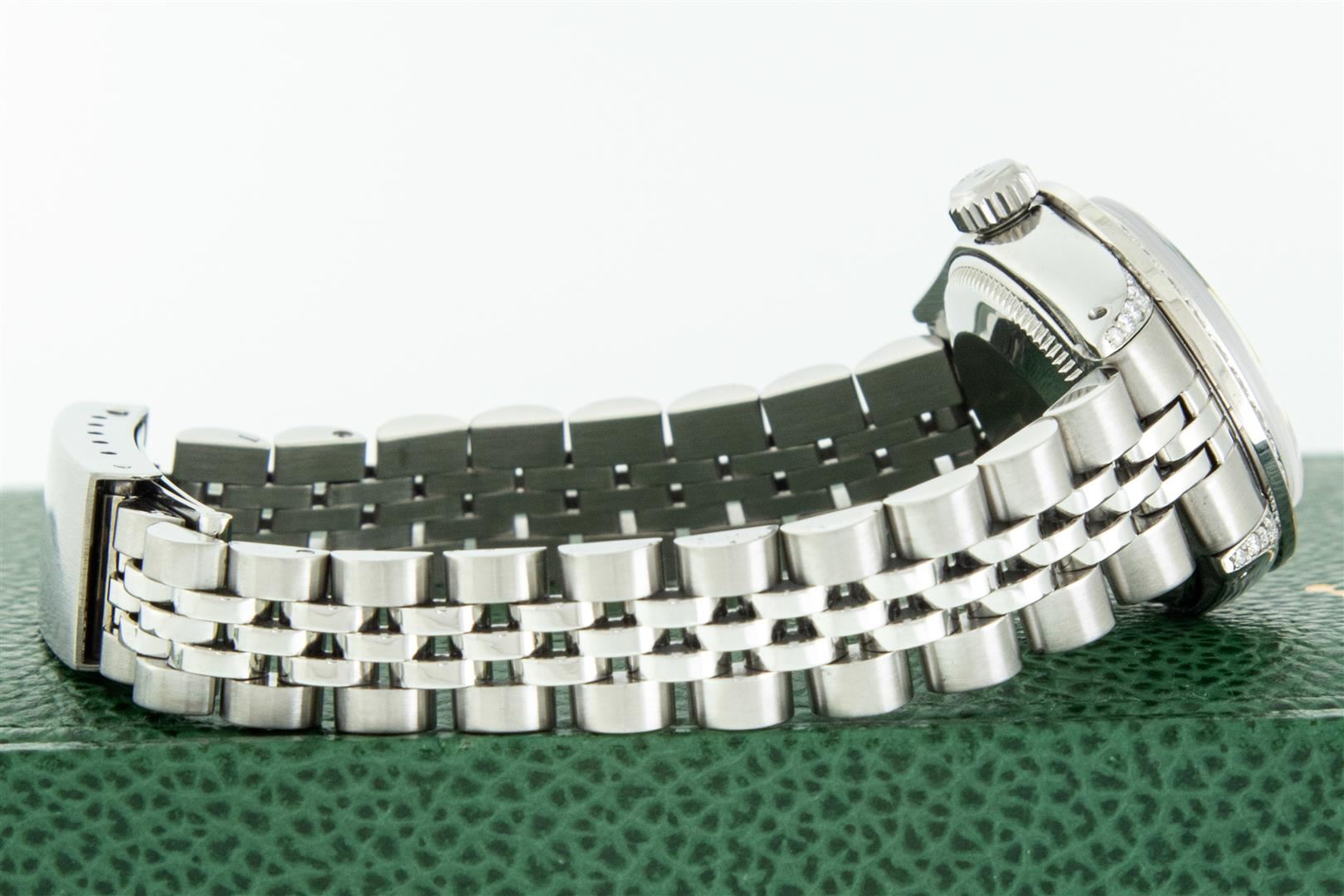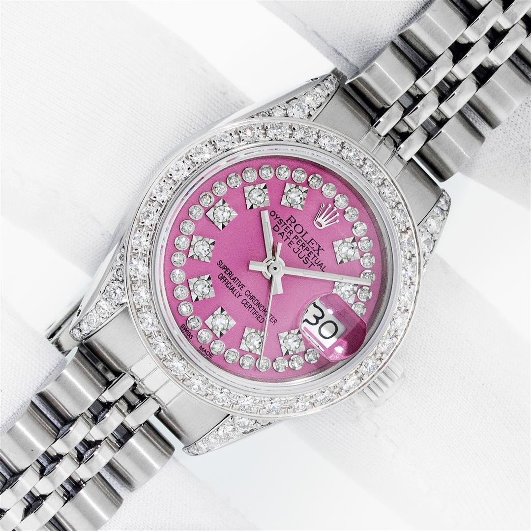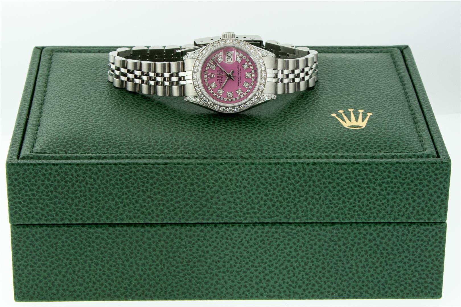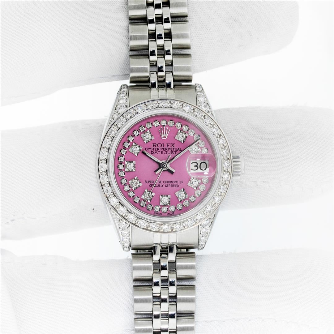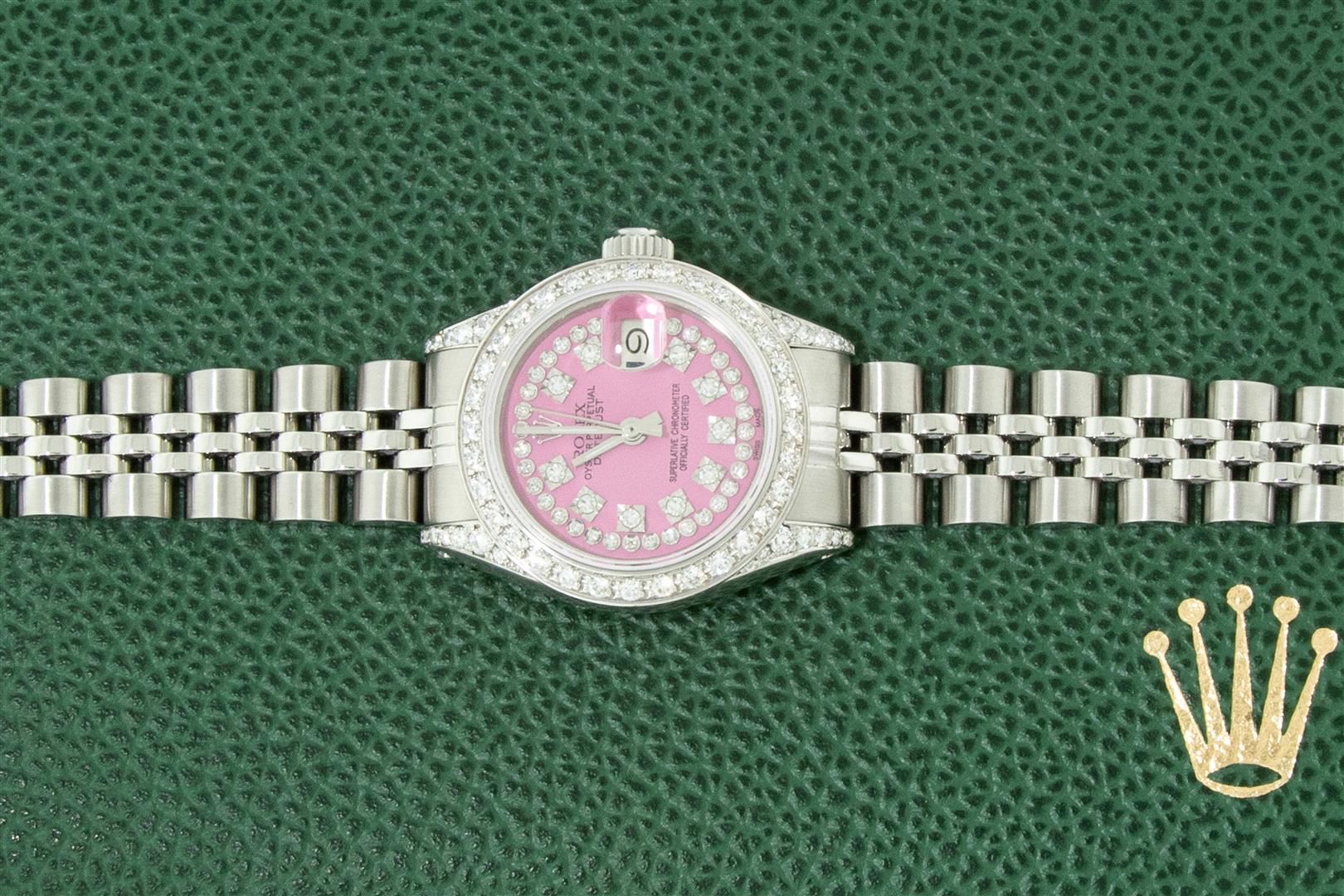 One Ladies Stainless Steel Rolex Datejust Polished Bright with Satin Finish, Serviced & Electronically Tested, Rolex Stainless Steel Case: 26mm, Rolex Stainless Steel Crown, Custom Diamond Lugs: 24 Diamonds On Lugs, Clarity: SI-VS, Color: G to H. Custom Bezel: New 18K White Gold Beadset Diamond Bezel, Stone Count: 32 Diamonds, Clarity: SI-VS, Color: G to H. Custom Crystal: New Sapphire with Magnified Date Window. Custom Hands: New Luminescent Hands. Rolex Movement: Automatic Winding Movement. Custom Dial: Pink with Custom Added Diamonds, 43 Diamonds in Dial G To H In Color, Clarity: VS. Date Window: 3 O'Clock Position Date Display, Model: Datejust. Condition: G-6 Extra Fine. Rolex Bracelet: Stainless Steel Jubilee Band. Bright Polish & Satin Finish. 6.0 Inch Length, Adjustable. Standard Clasp, with Rolex Logo. This Pre Owned Watch Has Been Serviced Time Tested And Is In Excellent Condition It Is Free Of All Scratches And Dents. This Watch Comes with A Rolex Box.