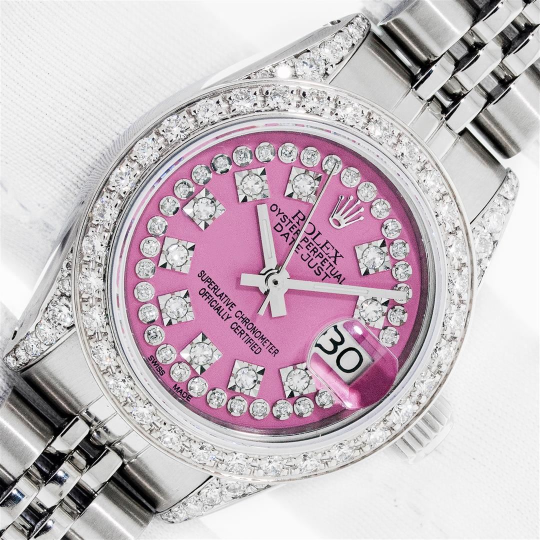 One Ladies Stainless Steel Rolex Datejust Polished Bright with Satin Finish, Serviced & Electronically Tested, Rolex Stainless Steel Case: 26mm, Rolex Stainless Steel Crown, Custom Diamond Lugs: 24 Diamonds On Lugs, Clarity: SI-VS, Color: G to H. Custom Bezel: New 18K White Gold Beadset Diamond Bezel, Stone Count: 32 Diamonds, Clarity: SI-VS, Color: G to H. Custom Crystal: New Sapphire with Magnified Date Window. Custom Hands: New Luminescent Hands. Rolex Movement: Automatic Winding Movement. Custom Dial: Pink with Custom Added Diamonds, 43 Diamonds in Dial G To H In Color, Clarity: VS. Date Window: 3 O'Clock Position Date Display, Model: Datejust. Condition: G-6 Extra Fine. Rolex Bracelet: Stainless Steel Jubilee Band. Bright Polish & Satin Finish. 6.0 Inch Length, Adjustable. Standard Clasp, with Rolex Logo. This Pre Owned Watch Has Been Serviced Time Tested And Is In Excellent Condition It Is Free Of All Scratches And Dents. This Watch Comes with A Rolex Box.