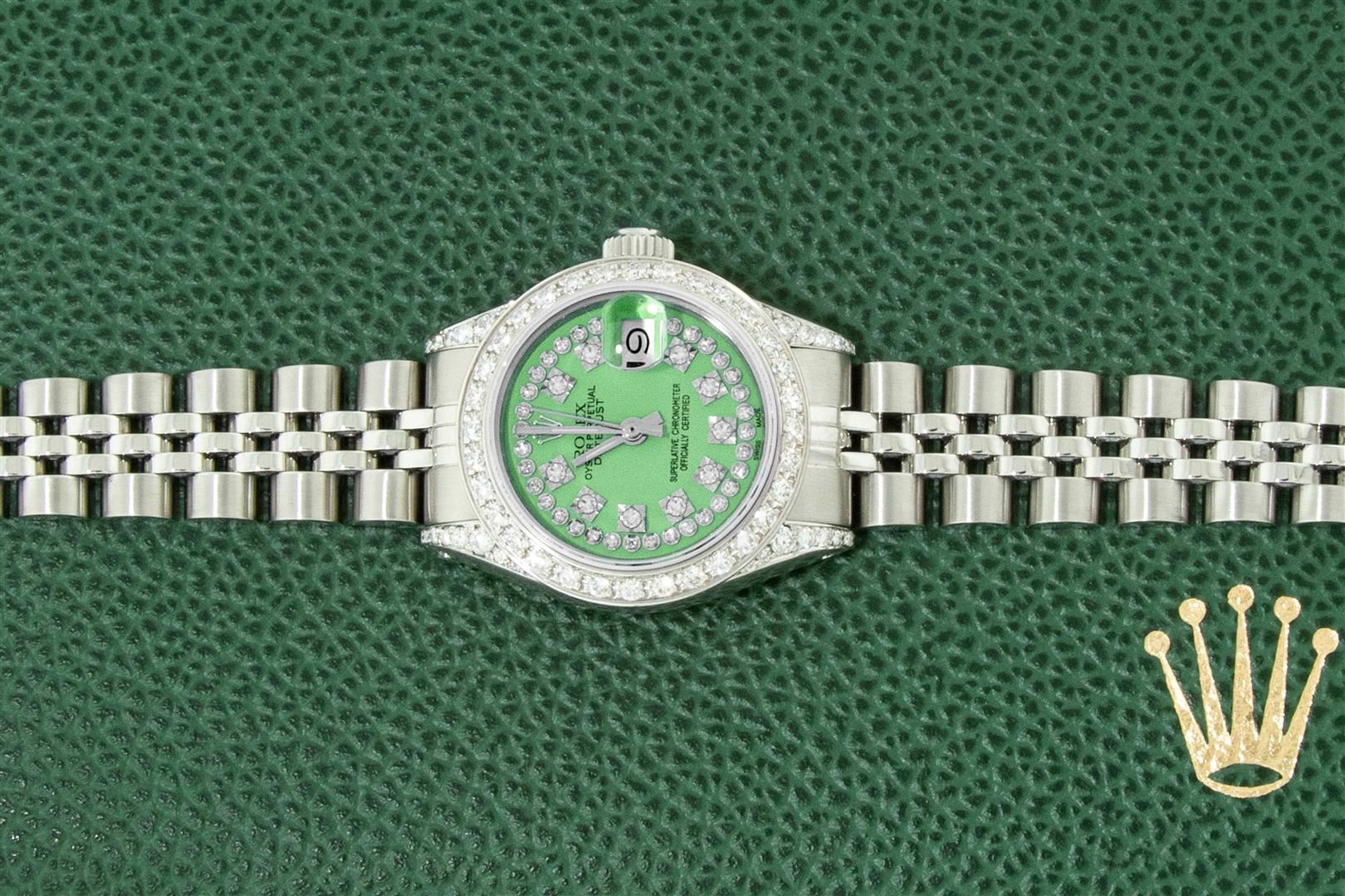 One Ladies Stainless Steel Rolex Datejust Polished Bright with Satin Finish, Serviced & Electronically Tested, Rolex Stainless Steel Case: 26mm, Rolex Stainless Steel Crown, Diamond Lugs: 24 Diamonds On Lugs, Clarity: SI-VS, Color: G to H. Custom Bezel: New 18K White Gold Beadset Diamond Bezel, Stone Count: 32 Diamonds, Clarity: SI-VS, Color: G to H. Custom Crystal: New Sapphire with Magnified Date Window. Custom Hands: New Luminescent Hands. Rolex Movement: Automatic Winding Movement. Custom Dial: Refinished To Green with Custom Added Diamond Hour Markers, 43 Diamonds in Dial G To H In Color, Clarity: VS. Date Window: 3 O'Clock Position Date Display, Model: Datejust. Condition: G-6 Extra Fine. Rolex Bracelet: Stainless Steel Jubilee Band. Bright Polish & Satin Finish. 6.0 Inch Length, Adjustable. Standard Clasp, with Rolex Logo. This Pre Owned Watch Has Been Serviced Time Tested And Is In Excellent Condition It Is Free Of All Scratches And Dents. This Watch Comes with A Rolex Box.