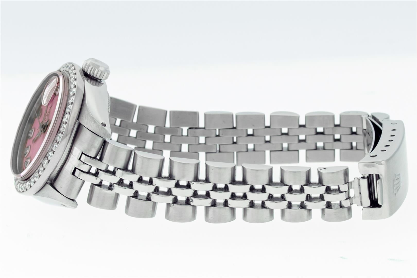 One Ladies Stainless Steel Rolex Datejust Polished Bright with Satin Finish, Serviced & Electronically Tested, Rolex Stainless Steel Case: 26mm, Rolex Stainless Steel Crown, Custom Bezel: New Stainless Steel Beadset Diamond Bezel, Diamond Count: 44 Diamonds Total, Clarity: SI-VS, Color: G to H. Custom Crystal: New Sapphire with Magnified Date Window. Custom Hands: New Luminescent Hands. Rolex Movement: Automatic Winding Movement. Custom Dial: Refinished To Pink with Custom Added Diamond Hour Markers, Diamond Count: 10 Diamonds in Dial G To H In Color, Clarity: SI-VS. Date Window: 3 O'Clock Position Date Display, Model: Datejust. Condition: G-6 Extra Fine. Rolex Bracelet: Stainless Steel Jubilee Band. Bright Polish & Satin Finish. 6.0 Inch Length, Adjustable. Standard Clasp, with Rolex Logo. This Pre Owned Watch Has Been Serviced Time Tested And Is In Excellent Condition It Is Free Of All Scratches And Dents.
