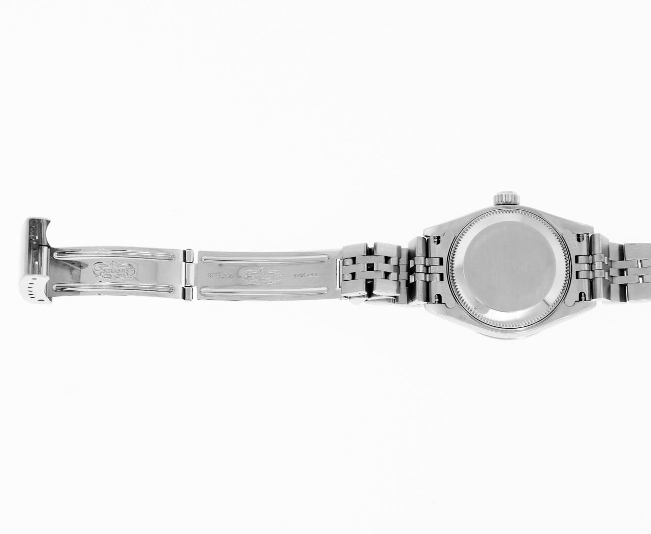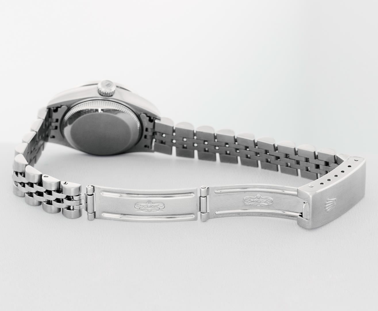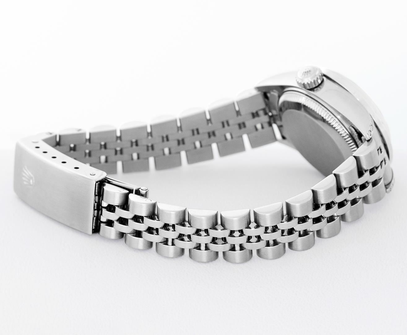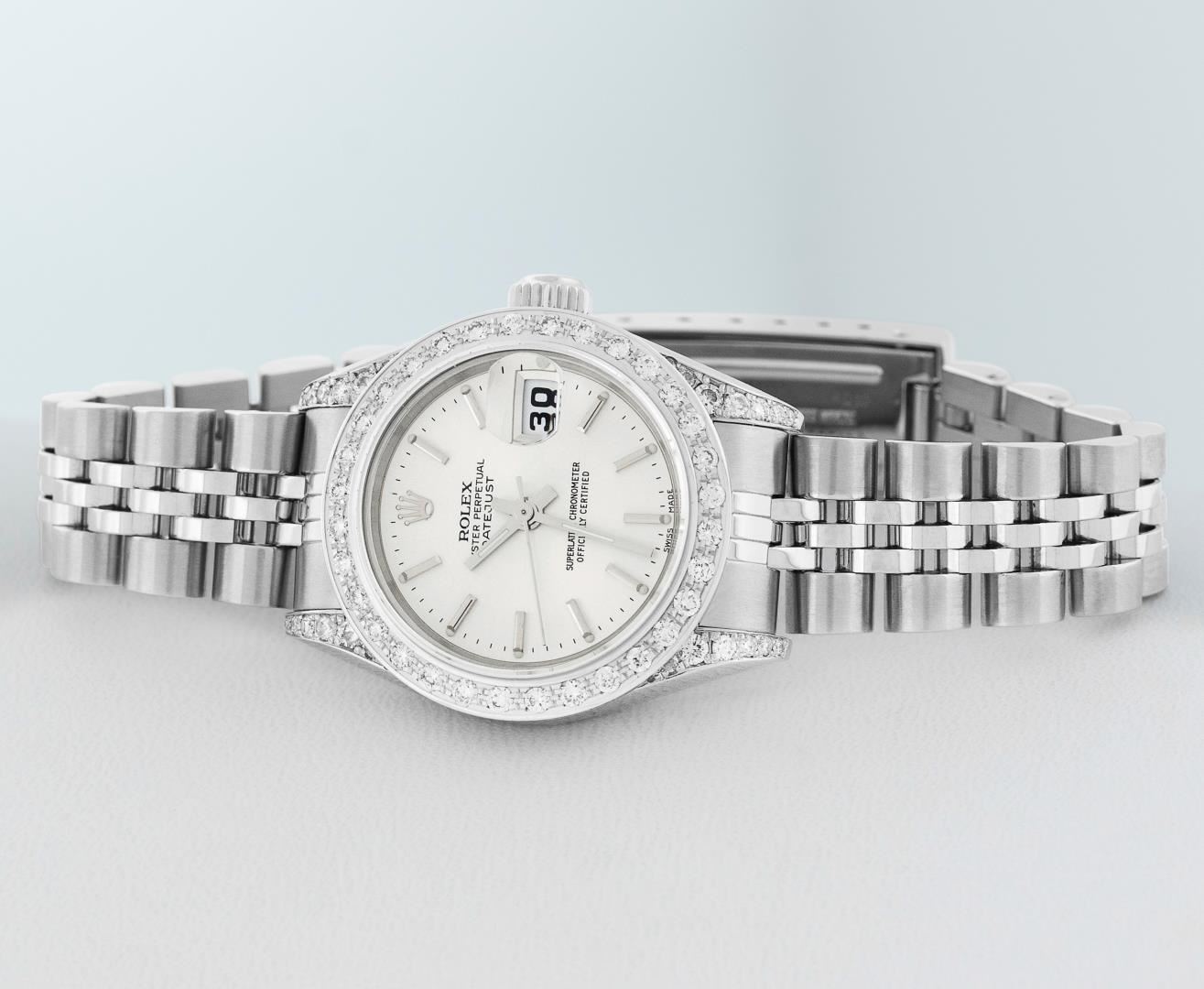 One Ladies Pre Owned Quickset Stainless Steel Rolex Datejust Polished Bright with Satin Finish, Serviced & Electronically Tested, Rolex Stainless Steel Case: 26mm, Custom Diamond Lugs: Added Diamonds On Lugs, Diamond Count: 24 Diamonds On Bezel, Color: G To H, Clarity: SI-VS. Rolex Stainless Steel Crown, Custom Bezel: New 18K White Gold Beadset Diamond Bezel, Stone Count: 32 Diamonds, Diamond Color: G To H, Clarity: SI-VS. Custom Crystal: New Sapphire With Magnified Date Window. Custom Hands: New Lumi Hands. Rolex Movement: Quickset Automatic Winding Movement 2230. Rolex Dial: Silver Index With Dash Track And Lumi Dots. Date Window: 3 O'Clock Position Date Display, Model: Sapphire Quickset Datejust. Condition: G-6 Extra Fine. Rolex Bracelet: Stainless Steel Jubilee Band. Bright Polish & Satin Finish. 6.0 Inch Length, Adjustable. Standard Clasp, With Rolex Logo. This Watch Has Been Serviced Time Tested And Is In Excellent Condition It Is Free Of All Scratches And Dents.
