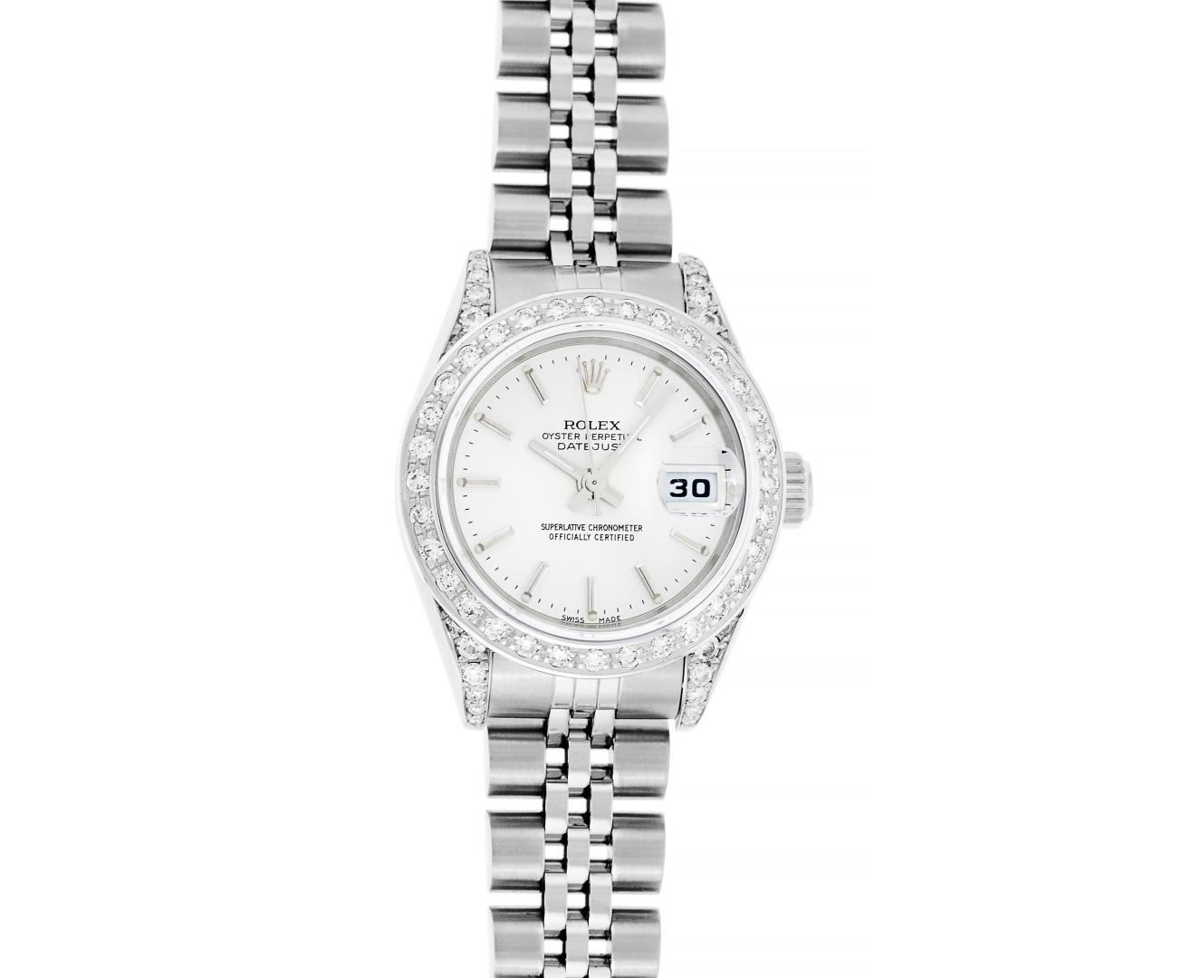 One Ladies Pre Owned Quickset Stainless Steel Rolex Datejust Polished Bright with Satin Finish, Serviced & Electronically Tested, Rolex Stainless Steel Case: 26mm, Custom Diamond Lugs: Added Diamonds On Lugs, Diamond Count: 24 Diamonds On Bezel, Color: G To H, Clarity: SI-VS. Rolex Stainless Steel Crown, Custom Bezel: New 18K White Gold Beadset Diamond Bezel, Stone Count: 32 Diamonds, Diamond Color: G To H, Clarity: SI-VS. Custom Crystal: New Sapphire With Magnified Date Window. Custom Hands: New Lumi Hands. Rolex Movement: Quickset Automatic Winding Movement 2230. Rolex Dial: Silver Index With Dash Track And Lumi Dots. Date Window: 3 O'Clock Position Date Display, Model: Sapphire Quickset Datejust. Condition: G-6 Extra Fine. Rolex Bracelet: Stainless Steel Jubilee Band. Bright Polish & Satin Finish. 6.0 Inch Length, Adjustable. Standard Clasp, With Rolex Logo. This Watch Has Been Serviced Time Tested And Is In Excellent Condition It Is Free Of All Scratches And Dents.