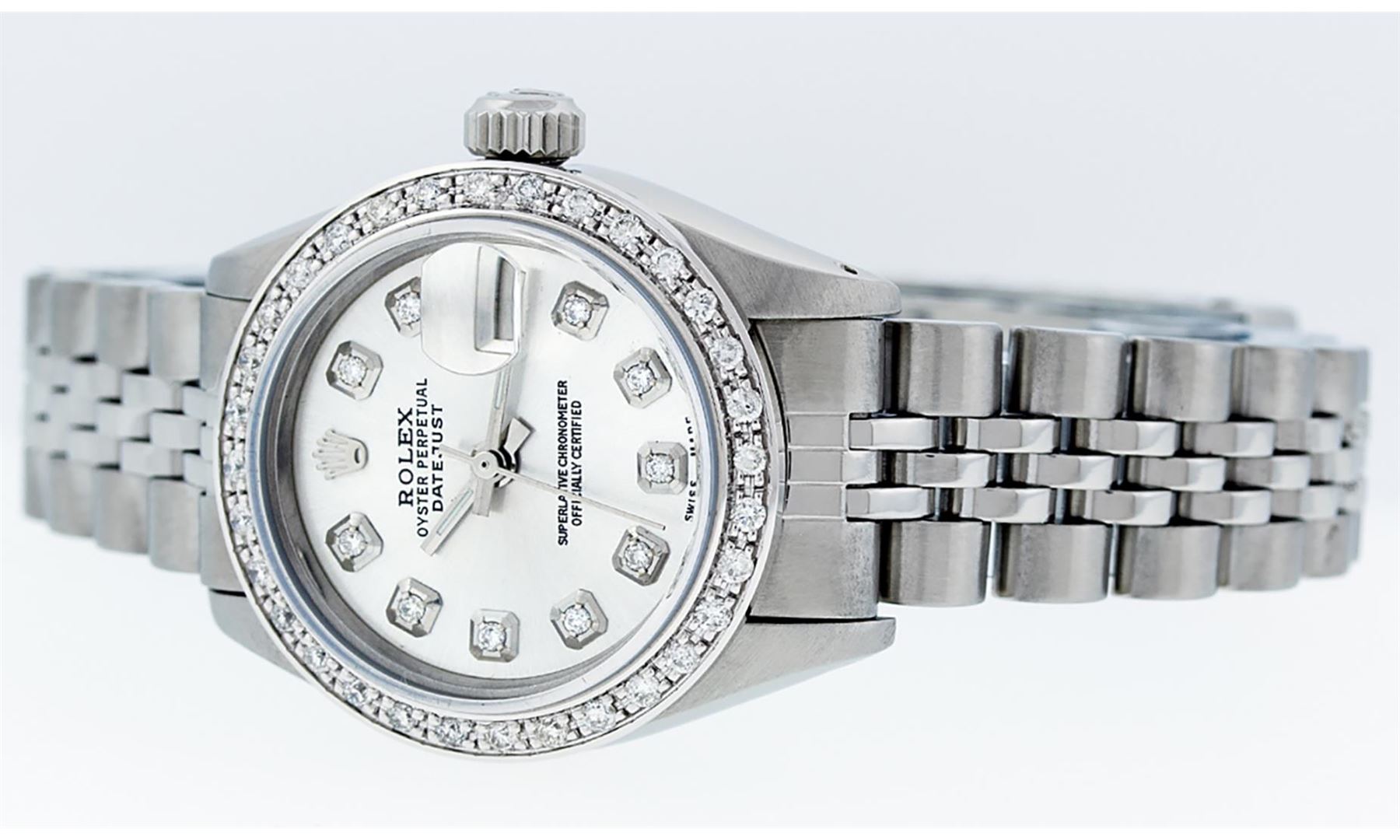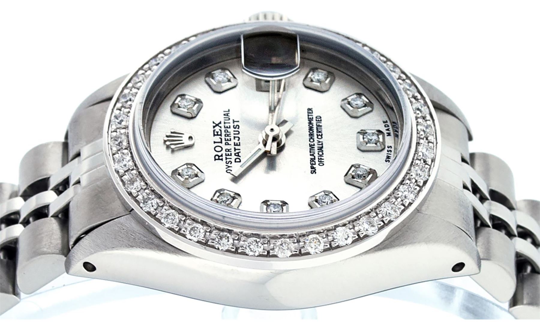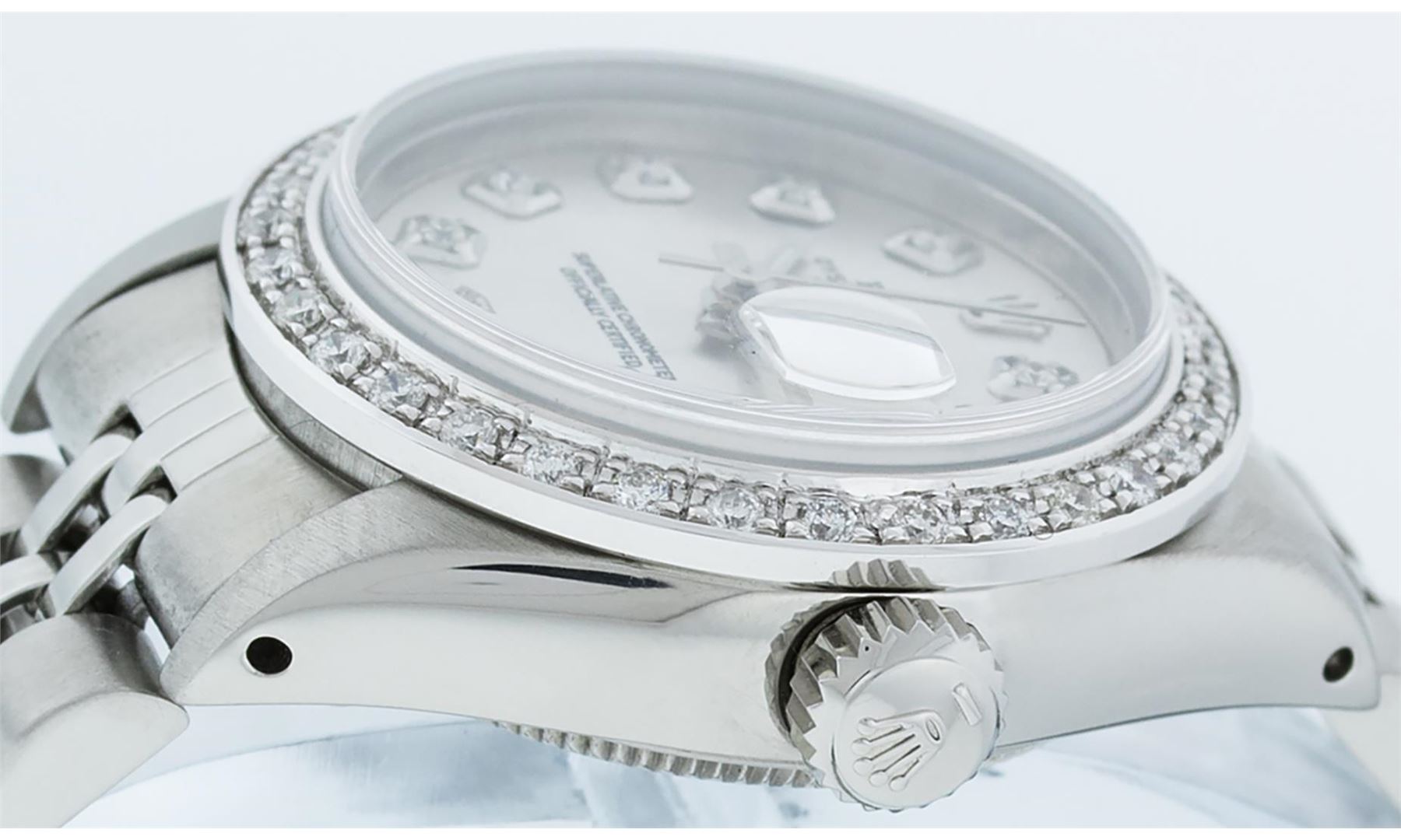 One Ladies Rolex Pre Owned Stainless Steel Rolex Wristwatch Polished Bright with Satin Finish, Serviced & Electronically Tested, Stainless Steel Case: 26mm, Stainless Steel Crown, Custom Bezel: New 18K White Gold Beadset Diamond Bezel, Diamond Count: 32 Diamonds. Custom Crystal: New Sapphire With Date Window. Custom Hands: New Luminescent Hands. Rolex Movement: Automatic Winding Movement 2035. Custom Dial: Custom Silver Dial With Added Diamond Hour Markers, Diamond Count: 10 Diamonds On Dial. Date Window: 3 O'Clock Position Date Display. Condition: G-6 Extra Fine. Rolex Bracelet: Stainless Steel Jubilee Band. Bright Polish & Satin Finish. 6.0 Inch Length, Adjustable. Standard Clasp, With Rolex Logo. This Watch Has Been Serviced Time Tested And Is In Excellent Condition It Is Free Of All Scratches And Dents.
