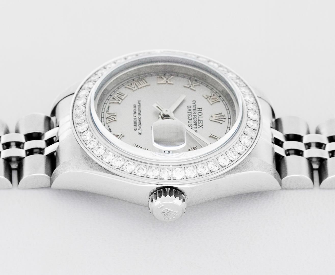 One Ladies Pre Owned Quickset Stainless Steel Rolex Datejust Polished Bright with Satin Finish, Serviced & Electronically Tested, Rolex Stainless Steel Case: 26mm. Rolex Stainless Steel Crown, Custom Bezel: New Stainless Steel Beadset Diamond Bezel, Stone Count: 32 Diamonds On Bezel, Diamond Color: G To H, Clarity: SI-VS. Custom Crystal: New Sapphire With Magnified Date Window. Custom Hands: New Hands. Rolex Movement: Quickset Automatic Winding Movement 2230. Rolex Dial: Gray Roman With Square Track. Date Window: 3 O'Clock Position Date Display, Model: Sapphire Quickset Datejust. Condition: G-6 Extra Fine. Rolex Bracelet: Stainless Steel Jubilee Band. Bright Polish & Satin Finish. 6.0 Inch Length, Adjustable. Standard Clasp, With Rolex Logo. This Watch Has Been Serviced Time Tested And Is In Excellent Condition It Is Free Of All Scratches And Dents.