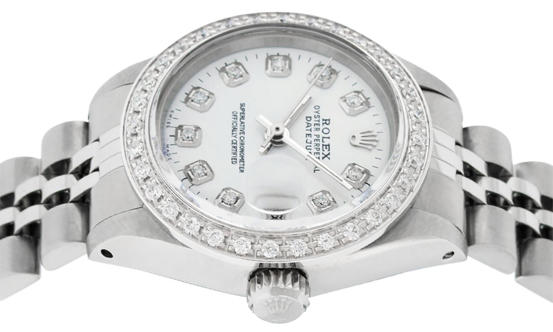 One Ladies Pre Owned Quickset Rolex Stainless Steel Wristwatch Polished Bright with Satin Finish, Serviced And Electronically Tested, Stainless Steel Case: 26mm, Stainless Steel Crown, Custom Bezel: New 18K White Gold Beadset Diamond Bezel, Diamond Count: 32 Diamonds. Custom Crystal: New Sapphire With Date Window. Custom Hands: New Luminescent Hands. Rolex Movement: Automatic Winding Movement 2135. Custom Dial: Custom White Dial With Added Diamonds, Diamond Count: 10 Diamonds On Dial. Date Window: 3 O'Clock Position Date Display, Model: Datejust. Condition: G-6 Extra Fine. Rolex Bracelet: Stainless Steel Jubilee Band. Bright Polish And Satin Finish. 6.0 Inch Length, Adjustable. Standard Clasp, With Rolex Logo. This Watch Has Been Serviced Time Tested And Is In Excellent Condition It Is Free Of All Scratches And Dents.