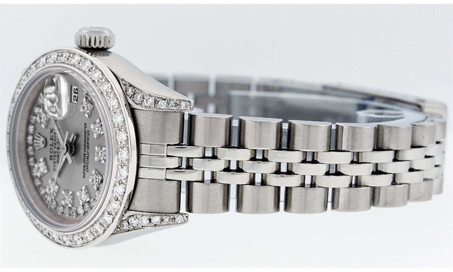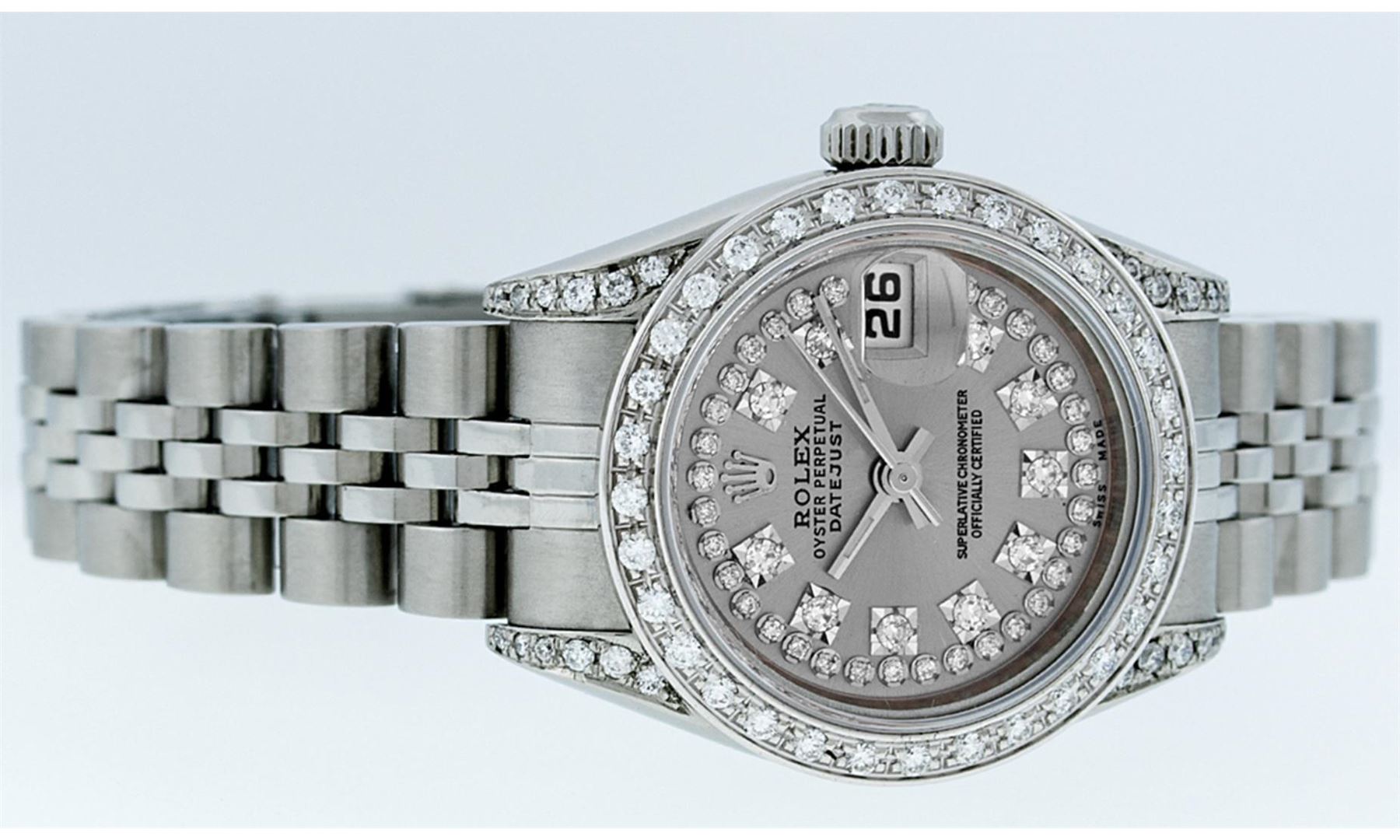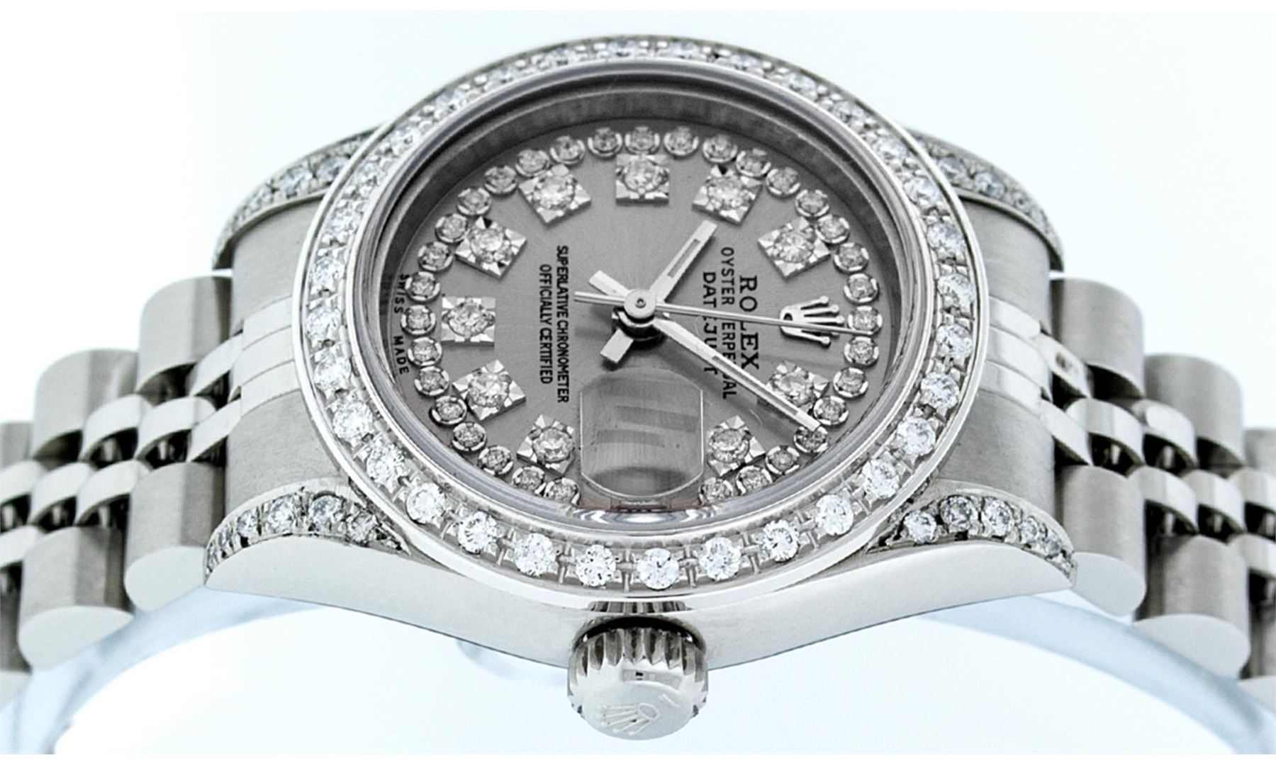 One Ladies Pre Owned Quickset Sapphire Stainless Steel Rolex Datejust Polished Bright with Satin Finish, Serviced And Electronically Tested, Stainless Steel Case: 26mm, Stainless Steel Crown, Custom Diamond Lugs: 24 Added Diamonds On Lugs. Custom Bezel: New 18K White Gold Beadset Diamond Bezel, Diamond Count: 32 Diamonds. Custom Crystal: New Sapphire With Date Window. Custom Hands: New Luminescent Hands. Rolex Movement: Automatic Quickset Winding Movement 2235. Custom Dial: Custom Grey Dial With Added Diamonds, 43 Diamonds On Dial. Date Window: 3 O'Clock Position Date Display, Model: Quickset Datejust. Condition: G-6 Extra Fine. Rolex Bracelet: Stainless Steel Jubilee Band. Bright Polish And Satin Finish. 6.0 Inch Length, Adjustable. Standard Clasp, With Rolex Logo. This Watch Has Been Serviced Time Tested And Is In Excellent Condition It Is Free Of All Scratches And Dents.